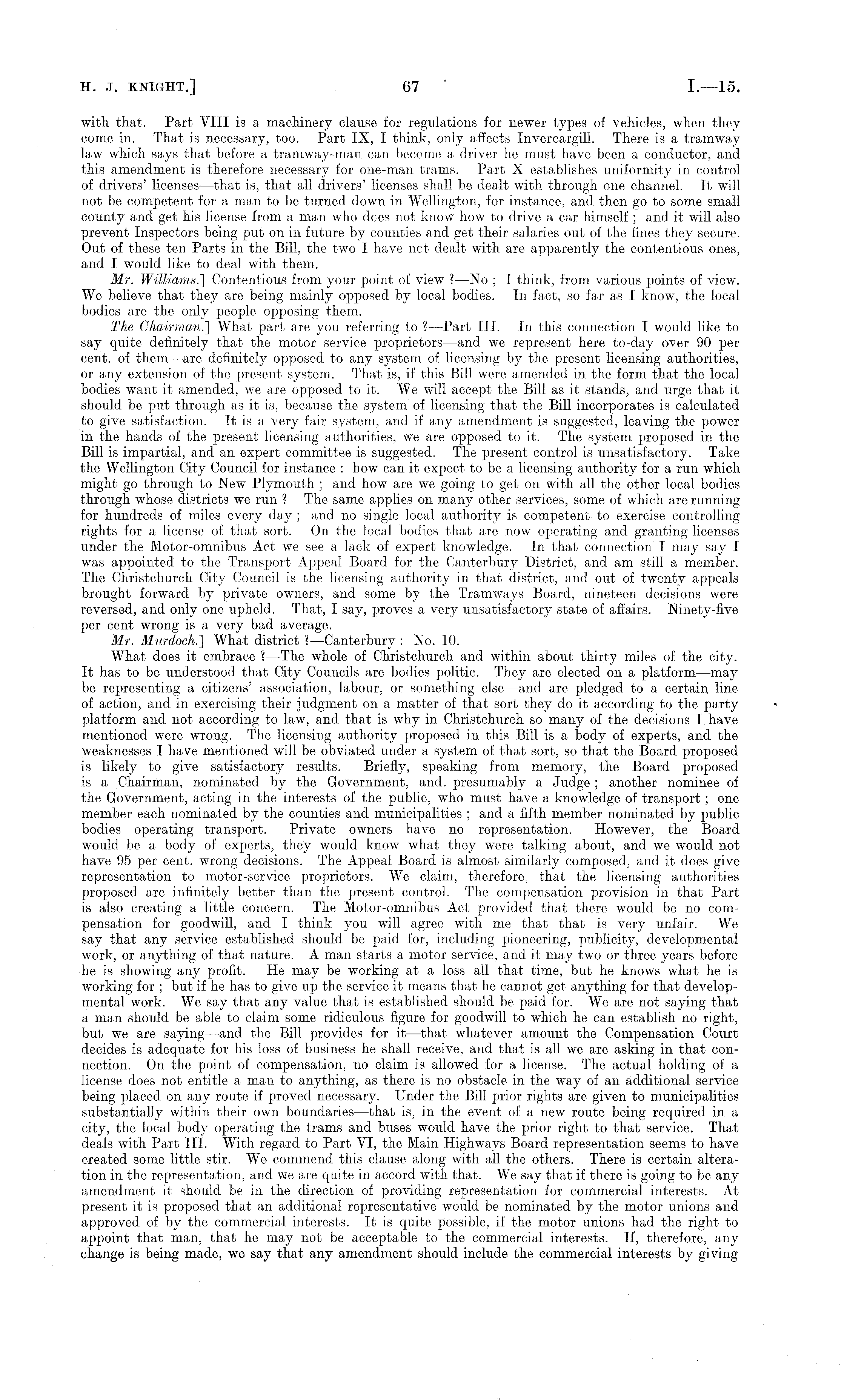 with that. Part VIII is a machinery clause for regulations for newer types of vehicles, when they come in. That is necessary, too. Part IX, I think, only affects Invercargill. There is a tramway law which says that before a tramway-man can become a driver he must have been a conductor, and this amendment is therefore necessary for one-man trams. Part X establishes uniformity in control of drivers' licenses —that is, that all drivers' licenses shall be dealt with through one channel. It will not be competent for a man to be turned down in Wellington, for instance, and then go to some small county and get his license from a man who dees not know how to drive a car himself ; and it will also prevent Inspectors being put on in future by counties and get their salaries out of the fines they secure. Out of these ten Parts in the Bill, the two I have net dealt with are apparently the contentious ones, and I would like to deal with them. Mr. Williams.'] Contentious from your point of view ?—No ; I think, from various points of view. We believe that they are being mainly opposed by local bodies. In fact, so far as I know, the local bodies are the only people opposing them. The Chairman.'] What part are you referring to ?—Part 111. In this connection I would like to say quite definitely that the motor service proprietors—and we represent here to-day over 90 per cent, of them—are definitely opposed to any system of licensing by the present licensing authorities, or any extension of the present system. That is, if this Bill were amended in the form that the local bodies want it amended, we are opposed to it. We will accept the Bill as it stands, and urge that it should be put through as it is, because the system of licensing that the Bill incorporates is calculated to give satisfaction. It is a very fair system, and if any amendment is suggested, leaving the power in the hands of the present licensing authorities, we are opposed to it. The system proposed in the Bill is impartial, and an expert committee is suggested. The present control is unsatisfactory. Take the Wellington City Council for instance : how can it expect to be a licensing authority for a run which might go through to New Plymouth ; and how are we going to get on with all the other local bodies through whose districts we run ? The same applies on many other services, some of which are running for hundreds of miles every day ; and no single local authority is competent to exercise controlling rights for a license of that sort. On the local bodies that are now operating and granting licenses under the Motor-omnibus Act we see a lack of expert knowledge. In that connection I may say I was appointed to the Transport Appeal Board for the Canterbury District, and am still a member. The Christchurch City Council is the licensing authority in that district, and out of twenty appeals brought forward by private owners, and some by the Tramways Board, nineteen decisions were reversed, and only one upheld. That, I say, proves a very unsatisfactory state of affairs. Ninety-five per cent wrong is a very bad average. Mr. Murdoch.] What district ? —Canterbury : No. 10. What does it embrace ?—The whole of Christchurch and within about thirty miles of the city. It has to be understood that City Councils are bodies politic. They are elected on a platform—may be representing a citizens' association, labour, or something else—and are pledged to a certain line of action, and in exercising their judgment on a matter of that sort they do it according to the party platform and not according to law, and that is why in Christchurch so many of the decisions I have mentioned were wrong. The licensing authority proposed in this Bill is a body of experts, and the weaknesses I have mentioned will be obviated under a system of that sort, so that the Board proposed is likely to give satisfactory results. Briefly, speaking from memory, the Board proposed is a Chairman, nominated by the Government, and presumably a Judge; another nominee of the Government, acting in the interests of the public, who must have a knowledge of transport; one member each nominated by the counties and municipalities ; and a fifth member nominated by public bodies operating transport. Private owners have no representation. However, the Board would be a body of experts, they would know what they were talking about, and we would not have 95 per cent, wrong decisions. The Appeal Board is almost similarly composed, and it does give representation to motor-service proprietors. We claim, therefore, that the licensing authorities proposed are infinitely better than the present control. The compensation provision in that Part is also creating a little concern. The Motor-omnibus Act provided that there would be no compensation for goodwill, and I think you will agree with me that that is very unfair. We say that any service established should be paid for, including pioneering, publicity, developmental work, or anything of that nature. A man starts a motor service, and it may two or three years before he is showing any profit. He may be working at a loss all that time, but he knows what he is working for ; but if he has to give up the service it means that he cannot get anything for that developmental work. We say that any value that is established should be paid for. We are not saying that a man should be able to claim some ridiculous figure for goodwill to which he can establish no right, but we are saying—and the Bill provides for it—that whatever amount the Compensation Court decides is adequate for his loss of business he shall receive, and that is all we are asking in that connection. On the point of compensation, no claim is allowed for a license. The actual holding of a license does not entitle a man to anything, as there is no obstacle in the way of an additional service being placed on any route if proved necessary. Under the Bill prior rights are given to municipalities