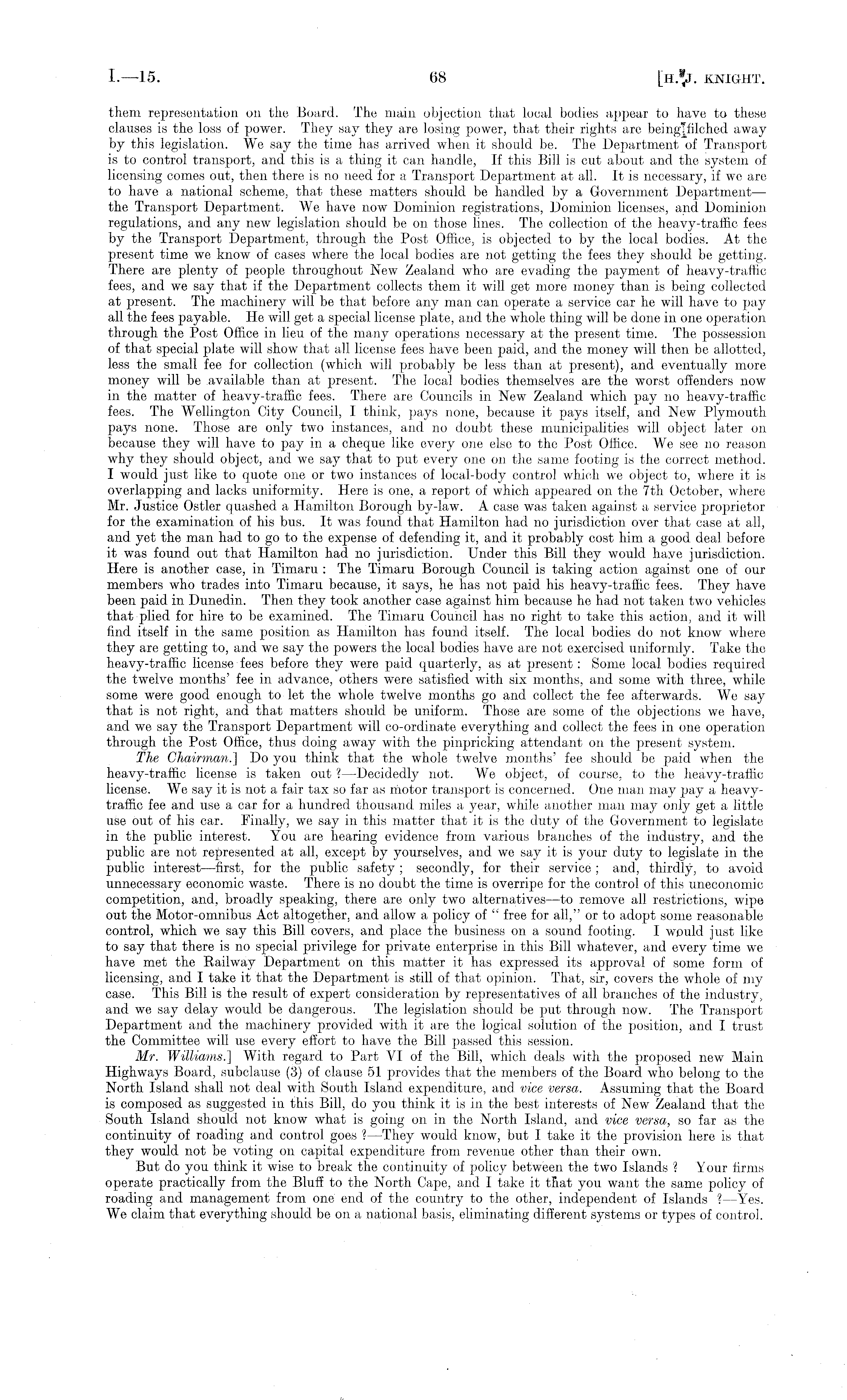 them representation oil the Board. The main objection that local bodies appear to have to these clauses is the loss of power. They say they are losing power, that their rights are being|filched away by this legislation. We say the time has arrived when it should be. The Department of Transport is to control transport, and this is a tiling it can handle, If this Bill is cut about and the system of licensing comes out, then there is no need for a Transport Department at all. It is necessary, if we are to have a national scheme, that these matters should be handled by a Government Department — the Transport Department. We have now Dominion registrations, Dominion licenses, and Dominion regulations, and any new legislation should be on those lines. The collection of the heavy-traffic fees by the Transport Department, through the Post Office, is objected to by the local bodies. At the present time we know of cases where the local bodies are not getting the fees they should be getting. There are plenty of people throughout New Zealand who are evading the payment of heavy-traffic fees, and we say that if the Department collects them it will get more money than is being collected at present. The machinery will be that before any man can operate a service car he will have to pay all the fees payable. He will get a special license plate, and the whole thing will be done in one operation through the Post Office in lieu of the many operations necessary at the present time. The possession of that special plate will show that all license fees have been paid, and the money will then be allotted, less the small fee for collection (which will probably be less than at present), and eventually more money will be available than at present. The local bodies themselves are the worst offenders now in the matter of heavy-traffic fees. There are Councils in New Zealand which pay no heavy-traffic fees. The Wellington City Council, I think, pays none, because it pays itself, and New Plymouth pays none. Those are only two instances, and 110 doubt these municipalities will object later on because they will have to pay in a cheque like every one else to the Post Office. We see no reason why they should object, and we say that to put every one on the same footing is the correct method. I would just like to quote one or two instances of local-body control which we object to, where it is overlapping and lacks uniformity. Here is one, a report of which appeared on the 7th October, where Mr. Justice Ostler quashed a Hamilton Borough by-law. A case was taken against a service proprietor for the examination of his bus. It was found that Hamilton had no jurisdiction over that case at all, and yet the man had to go to the expense of defending it, and it probably cost him a good deal before it was found out that Hamilton had no jurisdiction. Under this Bill they would have jurisdiction. Here is another case, in Timaru : The Timaru Borough Council is taking action against one of our members who trades into Timaru because, it says, he has not paid his heavy-traffic fees. They have been paid in Dunedin. Then they took another case against him because he had not taken two vehicles that plied for hire to be examined. The Timaru Council has no right to take this action, and it will find itself in the same position as Hamilton has found itself. The local bodies do not know where they are getting to, and we say the powers the local bodies have are not exercised uniformly. Take the heavy-traffic license fees before they were paid quarterly, as at present: Some local bodies required the twelve months' fee in advance, others were satisfied with six months, and some with three, while some were good enough to let the whole twelve months go and collect the fee afterwards. We say that is not right, and that matters should be uniform. Those are some of the objections we have, and we say the Transport Department will co-ordinate everything and collect the fees in one operation through the Post Office, thus doing away with the pinpricking attendant on the present system. The Chairman.'] Do you think that the whole twelve months' fee should be paid when the heavy-traffic license is taken out ?—Decidedly not. We object, of course, to the heavy-traffic license. We say it is not a fair tax so far as motor transport is concerned. One man may pay a heavytraffic fee and use a car for a hundred thousand miles a year, while another man may only get a little use out of his car. Finally, we say in this matter that it is the duty of the Government to legislate in the public interest. You are hearing evidence from various branches of the industry, and the public are not represented at all, except by yourselves, and we say it is your duty to legislate in the public interest —first, for the public safety ; secondly, for their service ; and, thirdly, to avoid unnecessary economic waste. There is no doubt the time is overripe for the control of this uneconomic competition, and, broadly speaking, there are only two alternatives —to remove all restrictions, wipe out the Motor-omnibus Act altogether, and allow a policy of " free for all," or to adopt some reasonable control, which we say this Bill covers, and place the business on a sound footing. I would just like to say that there is no special privilege for private enterprise in this Bill whatever, and every time we have met the Railway Department on this matter it has expressed its approval of some form of licensing, and I take it that the Department is still of that opinion. That, sir, covers the whole of my case. This Bill is the result of expert consideration by representatives of all branches of the industry, and we say delay would be dangerous. The legislation should be put through now. The Transport Department and the machinery provided with it are the logical solution of the position, and I trust the Committee will use every effort to have the Bill passed this session. Mr. Williams.] With regard