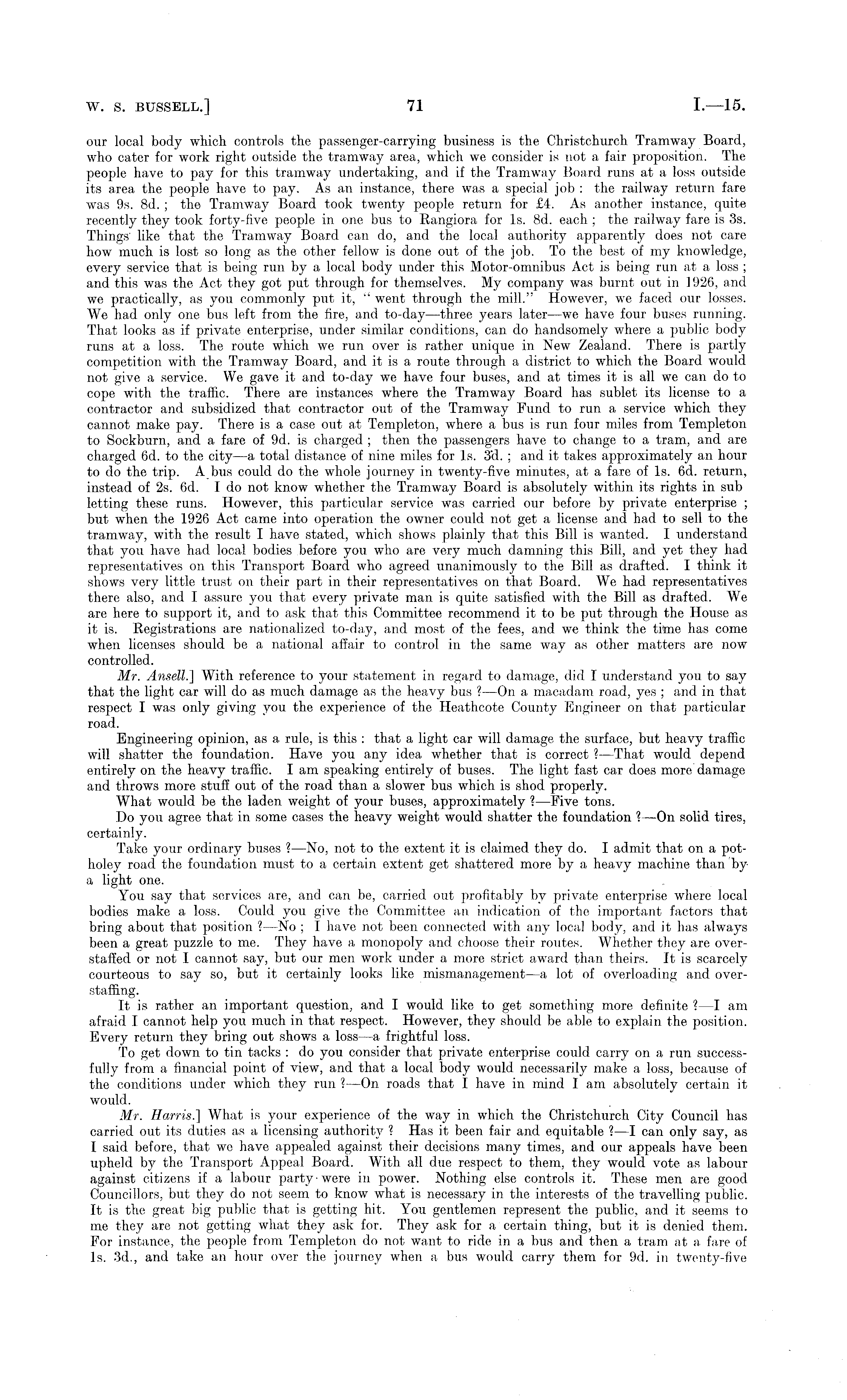 our local body which controls the passenger-carrying business is the Christchurch Tramway Board, who cater for work right outside the tramway area, which we consider is not a fair proposition. The people have to pay for this tramway undertaking, and if the Tramway Board runs at a loss outside its area the people have to pay. As an instance, there was a special job : the railway return fare was 9s. Bd. ; the Tramway Board took twenty people return for £4. As another instance, quite recently they took forty-five people in one bus to Bangiora for Is. Bd. each ; the railway fare is 3s. Things' like that the Tramway Board can do, and the local authority apparently does not care how much is lost so long as the other fellow is done out of the job. To the best of my knowledge, every service that is being run by a local body under this Motor-omnibus Act is being run at a loss ; and this was the Act they got put through for themselves. My company was burnt out in 1926, and we practically, as you commonly put it, " went through the mill." However, we faced our losses. We had only one bus left from the fire, and to-day —three years later —we have four buses running. That looks as if private enterprise, under similar conditions, can do handsomely where a public body runs at a loss. The route which we run over is rather unique in New Zealand. There is partly competition with the Tramway Board, and it is a route through a district to which the Board would not give a service. We gave it and to-day we have four buses, and at times it is all we can do to cope with the traffic. There are instances where the Tramway Board has sublet its license to a contractor and subsidized that contractor out of the Tramway Fund to run a service which they cannot make pay. There is a case out at Templeton, where a bus is run four miles from Templeton to Sockburn, and a fare of 9d. is charged ; then the passengers have to change to a tram, and are charged 6d. to the city—a total distance of nine miles for Is. 3'd. ; and it takes approximately an hour to do the trip. A bus could do the whole journey in twenty-five minutes, at a fare of Is. 6d. return, instead of 2s. 6d. Ido not know whether the Tramway Board is absolutely within its rights in sub letting these runs. However, this particular service was carried our before by private enterprise ; but when the 1926 Act came into operation the owner could not get a license and had to sell to the tramway, with the result I have stated, which shows plainly that this Bill is wanted. I understand that you have had local bodies before you who are very much damning this Bill, and yet they had representatives on this Transport Board who agreed unanimously to the Bill as drafted. I think it shows very little trust on their part in their representatives on that Board. We had representatives there also, and I assure you that every private man is quite satisfied with the Bill as drafted. We are here to support it, and to ask that this Committee recommend it to be put through the House as it is. Begistrations are nationalized to-day, and most of the fees, and we think the time has come when licenses should be a national affair to control in the same way as other matters are now controlled. Mr. Ansell.] With reference to your statement in regard to damage, did I understand you to say that the light car will do as much damage as the heavy bus ?—On a macadam road, yes ; and in that respect I was only giving you the experience of the Heathcote County Engineer on that particular road. Engineering opinion, as a rule, is this : that a light car will damage the surface, but heavy traffic will shatter the foundation. Have you any idea whether that is correct ? —That would depend entirely on the heavy traffic. lam speaking entirely of buses. The light fast car does more damage and throws more stuff out of the road than a slower bus which is shod properly. What would be the laden weight of your buses, approximately ? —Five tons. Do you agree that in some cases the heavy weight would shatter the foundation I—On solid tires, certainly. Take your ordinary buses ? —No, not to the extent it is claimed they do. I admit that on a potholey road the foundation must to a certain extent get shattered more by a heavy machine than by a light one. You say that services are, and can be, carried out profitably by private enterprise where local bodies make a loss. Could you give the Committee an indication of the important factors that bring about that position ? —No ; I have not been connected with any local body, and it has always been a great puzzle to me. They have a monopoly and choose their routes. Whether they are overstaffed or not I cannot say, but our men work under a more strict award than theirs. It is scarcely courteous to say so, but it certainly looks like mismanagement—a lot of overloading and overstaffing. It is rather an important question, and I would like to get something more definite ? —I am afraid I cannot help you much in that respect. However, they should be able to explain the position. Every return they bring out shows a loss—a frightful loss. To get down to tin tacks : do you consider that private enterprise could carry on a run successfully from a financial point of view, and that a local body would necessarily make a loss, because of the conditions under which they run ?—On roads that I have in mind I am absolutely certain it would. Mr. Harris.'] What is your experience of the way in which the Christchurch City Council has carried out its duties as a licensing authority ? Has it been fair and equitable ? —I can only say, as I said before, that we have appealed against their decisions many times, and our appeals have been upheld by the Transport Appeal Board. W T ith all due respect to them, they would vote as labour against citizens if a labour party were in power. Nothing else controls it. These men are good Councillors, but they do not seem to know what is 