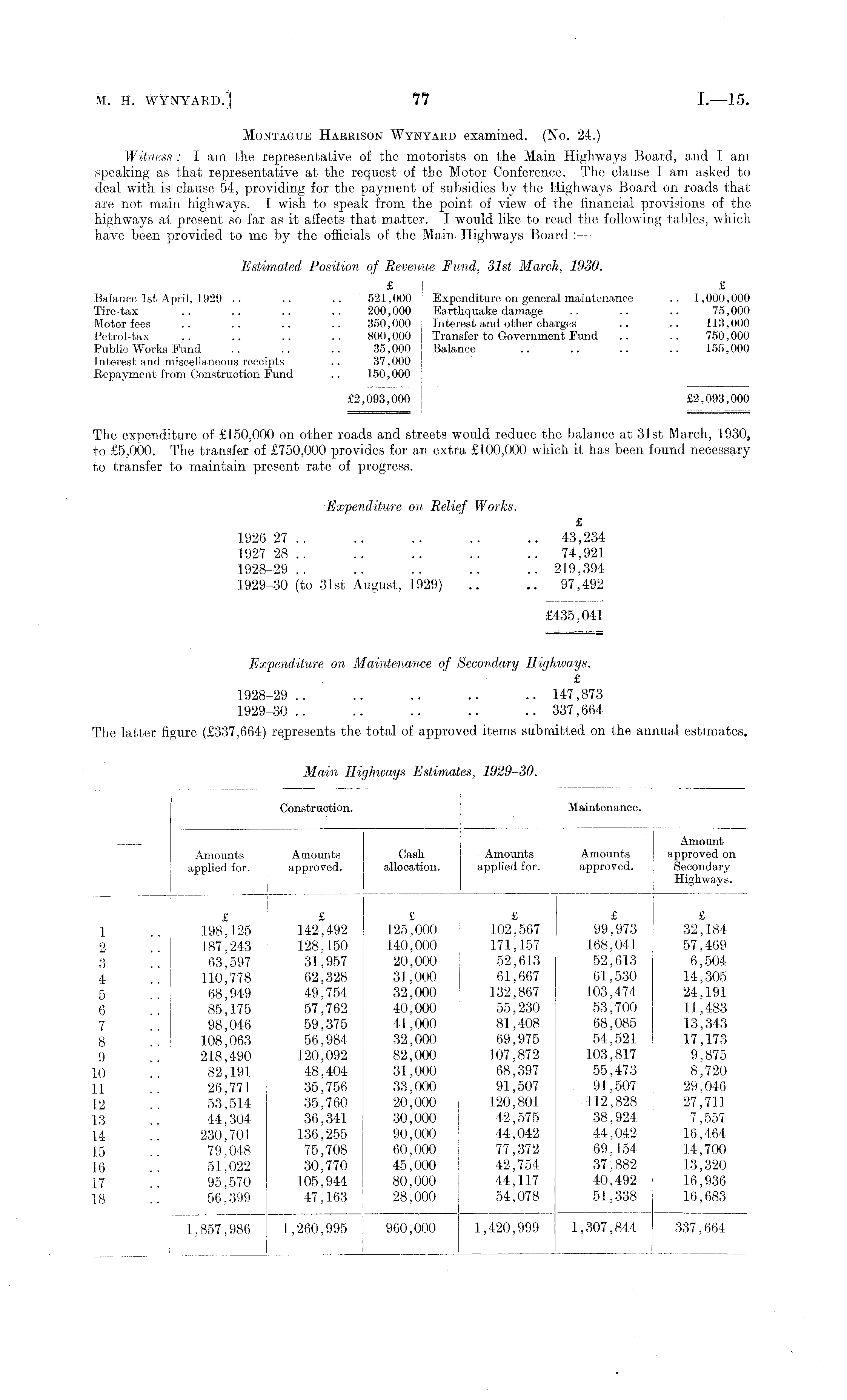Montague Harbison Wynyard examined. (No. 24.) Witness : I am the representative of the motorists on the Main Highways Board, and I am speaking as that representative at the request of the Motor Conference. The clause lam asked to deal with is clause 54, providing for the payment of subsidies by the Highways Board on roads that are not main highways. I wish to speak from the point of view of the financial provisions of the highways at present so far as it affects that matter. I would like to read the following tables, which have been provided to me by the officials of the Main Highways Board : — Estimated Position of Revenue Fund, 31st March, 1930. £ £ Balance Ist April, 1929 .. .. .. 521,000 Expenditure on general maintenance .. 1,000,000 Tire-tax .. .. .. .. 200,000 Earthquake damage .. .. .. 75,000 Motor fees .. .. .. .. 350,000 Interest and other charges .. .. 113,000 Petrol-tax .. .. .. .. 800,000 Transfer to Government Fund .. .. 750,000 Public Works Fund .. .. .. 35,000 Balance .. .. .. .. 155,000 Interest and miscellaneous receipts .. 37,000 Repayment from Construction Fund .. 150,000 £2,093,000 £2,093,000 The expenditure of £150,000 on other roads and streets would reduce the balance at 31st March, 1930, to £5,000. The transfer of £750,000 provides for an extra £100,000 which it has been found necessary to transfer to maintain present rate of progress. Expenditure on Relief Works. £ 1926-27 .. .. .. .. .. 43,234 1927-28 .. .. .. .. .. 74,921 1928-29 .. .. .. .. .. 219,394 1929-30 (to 31st August, 1929) .. .. 97,492 £435,041 Expenditure on Maintenance of Secondary Highways. £ 1928-29 .. .. .. .. .. 147,873 1929-30.. .. .. .. .. 337,664 The latter figure (£337,664) rqpresents the. total of approved items submitted on the annual estimates.
