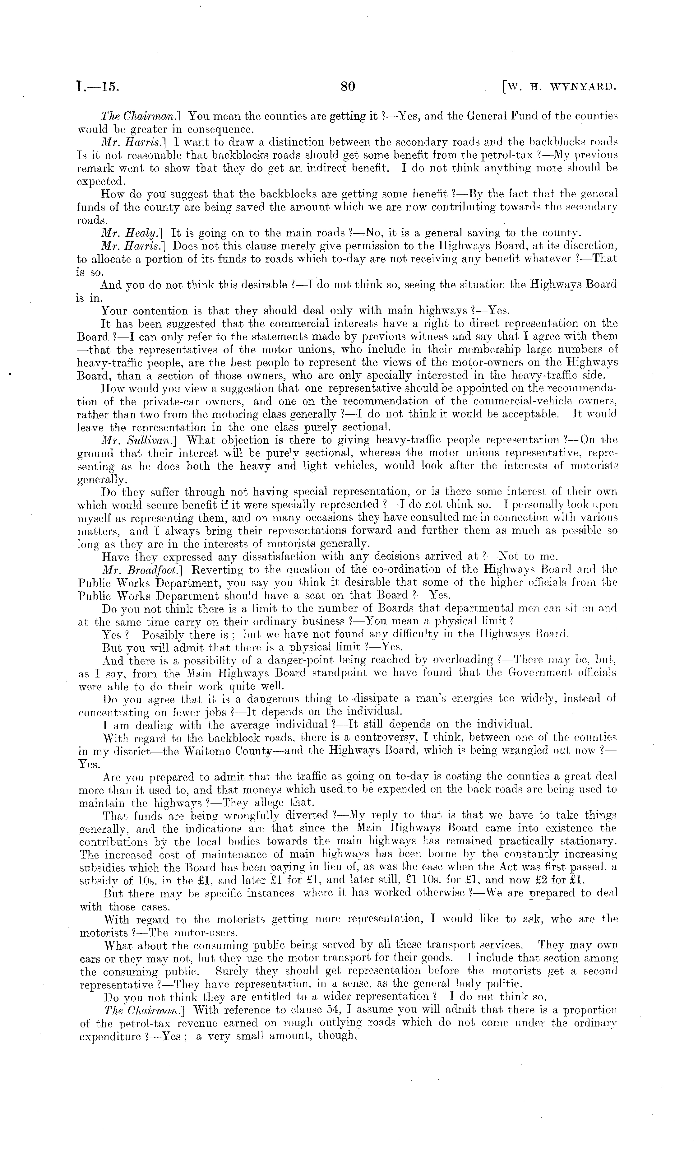 The Chairman.] You mean the counties are getting it ?—Yes, and the General Fund of the counties would be greater in consequence. Mr. Harris.] I want to draw a distinction between the secondary roads and the backblocks roads Is it not reasonable that backblocks roads should get some benefit from the petrol-tax ?—My previous remark went to show that they do get an indirect benefit. Ido not think anything more should be expected. How do you' suggest that the backblocks are getting some benefit ?—By the fact that the general funds of the county are being saved the amount which we are now contributing towards the secondary roads. Mr. Healy.\ It is going on to the main roads ? —-No, it is a general saving to the county. Mr. Harris.] Does not this clause merely give permission to the Highways Board, at its discretion, to allocate a portion of its funds to roads which to-day are not receiving any benefit whatever ?—That is so. And you do not think this desirable ? —I do not think so, seeing the situation the Highways Board is in. Your contention is that they should deal only with main highways ?—Yes. It has been suggested that the commercial interests have a right to direct representation on the Board ?—I can only refer to the statements made by previous witness and say that I agree with them —that the representatives of the motor unions, who include in their membership large numbers of heavy-traffic people, are the best people to represent the views of the motor-owners on the Highways Board, than a section of those owners, who are only specially interested in the heavy-traffic side. How would you view a suggestion that one representative should be appointed on the recommendation of the private-car owners, and one on the recommendation of the commercial-vehicle owners, rather than two from the motoring class generally ?—I do not think it would be acceptable. It would leave the representation in the one class purely sectional. Mr. Sullivan.] What objection is there to giving heavy-traffic people representation ?—On the ground that their interest will be purely sectional, whereas the motor unions representative, representing as he does both the heavy and light, vehicles, would look after the interests of motorists generally. Do they suffer through not having special representation, or is there some interest of their own which would secure benefit if it were specially represented ? —I do not think so. I personally look upon myself as representing them, and on many occasions they have consulted me in connection with various matters, and I always bring their representations forward and further them as much as possible so long as they are in the interests of motorists generally. Have they expressed any dissatisfaction with any decisions arrived at ? —Not to me. Mr. Broadfoot..\ Reverting to the question of the co-ordination of the Highways Board and the Public Works Department, you say you think it desirable that some of the higher officials from the Public Works Department should have a seat on that Board ? —Yes. Do you not think there is a limit to the number of Boards that departmental men can sit on and at the same time carry on their ordinary business ? —You mean a physical limit ? Yes ? —Possibly there is ; but we have not found any difficulty in the Highways Board. But you will admit that there is a physical limit ?—-Yes. And there is a possibility of a danger-point being reached by overloading ?—There may be, but, as I say, from the Main Highways Board standpoint we have found that the Government officials were able to do their work quite well. Do you agree that it is a dangerous thing to dissipate a man's energies too widely, instead of concentrating on fewer jobs ? —lt depends on the individual. I am dealing with the average individual ? —lt still depends on the individual. With regard to the backblock roads, there is a controversy, I think, between one of the counties in my district —the Waitomo County—and the Highways Board, which is being wrangled out now ? — Yes.' Are you prepared to admit that the traffic as going on to-day is costing the counties a great deal more than it used to, and that moneys which used to be expended on the back roads a-re being used to maintain the highways ?—They allege that. That funds are being wrongfully diverted ?—My reply to that is that we have to take things generally, and the indications are that since the Main Highways Board came into existence the contributions bv the local bodies towards the main highways has remained practically stationary. The increased cost of maintenance of main highways has been borne by the constantly increasing subsidies which the Board has been paying in lieu of, as was the case when the Act was first passed, a subsidy of 10s. in the £1, and later £1 for £1, and later still, £1 10s. for £1, and now £2 for £1. But there may be specific instances where it has worked otherwise ?—We are prepared to deal with those cases. With regard to the motorists getting more representation, I would like to ask, who are the motorists ? —The motor-users. What about the consuming public being served by all these transport services. They may own cars or they may not, but they use the motor transport for their goods. I include that section among the consuming public. Surely they should get representation before the motorists get a second representative ? —They have representation, in a sense, as the general body politic. Do you not think they are entitled to a wider representation ?—I do not think so. The Chairman.] With reference to clause 54, I assume you will admit that there is a proportion of the petrol-tax revenue earned on rough outlying roads which do not come under the ordinary expenditure ? —Yes ; a very small amount, though.