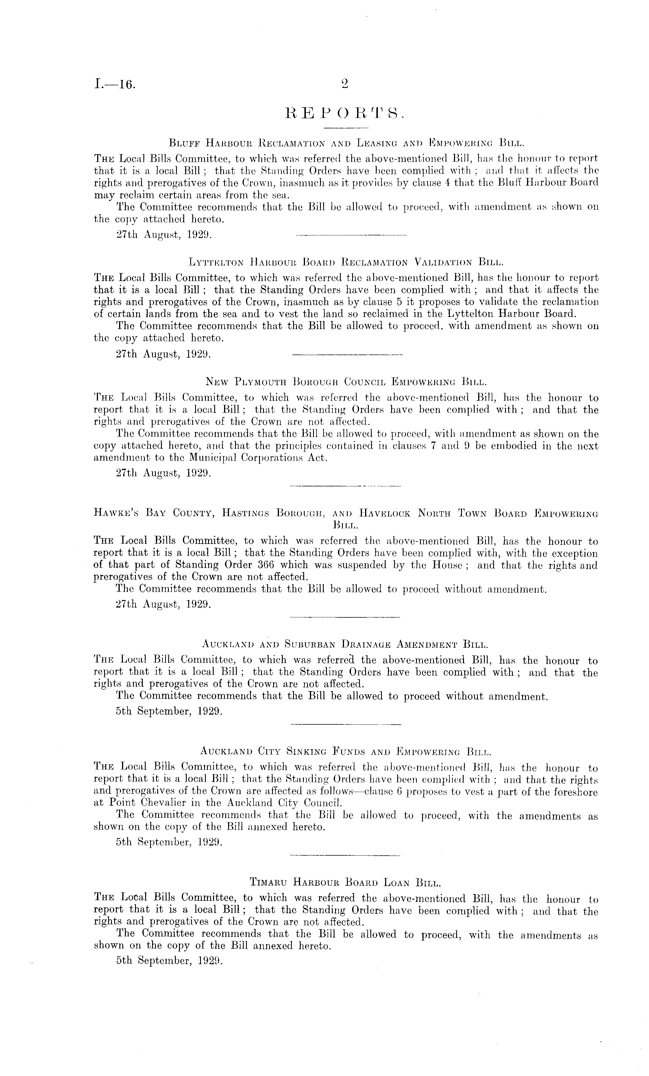 Lyttelton Harbour Board Reclamation Validation Bill. The Local Bills Committee, to which was referred the above-mentioned Bill, has the honour to report that it is a local Bill ; that the Standing Orders have been complied with ; and that it affects the rights and prerogatives of the Crown, inasmuch as by clause 5 it proposes to validate the reclamation of certain lands from the sea and to vest the land so reclaimed in the Lyttelton Harbour Board. The Committee recommends that the Bill be allowed to proceed, with amendment as shown on the copy attached hereto. 27th August, 1929.