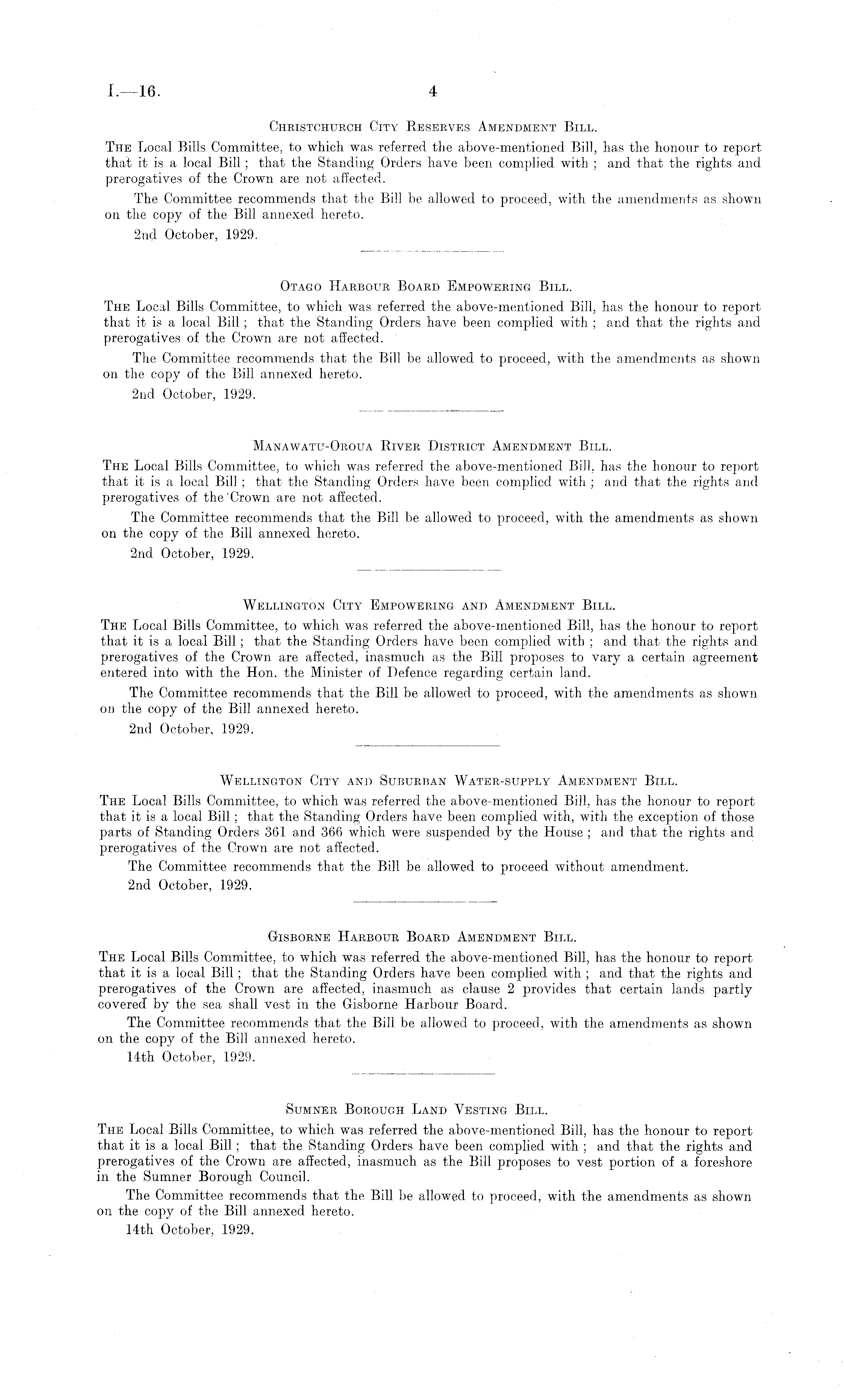 Christchurch City Reserves Amendment Bill. The Local Bills Committee, to which was referred the above-mentioned Bill, has the honour to report that it is a local Bill ; that the Standing Orders have been complied with ; and that the rights and prerogatives of the Crown are not affected. The Committee recommends that the Bill be allowed to proceed, with the amendments as shown on the copy of the Bill annexed hereto. 2nd October, 1929.