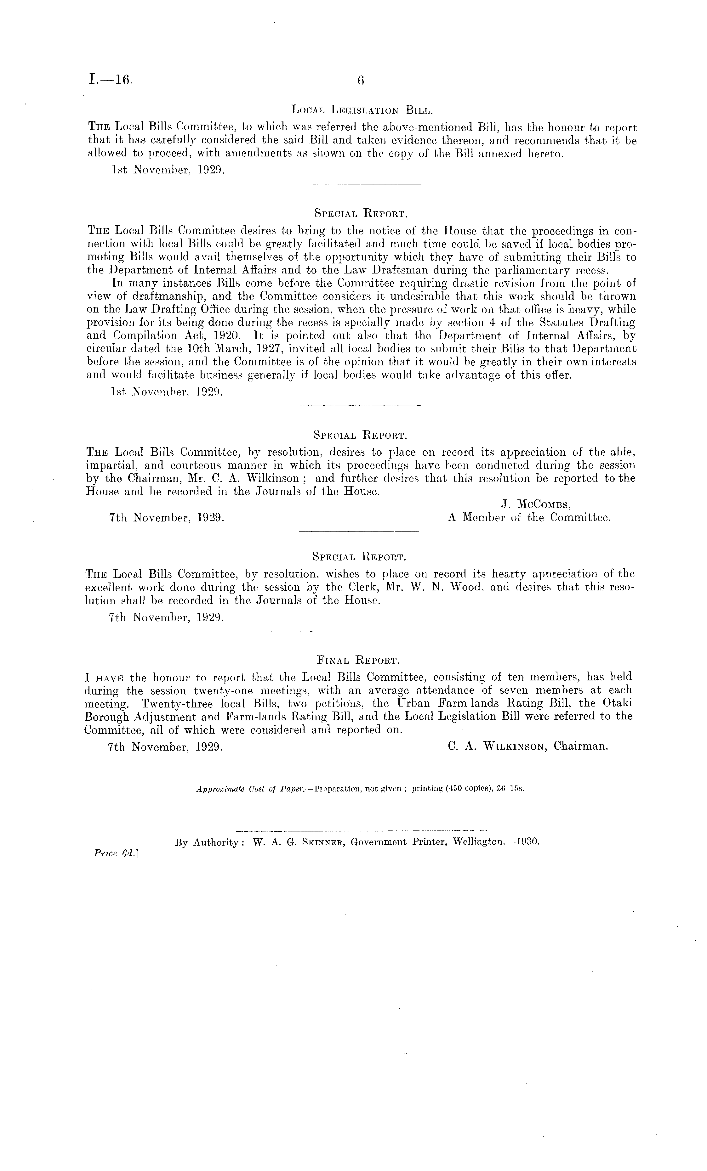 Special Report. The Local Bills Committee, by resolution, desires to place on record its appreciation of the able, impartial, and courteous manner in which its proceedings have been conducted during the session by the Chairman, Mr. C. A. Wilkinson ; and further desires that this resolution be reported to the House and be recorded in the Journals of the House. J, McCombs, 7th November, 1929. A Member of the Committee.