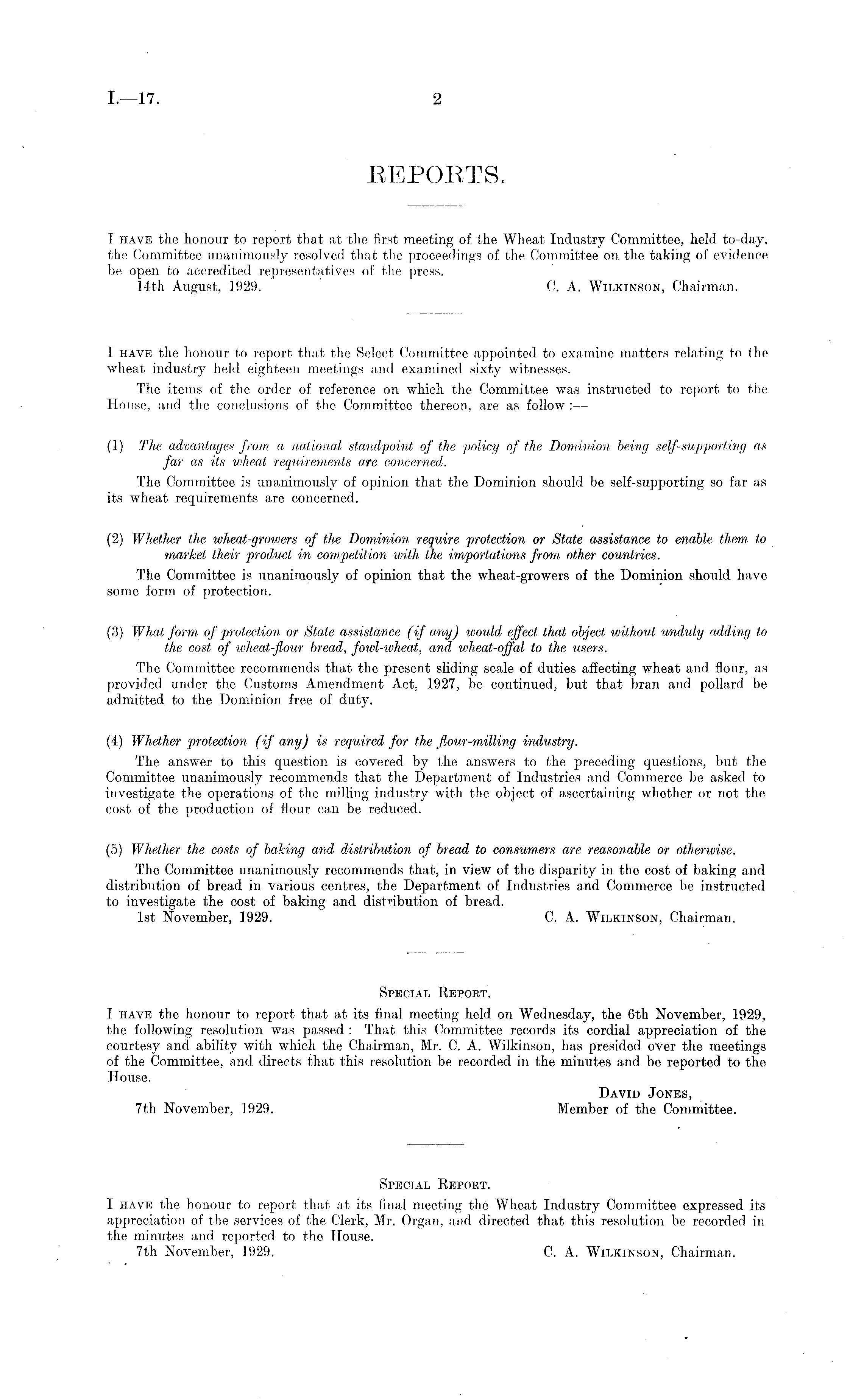 I have the honour to report that the Select Committee appointed to examine matters relating to the wheat industry held eighteen meetings and examined sixty witnesses. The items of the order of reference on which the Committee was instructed to report to the House, and the conclusions of the Committee thereon, are as follow : — (1) The advantages from a national stand-point of the policy of the Dominion being self-supporting as far as its wheat requirements are concerned. The Committee is unanimously of opinion that the Dominion should be self-supporting so far as its wheat requirements are concerned. (2) Whether the wheat-growers of the Dominion require protection or State assistance to enable them to market their product in competition ivith the importations from other countries. The Committee is unanimously of opinion that the wheat-growers of the Dominion should have some form of protection. (3) What form of protection or State assistance (if any) would effect that object without unduly adding to the cost of wheat-flour bread, fowl-wheat, and wheat-offal to the users. The Committee recommends that the present sliding scale of duties affecting wheat and flour, as provided under the Customs Amendment Act, 1927, be continued, but that bran and pollard be admitted to the Dominion free of duty. (4) Whether protection (if any) is required for the flour-milling industry. The answer to this question is covered by the answers to the preceding questions, but the Committee unanimously recommends that the Department of Industries and Commerce be asked to investigate the operations of the milling industry with the object of ascertaining whether or not the cost of the production of flour can be reduced. (5) Whether the costs of baking and distribution of bread to consumers are reasonable or otherwise. The Committee unanimously recommends that, in view of the disparity in the cost of baking and distribution of bread in various centres, the Department of Industries and Commerce be instructed to investigate the cost of baking and distribution of bread. Ist November, 1929. C. A. Wilkinson, Chairman.