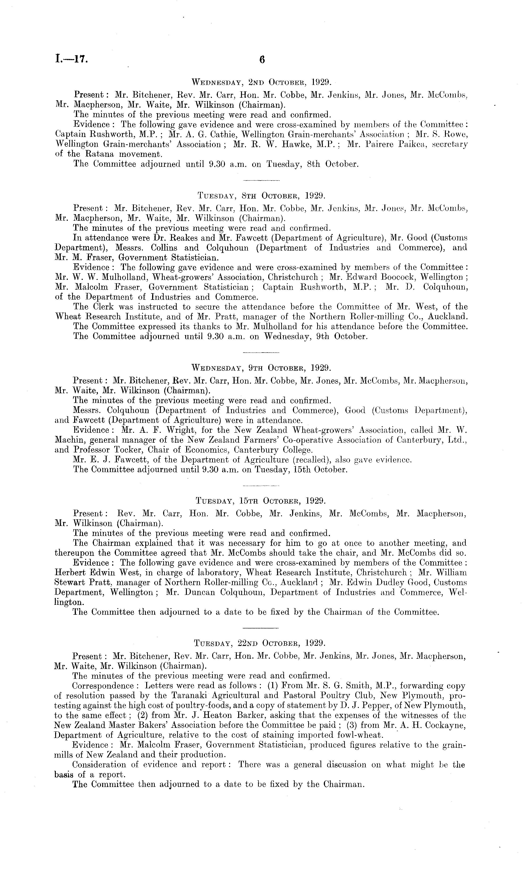 Wednesday, 2nd October, 1929. Present: Mr. Bitchener, Rev. Mr. Carr, Hon. Mr. Cobbe, Mr. Jenkins, Mr. Jones, Mr. McCombs. Mr. Macpherson, Mr. Waite, Mr. Wilkinson (Chairman). The minutes of the previous meeting were read and confirmed. Evidence : The following gave evidence and were cross-examined by members of the Committee: Captain Rushworth, M.P. ; Mr. A. 6. Cathie, Wellington Grain-merchants' Association ; Mr. S. Rowe, Wellington Grain-merchants' Association ; Mr. R. W. Hawke, M.P. ; Mr. Pairere Paikea, secretary of the Ratana movement. The Committee adjourned until 9.30 a.m. on Tuesday, Bth October. Tuesday, Bth October, 1929. Present: Mr. Bitchener, Rev. Mr. Carr, Hon. Mr. Cobbe, Mr. Jenkins, Mr. Jones, Mr. McCombs, Mr. Macpherson, Mr. Waite, Mr. Wilkinson (Chairman). The minutes of the previous meeting were read and confirmed. In attendance were Dr. Reakes and Mr. Fawcett (Department of Agriculture), Mr. Good (Customs Department), Messrs. Collins and Colquhoun (Department of Industries and Commerce), and Mr. M. Fraser, Government Statistician. Evidence : The following gave evidence and were cross-examined by members of the Committee : Mr. W. W. Mulholland, Wheat-growers' Association, Christchurch ; Mr. Edward Boocock, Wellington ; Mr. Malcolm Fraser, Government Statistician ; Captain Rushworth, M.P. ; Mr. D. Colquhoun, of the Department of Industries and Commerce. The Clerk was instructed to secure the attendance before the Committee of Mr. West, of the Wheat Besearch Institute, and of Mr. Pratt, manager of the Northern Roller-milling Co., Auckland. The Committee expressed its thanks to Mr. Mulholland for his attendance before the Committee. The Committee adjourned until 9.30 a.m. on Wednesday, 9th October. Wednesday, 9th October, 1929. Present: Mr. Bitchener, Rev. Mr. Carr, Hon. Mr. Cobbe, Mr. Jones, Mr. McCombs, Mr. Macpherson, Mr. Waite, Mr. Wilkinson (Chairman). The minutes of the previous meeting were read and confirmed. Messrs. Colquhoun (Department of Industries and Commerce), Good (Customs Department), and Fawcett (Department of Agriculture) were in attendance. Evidence : Mr. A. F. Wright, for the New Zealand Wheat-growers' Association, called Mr. W. Machin, general manager of the New Zealand Farmers' Co-operative Association of Canterbury, Ltd., and Professor Tocker, Chair of Economics, Canterbury College. Mr. E. J. Fawcett, of the Department of Agriculture (recalled), also gave evidence. The Committee adjourned until 9.30 a.m. on Tuesday, 15th October. Tuesday, 15th October, 1929. Present: Rev. Mr. Carr, Hon. Mr. Cobbe, Mr. Jenkins, Mr. McCombs, Mr. Macpherson, Mr. Wilkinson (Chairman). The minutes of the previous meeting were read and confirmed. The Chairman explained that it was necessary for him to go at once to another meeting, and thereupon the Committee agreed that Mr. McCombs should take the chair, and Mr. McCombs did so. Evidence : The following gave evidence and were cross-examined by members of the Committee : Herbert Edwin West, in charge of laboratory, Wheat Research Institute, Christchurch ; Mr. William Stewart Pratt, manager of Northern Roller-milling Co., Auckland ; Mr. Edwin Dudley Good, Customs Department, Wellington ; Mr. Duncan Colquhoun, Department of Industries and Commerce, Wellington. The Committee then adjourned to a date to be fixed by the Chairman of the Committee. Tuesday, 22nd October, 1929. Present : Mr. Bitchener, Rev. Mr. Carr, Hon. Mr. Cobbe, Mr. Jenkins, Mr. Jones, Mr. Macpherson, Mr. Waite, Mr. Wilkinson (Chairman). The minutes of the previous meeting were read and confirmed. Correspondence : Letters were read as follows : (1) From Mr. S. G. Smith, M.P., forwarding copy of resolution passed by the Taranaki Agricultural and Pastoral Poultry Club, New Plymouth, protesting against the high cost of poultry-foods, and a copy of statement by D. J. Pepper, of New Plymouth, to the same effect; (2) from Mr. J. Heaton Barker, asking that the expenses of the witnesses of the New Zealand Master Bakers' Association before the Committee be paid ; (3) from Mr. A. H. Cockayne, Department of Agriculture, relative to the cost of staining imported fowl-wheat. Evidence : Mr. Malcolm Fraser, Government Statistician, produced figures relative to the grainmills of New Zealand and their production. Consideration of evidence and report: There was a general discussion on what might be the basis of a report. The Committee then adjourned to a date to be fixed by the Chairman.