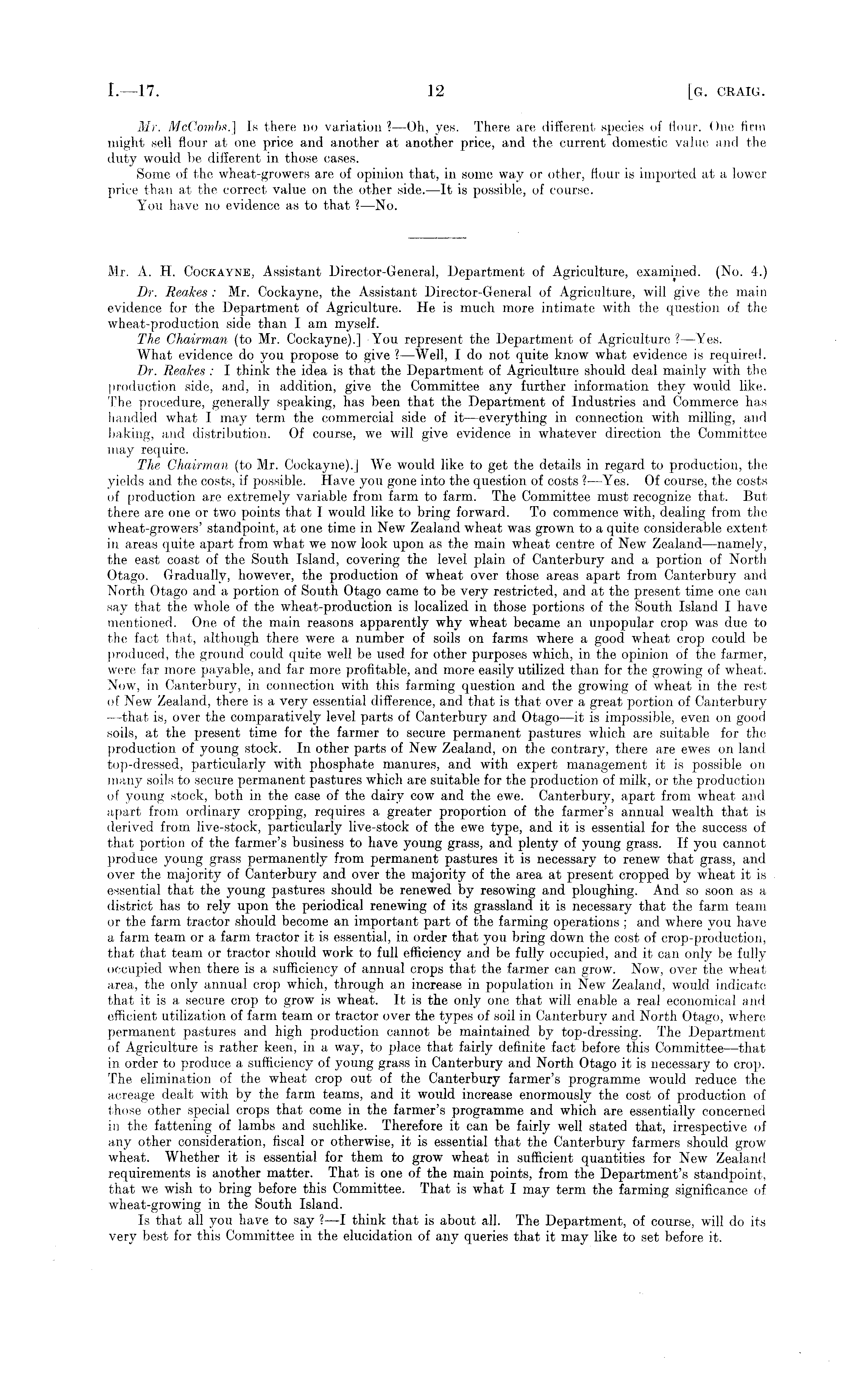 Mr. McCombs.\ Is there do variation ?—Oh, yes. There are different species of iiour. One firm might sell flour at one price and another at another price, and the current domestic value and the duty would be different in those cases. Some of the wheat-growers are of opinion that, in some way or other, flour is imported at a lower price than at the correct value on the other side.—lt is possible, of course. You have no evidence as to that ?—No. Mr. A. H. Cockayne, Assistant Director-General, Department of Agriculture, examined. (No. 4.) Dr. Reakes : Mr. Cockayne, the Assistant Director-General of Agriculture, will give the main evidence for the Department of Agriculture. He is much more intimate with the question of the wheat-production side than I am myself. The Chairman (to Mr. Cockayne).] You represent the Department of Agriculture ?—Yes. What evidence do you propose to give ? —Well, I do not quite know what evidence is required. Dr. Reakes : I think the idea is that the Department of Agriculture should deal mainly with the production side, a-nd, in addition, give the Committee any further information they would like. The procedure, generally speaking, has been that the Department of Industries and Commerce has handled what I may term the commercial side of it—everything in connection with milling, and baking, and distribution. Of course, we will give evidence in whatever direction the Committee may require. The Chairman (to Mr. Cockayne).] We would like to get the details in regard to production, the yields and the costs, if possible. Ha ve you gone into the question of costs ? —Yes. Of course, the costs of production are extremely variable from farm to farm. The Committee must recognize that. But there are one or two points that I would like to bring forward. To commence with, dealing from the wheat-growers' standpoint, at one time in New Zealand wheat was grown to a quite considerable extent in areas quite apart from what we now look upon as the main wheat centre of New Zealand —namely, the east coast of the South Island, covering the level plain of Canterbury and a portion of North Otago. Gradually, however, the production of wheat over those areas apart from Canterbury and North Otago and a portion of South Otago came to be very restricted, and at the present time one can say that the whole of the wheat-production is localized in those portions of the South Island I have mentioned. One of the main reasons apparently why wheat became an unpopular crop was due to the fact that, although there were a number of soils on farms where a good wheat crop could be produced, the ground could quite well be used for other purposes which, in the opinion of the farmer, were far more payable, and far more profitable, and more easily utilized than for the growing of wheat. Now, in Canterbury, in connection with this farming question and the growing of wheat in the rest of New Zealand, there is a very essential difference, and that is that over a great portion of Canterbury —that is, over the comparatively level parts of Canterbury and Otago —it is impossible, even on good soils, at the present time for the farmer to secure permanent pastures which are suitable for the production of young stock. In other parts of New Zealand, on the contrary, there are ewes on land top-dressed, particularly with phosphate manures, and with expert management it is possible on many soils to secure permanent pastures which are suitable for the production of milk, or the production of young stock, both in the case of the dairy cow and the ewe. Canterbury, apart from wheat and apart from ordinary cropping, requires a greater proportion of the farmer's annual wealth that is derived from live-stock, particularly live-stock of the ewe type, and it is essential for the success of that portion of the farmer's business to have young grass, and plenty of young grass. If you cannot produce young grass permanently from permanent pastures it is necessary to renew that grass, and over the majority of Canterbury and over the majority of the area at present cropped by wheat it is essential that the young pastures should be renewed by resowing and ploughing. And so soon as a district has to rely upon the periodical renewing of its grassland it is necessary that the farm team or the farm tractor should become an important part of the farming operations ; and where you have a farm team or a farm tractor it is essential, in order that you bring down the cost of crop-production, that that team or tractor should work to full efficiency and be fully occupied, and it can only be fullyoccupied when there is a sufficiency of annual crops that the farmer can grow. Now, over the wheat area, the only annual crop which, through an increase in population in New Zealand, would indicate that it is a secure crop to grow is wheat. It is the only one that will enable a real economical and efficient utilization of farm team or tractor over the types of soil in Canterbury and North Otago, where permanent pastures and high production cannot be maintained by top-dressing. The Department of Agriculture is rather keen, in a way, to place that fairly definite fact before this Committee —that in order to produce a sufficiency of young grass in Canterbury and North Otago it is necessary to crop. The elimination of the wheat crop out of the Canterbury farmer's programme would reduce the acreage dealt with by the farm teams, and it would increase enormously the cost of production of those other special crops that come in the farmer's programme and which are essentially concerned in the fattening of lambs and suchlike. Therefore it can be fairly well stated that, irrespective of any other consideration, fiscal or otherwise, it is essential that the Canterbury farmers should grow wheat. Whether it is essential for them to grow wheat in sufficient quantities for New Zealand requirements is another matter. That is one of the main points, from the