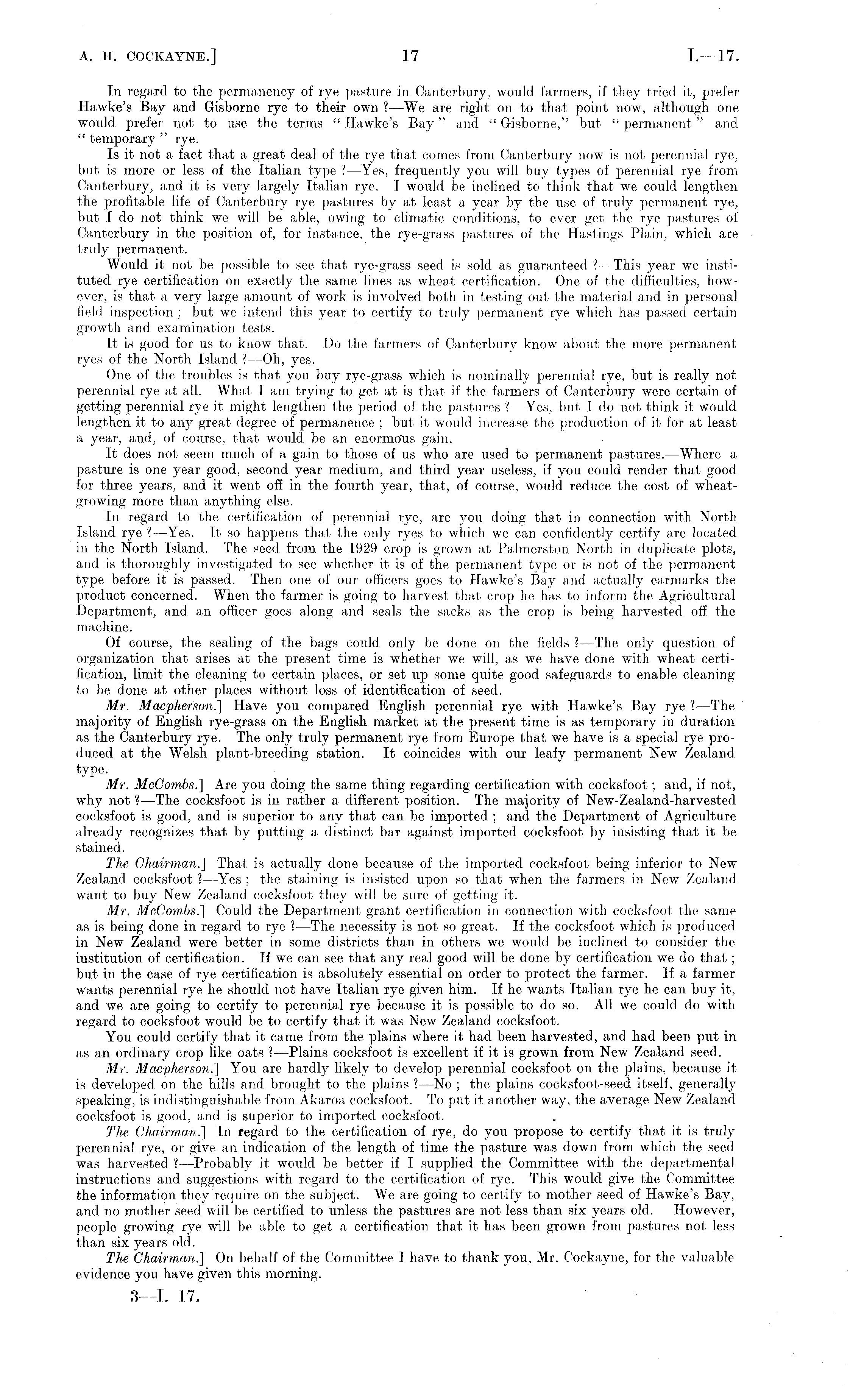 In regard to the permanency of rye pasture in Canterbury, would farmers, if they tried it, prefer Hawke's Bay and Gisborne rye to their own ? —We are right on to that point now, although one would prefer not to use the terms " Hawke's Bay" and " Gisborne," but " permanent" and " temporary " rye. Is it not a fact that a great deal of the rye that comes from Canterbury now is not perennial rye, but is more or less of the Italian type ?—Yes, frequently you will buy types of perennial rye from Canterbury, and it is very largely Italian rye. I would be inclined to think that we could lengthen the profitable life of Canterbury rye pastures by at least a year by the use of truly permanent rye, but I do not think we will be able, owing to climatic conditions, to ever get the rye pastures of Canterbury in the position of, for instance, the rye-grass pastures of the Hastings Plain, which are truly permanent. Would it not be possible to see that rye-grass seed is sold as guaranteed ? —This year we instituted rye certification on exactly the same lines as wheat certification. One of the difficulties, however, is that a very large amount of work is involved both in testing out the material and in personal field inspection ; but we intend this year to certify to truly permanent rye which has passed certain growth and examination tests. It is good for us to know that. Do the farmers of Canterbury know about the more permanent ryes of the North Island ? —Oh, yes. One of the troubles is that you buy rye-grass which is nominally perennial rye, but is really not perennial rye at all. What lam trying to get at is that if the farmers of Canterbury were certain of getting perennial rye it might lengthen the period of the pastures ?—Yes, but I do not think it would lengthen it to any great degree of permanence ; but it would increase the production of it for at least a year, and, of course, that would be an enormo'us gain. It does not seem much of a gain to those of us who are used to permanent pastures. —Where a pasture is one year good, second year medium, and third year useless, if you could render that good for three years, and it went off in the fourth year, that, of course, would reduce the cost of wheatgrowing more than anything else. In regard to the certification of perennial rye, are you doing that in connection with North Island rye ? —Yes. It so happens that the only ryes to which we can confidently certify are located in the North Island. The seed from the 1929 crop is grown at Palmerston North in duplicate plots, and is thoroughly investigated to see whether it is of the permanent type or is not of the permanent type before it is passed. Then one of our officers goes to Hawke's Bay and actually earmarks the product concerned. When the farmer is going to harvest that crop he has to inform the Agricultural Department, and an officer goes along and seals the sacks as the crop is being harvested off the machine. Of course, the sealing of the bags could only be done on the fields ? —The only question of organization that arises at the present time is whether we will, as we have done with wheat certification, limit the cleaning to certain places, or set up some quite good safeguards to enable cleaning to be done at other places without loss of identification of seed. Mr. Macpherson.\ Have you compared English perennial rye with Hawke's Bay rye ? —The majority of English rye-grass on the English market at the present time is as temporary in duration as the Canterbury rye. The only truly permanent rye from Europe that we have is a special rye produced at the Welsh plant-breeding station. It coincides with our leafy permanent New Zealand type. Mr. McCombs.] Are you doing the same thing regarding certification with cocksfoot; and, if not, why not ? —The cocksfoot is in rather a different position. The majority of New-Zealand-harvested cocksfoot is good, and is superior to any that can be imported ; and the Department of Agriculture already recognizes that by putting a distinct bar against imported cocksfoot by insisting that it be stained. The Chairman.] That is actually done because of the imported cocksfoot being inferior to New Zealand cocksfoot ?—Yes ; the staining is insisted upon so that when the farmers in New Zealand want to buy New Zealand cocksfoot they will be sure of getting it. Mr. McCombs.] Could the Department grant certification in connection with cocksfoot the same as is being done in regard to rye ? —The necessity is not so great. If the cocksfoot which is produced in New Zealand were better in some districts than in others we would be inclined to consider the institution of certification. If we can see that any real good will be done by certification we do that; but in the case of rye certification is absolutely essential on order to protect the farmer. If a farmer wants perennial rye he should not have Italian rye given him. If he wants Italian rye he can buy it, and we are going to certify to perennial rye because it is possible to do so. All we could do with regard to cocksfoot would be to certify that it was New Zealand cocksfoot. You could certify that it came from the plains where it had been harvested, and had been put in as an ordinary crop like oats ? —Plains cocksfoot is excellent if it is grown from New Zealand seed. Mr. Macpherson.\ You are hardly likely to develop perennial cocksfoot on the plains, because itis developed on the hills and brought to the plains ?—No ; the plains cocksfoot-seed itself, generally speaking, is indistinguishable from Akaroa cocksfoot. To put it another way, the average New Zealand cocksfoot is good, and is superior to imported cocksfoot. The Chairman.'] In regard to the certification of rye, do you propose to certify that it is truly perennial rye, or give an indication of the length of time the pasture was down from which the seed was harvested ? —Probably it would be better if I supplied the Committee with the depar
