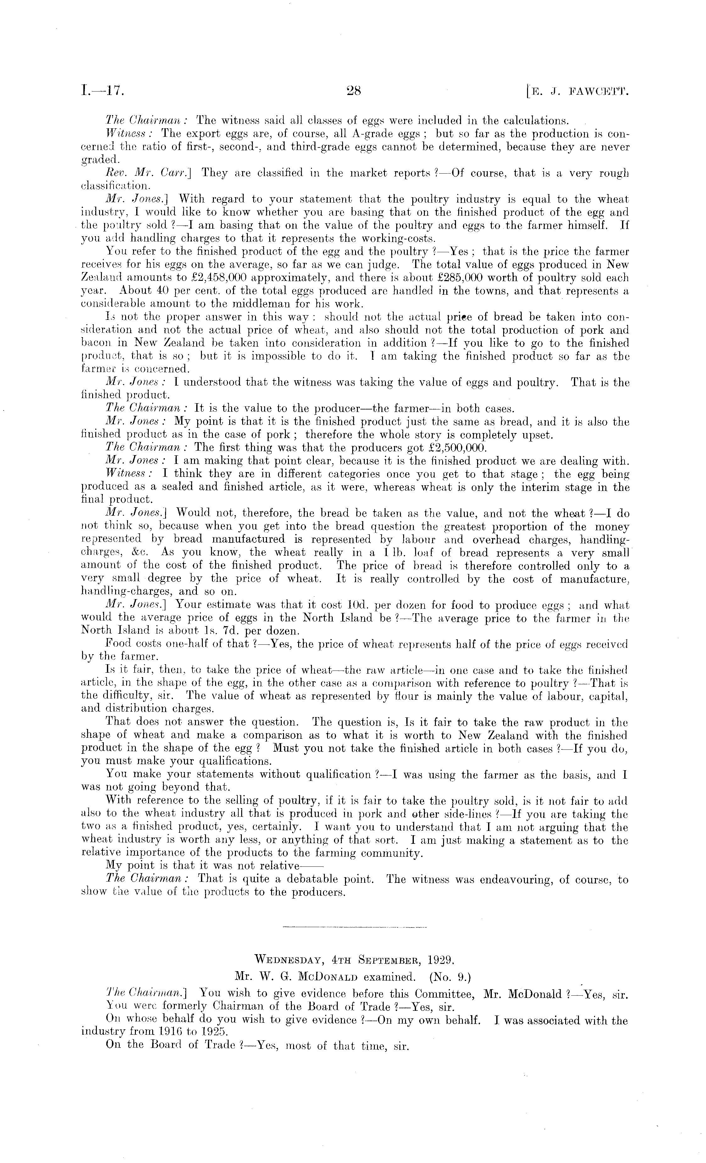 Wednesday, 4th September, 1929. Mr. W. G. McDonald examined. (No. 9.) The Chairman.] You wish to give evidence before this Committee, Mr. McDonald ?—Yes, sir. You were formerly Chairman of the Board of Trade ? —Yes, sir. On whose behalf do you wish to give evidence ? —On my own behalf. I was associated with the industry from 1916 to 1925. On the Board of Trade ?—Yes, most of that time, sir.