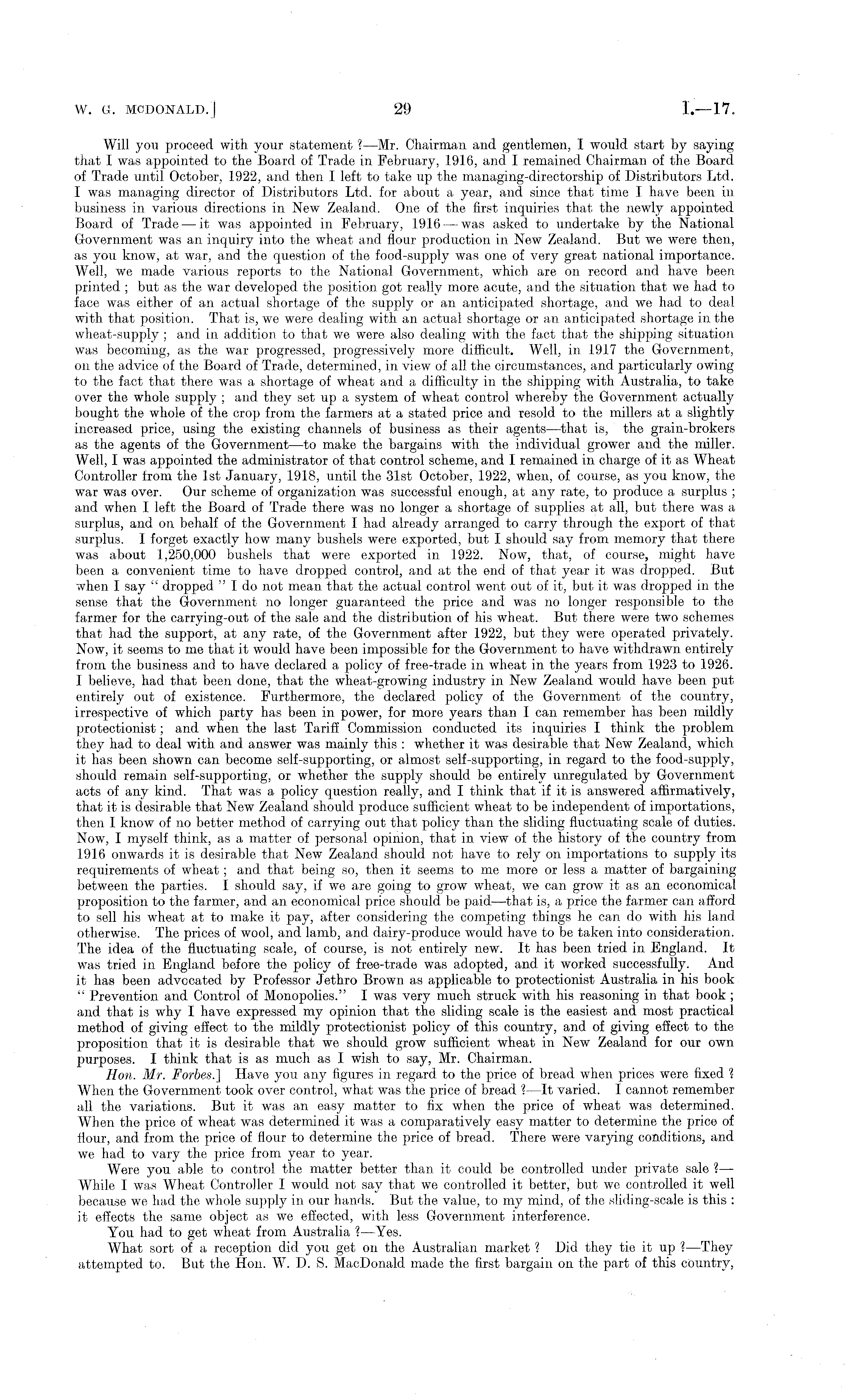 Will you proceed with your statement ? —Mr. Chairman and gentlemen, I would start by saying that I was appointed to the Board of Trade in February, 1916, and I remained Chairman of the Board of Trade until October, 1922, and then I left to take up the managing-directorship of Distributors Ltd. I was managing director of Distributors Ltd. for about a year, and since that time I have been in business in various directions in New Zealand. One of the first inquiries that the newly appointed Board of Trade. —it was appointed in February, 1916 — was asked to undertake by the National Government was an inquiry into the wheat and flour production in New Zealand. But we were then, as you know, at war, and the question of the food-supply was one of very great national importance. Well, we made various reports to the National Government, which are on record and have been printed ; but as the war developed the position got really more acute, and the situation that we had to face was either of an actual shortage of the supply or an anticipated shortage, and we had to deal with that position. That is, we were dealing with an actual shortage or an anticipated shortage in the wheat-supply ; and in addition to that we were also dealing with the fact that the shipping situation was becoming, as the war progressed, progressively more difficult. Well, in 1917 the Government, on the advice of the Board of Trade, determined, in view of all the circumstances, and particularly owing to the fact that there was a shortage of wheat and a difficulty in the shipping with Australia, to take over the whole supply ; and they set up a system of wheat control whereby the Government actually bought the whole of the crop from the farmers at a stated price and resold to the millers at a slightly increased price, using the existing channels of business as their agents —that is, the grain-brokers as the agents of the Government —to make the bargains with the individual grower and the miller. Well, I was appointed the administrator of that control scheme, and I remained in charge of it as Wheat Controller from the Ist January, 1918, until the 31st October, 1922, when, of course, as you know, the war was over. Our scheme of organization was successful enough, at any rate, to produce a surplus ; and when I left the Board of Trade there was no longer a shortage of supplies at all, but there was a surplus, and on behalf of the Government I had already arranged to carry through the export of that surplus. 1 forget exactly how many bushels were exported, but I should say from memory that there was about 1,250,000 bushels that were exported in 1922. Now, that, of course, might have been a convenient time to have dropped control, and at the end of that year it was dropped. But when I say " dropped " I do not mean that the actual control went out of it, but it was dropped in the sense that the Government no longer guaranteed the price and was no longer responsible to the farmer for the carrying-out of the sale and the distribution of his wheat. But there were two schemes that had the support, at any rate, of the Government after 1922, but they were operated privately. Now, it seems to me that it would have been impossible for the Government to have withdrawn entirely from the business and to have declared a policy of free-trade in wheat in the years from 1923 to 1926. I believe, had that been done, that the wheat-growing industry in New Zealand would have been put entirely out of existence. Furthermore, the declared policy of the Government of the country, irrespective of which party has been in power, for more years than I can remember has been mildly protectionist; and when the last Tariff Commission conducted its inquiries I think the problem they had to deal with and answer was mainly this : whether it was desirable that New Zealand, which it has been shown can become self-supporting, or almost self-supporting, in regard to the food-supply, should remain self-supporting, or whether the supply should be entirely unregulated by Government acts of any kind. That was a policy question really, and I think that if it is answered affirmatively, that it is desirable that New Zealand should produce sufficient wheat to be independent of importations, then I know of no better method of carrying out that policy than the sliding fluctuating scale of duties. Now, I myself think, as a matter of personal opinion, that in view of the history of the country from 1916 onwards it is desirable that New Zealand should not have to rely on importations to supply its requirements of wheat; and that being so, then it seems to me more or less a matter of bargaining between the parties. I should say, if we are going to grow wheat, we can grow it as an economical proposition to the farmer, and an economical price should be paid—that is, a price the farmer can afford to sell his wheat at to make it pay, after considering the competing things he can do with his land otherwise. The prices of wool, and lamb, and dairy-produce would have to be taken into consideration. The idea of the fluctuating scale, of course, is not entirely new. It has been tried in England. It was tried in England before the policy of free-trade was adopted, and it worked successfully. And it has been advocated by Professor Jethro Brown as applicable to protectionist Australia in his book " Prevention and Control of Monopolies." I was very much struck with his reasoning in that book ; and that is why I have expressed my opinion that the sliding scale is the easiest and most practical method of giving effect to the mildly protectionist policy of this country, and of giving eSect to the proposition that it is desirable that we should grow sufficient wheat in New Zealand for our own purposes. I think that is as much as I wish to say, Mr. Chairman. Hon. Mr. Forbes.] Have you any figures in regard to the price of bread when prices were fixed ? When the Government took over control, wh