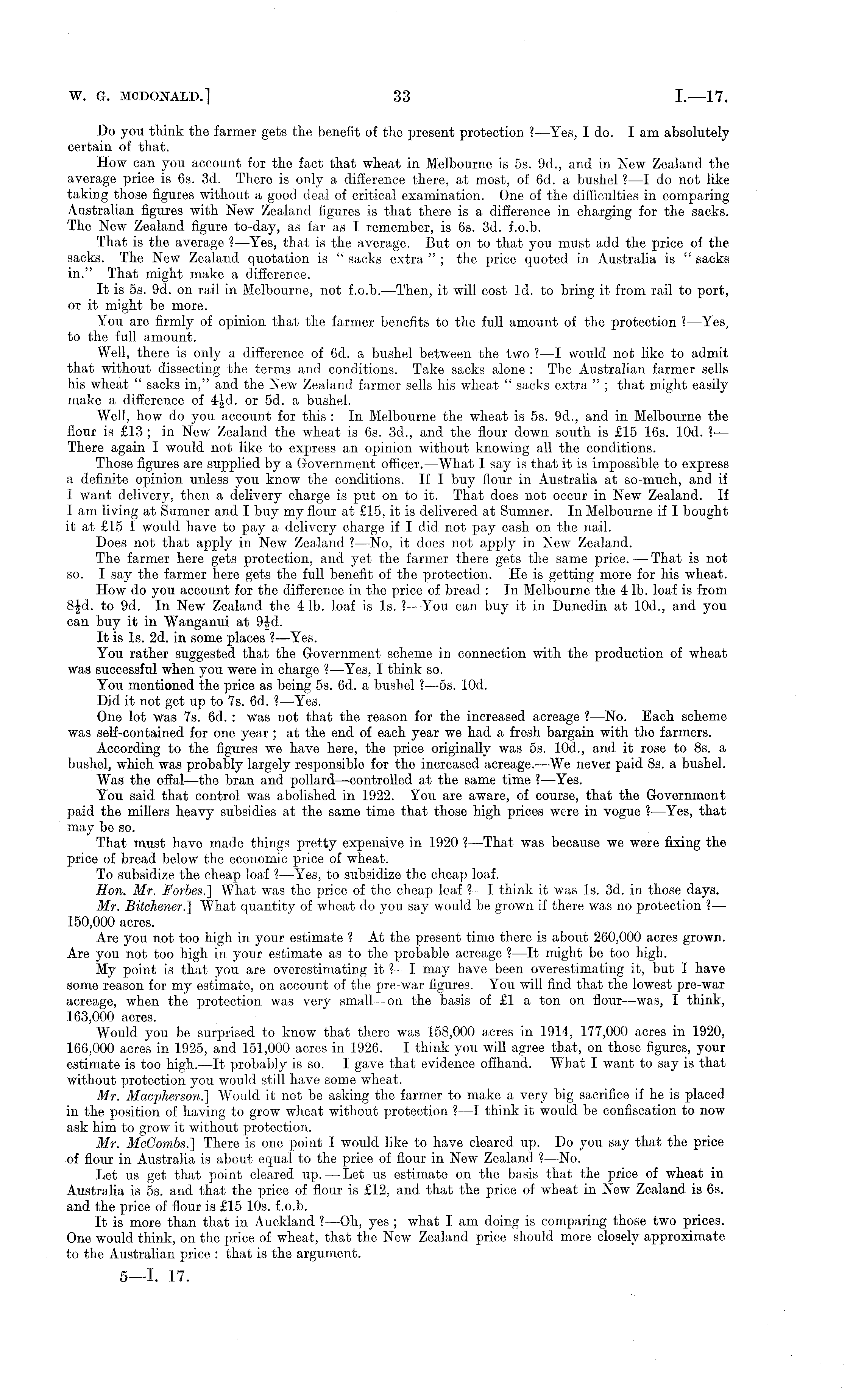 Do you think the farmer gets the benefit of the present protection ? —Yes, I do. lam absolutely certain of that. How can you account for the fact that wheat in Melbourne is ss. 9d., and in New Zealand the average price is 6s. 3d. There is only a difference there, at most, of 6d. a bushel ? —I do not like taking those figures without a good deal of critical examination. One of the difficulties in comparing Australian figures with New Zealand figures is that there is a difference in charging for the sacks. The New Zealand figure to-day, as far as I remember, is 6s. 3d. f.o.b. That is the average ? —Yes, that is the average. But on to that you must add the price of the sacks. The New Zealand quotation is " sacks extra " ; the price quoted in Australia is " sacks in." That might make a difference. It is ss. 9d. on rail in Melbourne, not f.o.b.—Then, it will cost Id. to bring it from rail to port, or it might be more. You are firmly of opinion that the farmer benefits to the full amount of the protection ?—Yes, to the full amount. Well, there is only a difference of 6d. a bushel between the two ? —I would not like to admit that without dissecting the terms and conditions. Take sacks alone : The Australian farmer sells his wheat " sacks in," and the New Zealand farmer sells his wheat " sacks extra " ; that might easily make a difference of 4§d. or sd. a bushel. Well, how do you account for this : In Melbourne the wheat is ss. 9d., and in Melbourne the flour is £13 ; in New Zealand the wheat is 6s. 3d., and the flour down south is £15 16s. lOd. ? — There again I would not like to express an opinion without knowing all the conditions. Those figures are supplied by a Government officer. —What I say is that it is impossible to express a definite opinion unless you know the conditions. If I buy flour in Australia at so-much, and if I want delivery, then a delivery charge is put on to it. That does not occur in New Zealand. If lam living at Sumner and I buy my flour at £15, it is delivered at Sumner. In Melbourne if I bought it at £15 I would have to pay a delivery charge if I did not pay cash on the nail. Does not that apply in New Zealand ? —No, it does not apply in New Zealand. The farmer here gets protection, and yet the farmer there gets the same price. — That is not so. I say the farmer here gets the full benefit of the protection. He is getting more for his wheat. How do you account for the difference in the price of bread : In Melbourne the 4 lb. loaf is from B|d. to 9d. In New Zealand the 4 lb. loaf is Is. ? —You can buy it in Dunedin at 10d., and you can buy it in Wanganui at 9|d. It is Is. 2d. in some places ? —Yes. You rather suggested that the Government scheme in connection with the production of wheat was successful when you were in charge ?—Yes, I think so. You mentioned the price as being ss. 6d. a bushel ? —ss. lOd. Did it not get up to 7s. 6d. ? —Yes. One lot was 7s. 6d. : was not that the reason for the increased acreage ? —No. Each scheme was self-contained for one year ; at the end of each year we had a fresh bargain with the farmers. According to the figures we have here, the price originally was ss. 10d., and it rose to Bs. a bushel, which was probably largely responsible for the increased acreage. —We never paid Bs. a bushel. Was the offal—the bran and pollard—controlled at the same time ? —Yes. You said that control was abolished in 1922. You are aware, of course, that the Government paid the millers heavy subsidies at the same time that those high prices were in vogue ? —Yes, that may be so. That must have made things pretty expensive in 1920 ? —That was because we were fixing the price of bread below the economic price of wheat. To subsidize the cheap loaf ?—Yes, to subsidize the cheap loaf. Hon. Mr. Forbes.] What was the price of the cheap loaf ? —I think it was Is. 3d. in those days. Mr. Bitchener.] What quantity of wheat do you say would be grown if there was no protection ? — 150,000 acres. Are you not too high in your estimate ? At the present time there is about 260,000 acres grown. Are you not too high in your estimate as to the probable acreage ? —lt might be too high. My point is that you are overestimating it ? —I may have been overestimating it, but I have some reason for my estimate, on account of the pre-war figures. You will find that the lowest pre-war acreage, when the protection was very small—on the basis of £1 a ton on flour—was, I think, 163,000 acres. Would you be surprised to know that there was 158,000 acres in 1914, 177,000 acres in 1920, 166,000 acres in 1925, and 151,000 acres in 1926. I think you will agree that, on those figures, your estimate is too high.—lt probably is so. I gave that evidence offhand. What I want to say is that without protection you would still have some wheat. Mr. Macpherson.\ Would it not be asking the farmer to make a very big sacrifice if he is placed in the position of having to grow wheat without protection ?—I think it would be confiscation to now ask him to grow it without protection. Mr. McCombs.] There is one point I would like to have cleared up. Do you say that the price of flour in Australia is about equal to the price of flour in New Zealand ? —No. Let us get that point cleared up.—Let us estimate on the basis that the price of wheat in Australia is ss. and that the price of flour is £12, and that the price of wheat in New Zealand is 6s. and the price of flour is £15 10s. f.o.b. It is more than that in Auckland ? —Oh, yes ; what I am doing is comparing those two prices. One would think, on the price of wheat, that the New Zealand price should more closely approximate to the Australian price : that is the argument.