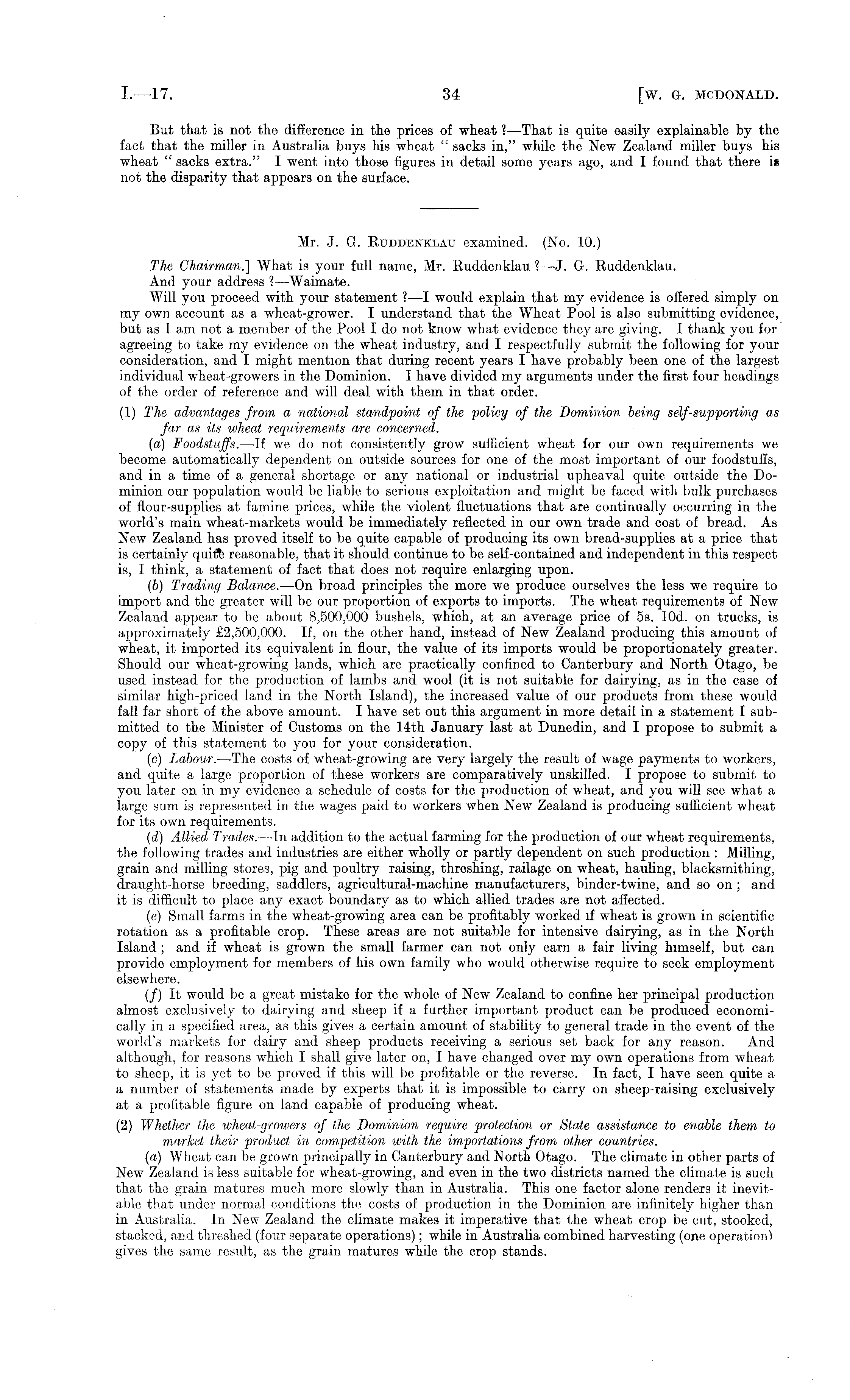 But that is not the difference in the prices of wheat I—That is quite easily explainable by the fact that the miller in Australia buys his wheat " sacks in," while the New Zealand miller buys his wheat " sacks extra." I went into those figures in detail some years ago, and I found that there is not the disparity that appears on the surface. Mr. J. G. Kuddenklatj examined. (No. 10.) The Chairman.] What is your full name, Mr. Ruddenklau ? —J. G. Ruddenklau. And your address ? —Waimate. Will you proceed with your statement ?—I would explain that my evidence is offered simply on my own account as a wheat-grower. I understand that the Wheat Pool is also submitting evidence, but as lam not a member of the Pool Ido not know what evidence they are giving. I thank you for agreeing to take my evidence on the wheat industry, and I respectfully submit the following for your consideration, and I might mention that during recent years I have probably been one of the largest individual wheat-growers in the Dominion. I have divided my arguments under the first four headings of the order of reference and will deal with them in that order. (1) The advantages from a national standpoint of the policy of the Dominion being self-supporting as far as its wheat requirements are concerned. (a) Foodstuffs. —If we do not consistently grow sufficient wheat for our own requirements we become automatically dependent on outside sources for one of the most important of our foodstuffs, and in a time of a general shortage or any national or industrial upheaval quite outside the Dominion our population would be liable to serious exploitation and might be faced with bulk purchases of flour-supplies at famine prices, while the violent fluctuations that are continually occurring in the world's main wheat-markets would be immediately reflected in our own trade and cost of bread. As New Zealand has proved itself to be quite capable of producing its own bread-supplies at a price that is certainly quitfe reasonable, that it should continue to be self-contained and independent in this respect is, I think, a statement of fact that does not require enlarging upon. (b) Trading Balance.—On broad principles the more we produce ourselves the less we require to import and the greater will be our proportion of exports to imports. The wheat requirements of New Zealand appear to be about 8,500,000 bushels, which, at an average price of ss. lOd. on trucks, is approximately £2,500,000. If, on the other hand, instead of New Zealand producing this amount of wheat, it imported its equivalent in flour, the value of its imports would be proportionately greater. Should our wheat-growing lands, which are practically confined to Canterbury and North Otago, be used instead for the production of lambs and wool (it is not suitable for dairying, as in the case of similar high-priced land in the North Island), the increased value of our products from these would fall far short of the above amount. I have set out this argument in more detail in a statement I submitted to the Minister of Customs on the 14th January last at Dunedin, and I propose to submit a copy of this statement to you for your consideration. (c) Labour.—The costs of wheat-growing are very largely the result of wage payments to workers, and quite a large proportion of these workers are comparatively unskilled. I propose to submit to you later on in my evidence a schedule of costs for the production of wheat, and you will see what a large sum is represented in the wages paid to workers when New Zealand is producing sufficient wheat for its own requirements. (d) Allied Trades.—ln addition to the actual farming for the production of our wheat requirements, the following trades and industries are either wholly or partly dependent on such production : Milling, grain and milling stores, pig and poultry raising, threshing, railage on wheat, hauling, blacksmithing, draught-horse breeding, saddlers, agricultural-machine manufacturers, binder-twine, and so on ; and it is difficult to place any exact boundary as to which allied trades are not affected. (e) Small farms in the wheat-growing area can be profitably worked if wheat is grown in scientific rotation as a profitable crop. These areas are not suitable for intensive dairying, as in the North Island ; and if wheat is grown the small farmer can not only earn a fair living himself, but can provide employment for members of his own family who would otherwise require to seek employment elsewhere. (/) It would be a great mistake for the whole of New Zealand to confine her principal production almost exclusively to dairying and sheep if a further important product can be produced economically in a specified area, as this gives a certain amount of stability to general trade in the event of the world's markets for dairy and sheep products receiving a serious set back for any reason. And although, for reasons which I shall give later on, I have changed over my own operations from wheat to sheep, it is yet to be proved if this will be profitable or the reverse. In fact, I have seen quite a a number of statements made by experts that it is impossible to carry on sheep-raising exclusively at a profitable figure on land capable of producing wheat. (2) Whether the wheat-growers of the Dominion require protection or State assistance to enable them to market their product in competition with the importations from other countries. (a) Wheat can be grown principally in Canterbury and North Otago. The climate in other parts of New Zealand is less suitable for wheat-growing, and even in the two districts named the climate is such that the grain matures much more slowly than in Australia. This one factor alone renders it inevitable that under normal conditions the costs of production in the Dominion are infinitely higher than in Australia. In New Zealand the climate makes it imperative that the wheat crop be cut, stooked, stacked, and threshed (fou