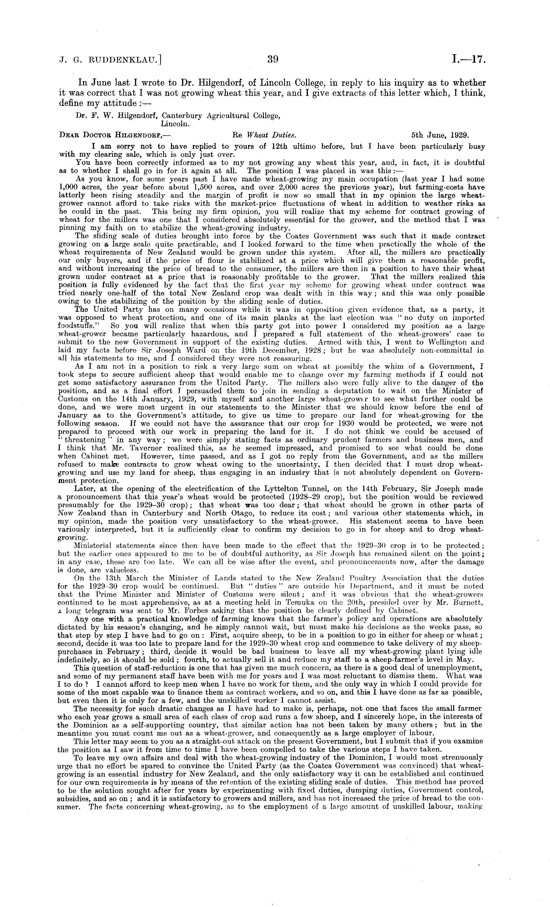 In June last I wrote to Dr. Hilgendorf, of Lincoln College, in reply to his inquiry as to whether it was correct that I was not growing wheat this year, and I give extracts of this letter which, I think, define my attitude :— Dr. F. W. Hilgendorf, Canterbury Agricultural College, Lincoln. Dear Doctor Hilgendorf,— Re Wheat Duties. sth June, 1929. I am sorry not to have replied to yours of 12th ultimo before, but I have been particularly busy with my clearing sale, which is only just over. You have been correctly informed as to my not growing any wheat this year, and, in fact, it is doubtful as to whether I shall go in for it again at all. The position I was placed in was this : — As you know, for some years past I have made wheat-growing my main occupation (last year I had some 1,000 acres, the year before about 1,500 acres, and over 2,000 acres the previous year), but farming-costs have latterly been rising steadily and the margin of profit is now so small that in my opinion the large wheatgrower cannot afford to take risks with the market-price fluctuations of wheat in addition to weather risks as he could in the past. This being my firm opinion, you will realize that my scheme for contract growing of wheat for the millers was one that I considered absolutely essential for the grower, and the method that I was pinning my faith on to stabilize the wheat-growing industry. The sliding scale of duties brought into force by the Coates Government was such that it made contract growing on a large scale quite practicable, and I looked forward to the time when practically the whole of the wheat requirements of New Zealand would be grown under this system. After all, the millers are practically our only buyers, and if the price of flour is stabilized at a price which will give them a reasonable profit, and without increasing the price of bread to the consumer, the millers are then in a position to have their wheat grown under contract at a price that is reasonably profitable to the grower. That the millers realized this position is fully evidenced by the fact that the first year my scheme for growing wheat under contract was tried nearly one-half of the total New Zealand crop was dealt with in this way; and this was only possible owing to the stabilizing of the position by the sliding scale of duties. The United Party has on many occasions while it was in opposition given evidence that, as a party, it was opposed to wheat protection, and one of its main planks at the last election was " no duty on imported foodstuffs." So you will realize that when this party got into power 1 considered my position as a large wheat-grower became particularly hazardous, and I prepared a full statement of the wheat-growers' case to submit to the new Government in support of the existing duties. Armed with this, I went to Wellington and laid my facts before Sir Joseph Ward on the 19th December, 1928 ; but he was absolutely non-committal in all his statements to me, and I considered they were not reassuring. As I am not in a position to risk a very large sum on wheat at possibly the whim of a Government, I took steps to secure sufficient sheep that would enable me to change over my farming methods if I could not get some satisfactory assurance from the United Party. The millers also were fully alive to the danger of the position, and as a final effort I persuaded them to join in sending a deputation to wait on the Minister of Customs on the 14th January, 1929, with myself and another large wheat-growtr to see what further could be done, and we were most urgent in our statements to the Minister that we should know before the end of January as to the Government's attitude, to give us time to prepare our land for wheat-growing for the following season. If we could not have the assurance that our crop for 1930 would be protected, we were not prepared to proceed with our work in preparing the land for it. I do not think we could be accused of " threatening " in any way ; we were simply stating facts as ordinary prudent farmers and business men, and I think that Mr. Taverner realized this, as he seemed impressed, and promised to see what could be done when Cabinet met. However, time passed, and as I got no reply from the Government, and as the millers refused to make contracts to grow wheat owing to the uncertainty, I then decided that I must drop wheatgrowing and use my land for sheep, thus engaging in an industry that is not absolutely dependent on Government protection. Later, at the opening of the electrification of the Lyttelton Tunnel, on the 14th February, Sir Joseph made a pronouncement that this year's wheat would be protected (1928-29 crop), but the position would be reviewed presumably for the 1929-30 crop); that wheat was too dear; that wheat should be grown in other parts of New Zealand than in Canterbury and North Otago, to reduce its cost; and various other statements which, in my opinion, made the position very unsatisfactory to the wheat-grower. His statement seems to have been variously interpreted, but it is sufficiently clear to confirm my decision to go in for sheep and to drop wheatgrowing. Ministerial statements since then have been made to the effect that the 1929-30 crop is to be protected ; but the earlier ones appeared to me to be of doubtful authority, as Sir Joseph has remained silent on the point; in any case, these are too late. We can all be wise after the event, and pronouncements now, after the damage is done, are valueless. On the 13th March the Minister of Lands stated to the New Zealand Poultry Association that the duties for the 1929-30 crop would be continued. But "duties" are outside his Department, and it must be noted that the Prime Minister and Minister of Customs were silent; and it was obvious that the wheat-growers continued to be most apprehensive, as at a meeting held in Temuka on the 20th, presided over by Mr. Burnett, a- long telegram was sent to Mr. Forbes asking tha