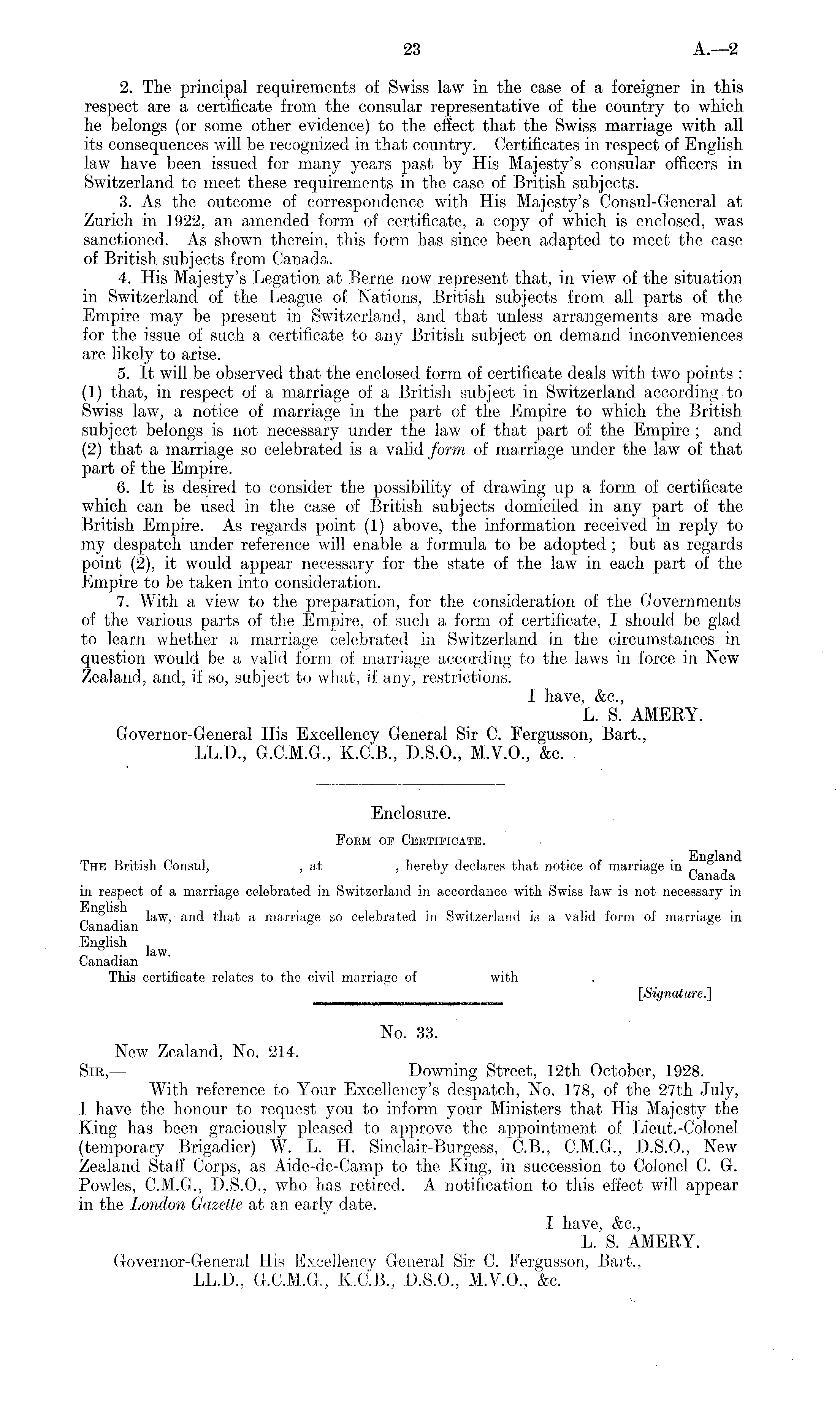 2. The principal requirements of Swiss law in the case of a foreigner in this respect are a certificate from the consular representative of the country to which he belongs (or some other evidence) to the effect that the Swiss marriage with all its consequences will be recognized in that country. Certificates in respect of English law have been issued for many years past by His Majesty's consular officers in Switzerland to meet these requirements in the case of British subjects. 3. As the outcome of correspondence with His Majesty's Consul-General at Zurich in 1922, an amended form of certificate, a copy of which is enclosed, was sanctioned. As shown therein, this form has since been adapted to meet the case of British subjects from Canada. 4. His Majesty's Legation at Berne now represent that, in view of the situation in Switzerland of the League of Nations, British subjects from all parts of the Empire may be present in Switzerland, and that unless arrangements are made for the issue of such a certificate to any British subject on demand inconveniences are likely to arise. 5. It will be observed that the enclosed form of certificate deals with two points : (1) that, in respect of a marriage of a British subject in Switzerland according to Swiss law, a notice of marriage in the part of the Empire to which the British subject belongs is not necessary under the law of that part of the Empire ; and (2) that a marriage so celebrated is a valid form, of marriage under the law of that part of the Empire. 6. It is desired to consider the possibility of drawing up a form of certificate which can be used in the case of British subjects domiciled in any part of the British Empire. As regards point (1) above, the information received in reply to my despatch under reference will enable a formula to be adopted ; but as regards point (2), it would appear necessary for the state of the law in each part of the Empire to be taken into consideration. 7. With a view to the preparation, for the consideration of the Governments of the various parts of the Empire, of such a form of certificate, I should be glad to learn whether a marriage celebrated in Switzerland in the circumstances in question would be a valid form of marriage according to the laws in force in New Zealand, and, if so, subject to what, if any, restrictions. I have, &c., L. S. AMERY. Govern or-General His Excellency General Sir C. Fergusson, Bart., LL.D., G.C.M.G., K.C.8., D.5.0., M.Y.0., &c.