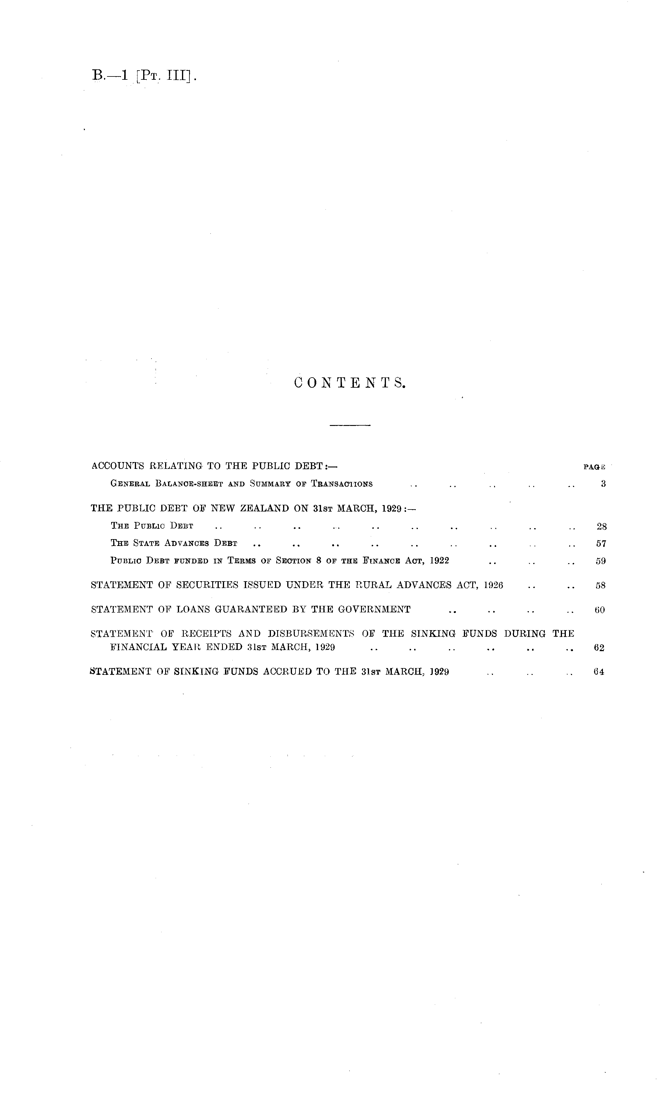 CONTENTS. ACCOUNTS RELATING TO THE PUBLIC DEBTpage General Balance-sheet and Summary of Transactions . . .. .. .. .. 3 THE PUBLIC DEBT OF NEW ZEALAND ON 31st MARCH, 1929 The Public Debt .. .. .. .. .. .. .. .. .. .. 28 The State Advances Debt .. .. .. .. .. .. .. .. 57 Public Debt funded in Terms of Section 8 of the Finance Act, 1922 .. .. .. 59 STATEMENT OF SECURITIES ISSUED UNDER THE RURAL ADVANCES ACT, 1926 .. .. 58 STATEMENT OF LOANS GUARANTEED BY THE GOVERNMENT .. .. .. .. 60 STATEMENT OF RECEIPTS AND DISBURSEMENTS OF THE SINKING FUNDS DURING THE FINANCIAL YEAR ENDED 31st MARCH, 1929 .. .. .. .. .. .. 62 STATEMENT OF SINKING FUNDS ACCRUED TO THE 31ST MARCH, 1929 .. .. 64