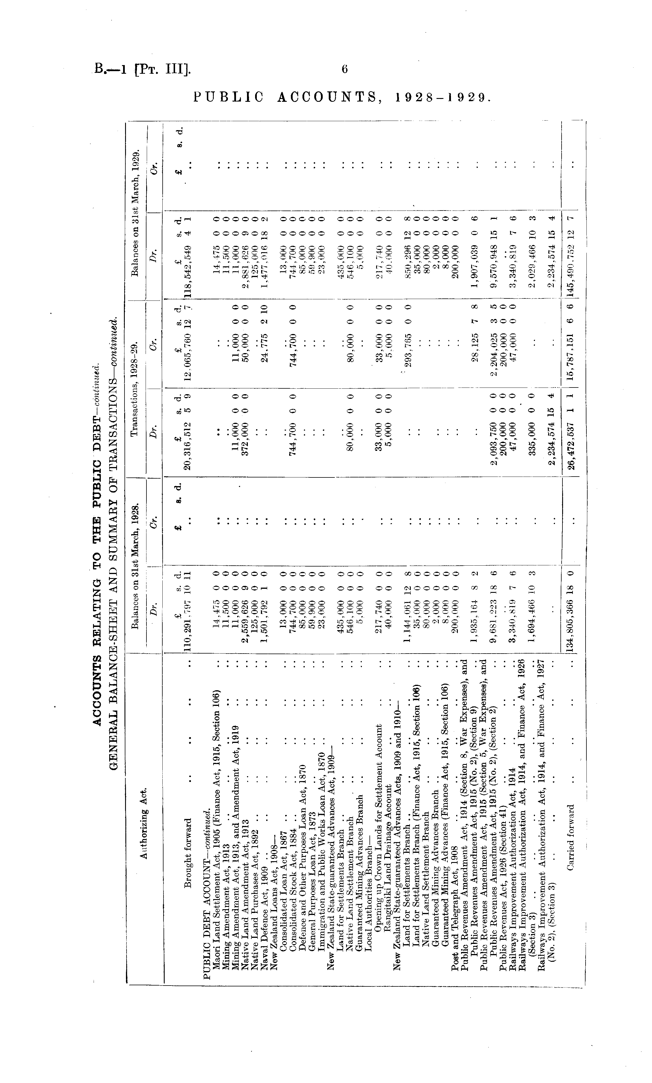 Balances on 31st March, 1928. Transactions, 1928-29. Balances on 31st March, 1929. Authorizing Act. Dr. Cr. Dr. Cr. Dr. Gr. £ s. d. £ s. d. £ s. d. £ s. d. £ s. d. £ s. d Brought forward .. .. .. .. 110,291.797 10 11 .. 20,316,512 5 9 12.065,760 12 7 118,542,549 4 1 .. PUBLIC DEBT ACCOUNT —continued. Maori Land Settlement Act, 1905 (Finance Act, 1915, Section 106) .. 14,475 0 0 .. .. 14,475 0 0 Mining Amendment Act, 1913 .. .. .. .. •• 11,500 0 0 .. .. .. 11,500 0 0 Mining Amendment Act, 1913, and Amendment Act, 1919 .. .. 11,000 0 0 ... 11,000 0 0 11,000 0 0 11,000 0 0 Native Land Amendment Act, 1913 .. .. •• 2,559,626 9 0 .. 372,000 0 0 50,000 0 0 2,881,626 9 0 Native Land Purchases Act, 1892 .. .. .. .. .. 125.000 0 0 .. ,. .. 125,000 0 0 Naval Defence Act, 1909 .. .. .. .. .. .. 1,501,792 1 0 .. .. 24.775 2 10 1,477.016 18 2 New Zealand Loans Act, 1908 — Consolidated Loan Act, 1867 .. .. .. •• •• 13,000 0 0 .. .. .. 13,000 0 0 Consolidated Stock Act, 1884 .. .. .. .. .. 744,700 0 0 .. 744,700 0 0 744,700 0 0 744,700 0 0 Defence and Other Purposes Loan Act, 1870 .. .. .. 85,000 0 0 .. .. .. 85,000 0 0 General Purposes Loan Act, 1873 .. .. •• •• 59,900 0 0 .. .. .. 59,900 0 0 Immigration and Public Works Loan Act, 1870 .. .. .. 23,000 0 0 .. .. .. 23,000 0 0 New Zealand State-guaranteed Advances Act, 1909 — Land for Settlements Branch .. .. .. .. .. 435, 000 0 0 .. • • .. 435, 000 0 0 Native Land Settlement Branch ... .. .. .. 546,100 0 0 .. 80,000 0 0 80,000 0 0 546,100 0 0 Guaranteed Mining Advances Branch .. .. .. .. 5,000 0 0 . .. .. 5,000 0 0 Local Authorities Branch — Opening up Crown Lands for Settlement Account .. .. 217,740 0 0 .. 33,000 0 0 33,000 0 0 217,740 0 0 Rangitaiki Land Drainage Account .. .. .. 40,000 0 0 .. 5,000 0 0 5,000 0 0 40.000 0 0 New Zealand State-guaranteed Advances Acts, 1909 and 1910 — Land for Settlements Branch .. .. .. .. .. 1,144,061 12 8 .. .. 293,765 0 0 850,296 12 8 Land for Settlements Branch (Finance Act, 1915, Section 106) .. 35,000 0 0 .. .. .. 35,000 0 0' Native Land Settlement Branch .. .. .. .. 80,000 0 0 .. . . 80,000 0 0 Guaranteed Mining Advances Branch .. .. .. .. 2,000 0 0 .. .. 2,000 0 0 Guaranteed Mining Advances (Finance Act, 1915, Section 106) .. 8,000 0 0 .. •• .. 8,000 0 0 Post and Telegraph Act, 1908 .. .. .. .. .. 200,000 0 0 .. .. 200,000 0 0 Public Revenues Amendment Act, 1914 (Section 8, War Expenses), and Public Revenues Amendment Act, 1915 (No. 2), (Section 9) .. 1,935,164 8 2 .. .. 28,125 7 8 1,907,039 0 6 Public Revenues Amendment Act, 1915 (Section 5, War Expenses), and Public Revenues Amendment Act, 1915 (No. 2), (Section 2) .. 9,681,223 18 6 .. 2,093,750 0 0 2,204,025 3 5 9,570,948 15 1 Public Revenues Act, 1926 (Section 41) .. .. .. .. .. .. 200,000 0 0 200,000 0 0 Railways Improvement Authorization Act, 1914 .. .. .. 3,340,819 7 6 .. 47,000 0 0 47,000 0 0 3,340,819 7 6 Railways Improvement Authorization Act, 1914, and Finance Act, 1926 (Section 3) .. .. .. .. .. •• 1,694,466 10 3 .. 335,000 0 0 .. 2,029,466 10 3 Railways Improvement Authorization Act, 1914, and Finance Act, 1927 (No. 2), (Section 3) .. .. .. .. •• •• ■■ .. 2,234,574 15 4 .. 2,234,574 15 4 Carried forward .. .. .. 134,805,366 18 0 .. 26,472,537 1 1 15,787,151 6 6 145,490,752 12 7