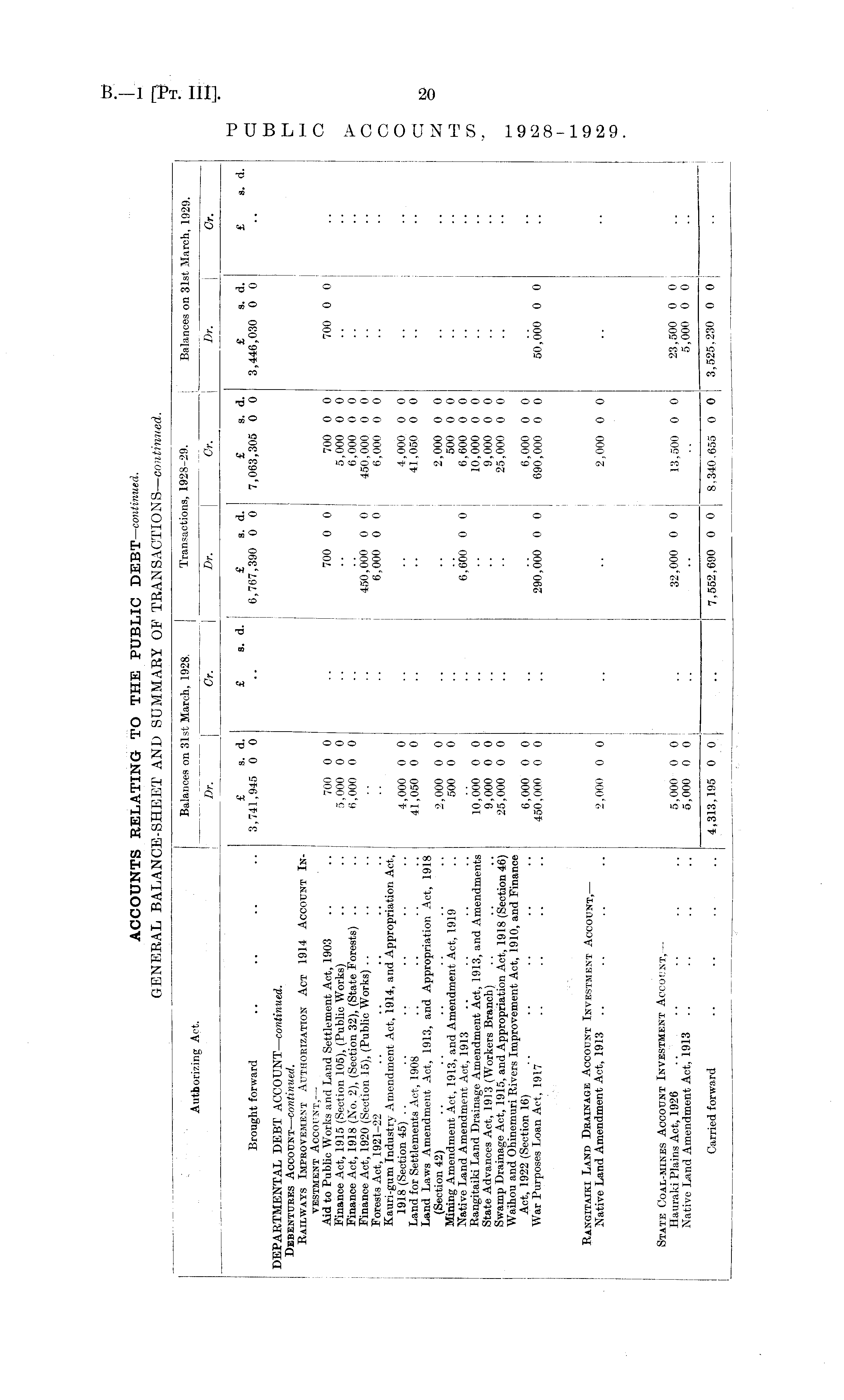 | Balances on 31st March, 1928. Transactions, 1928-29. Balances on 31st March, 1929. Aut.b orizing Act. j Dr. | Cr. [ Dr. | (Jr. Dr. \ Or. £ s. d. £ s. d. £ s. d. £ s. d. £ s. d. £ s. d. Brought forward .. .. .. .. 3,741,945 0 0 .. 6,767,390 0 0 7,063,305 0 0 3,446,030 0 0 DEPARTMENTAL DEBT ACCOUNT —continued. Debentures Account —continued. Railways Improvement Authorization Act 1914 Account Investment Account, — Aid to Public Works and Land Settlement Act, 1903 .. .. 700 0 0 .. 700 0 0 700 0 0 700 0 0 Finance Act, 1915 (Section 105), (Public Works) .. .. 5,000 0 0 .. .. 5,000 0 0 Finance Act, 1918 (No. 2), (Section 32), (State Forests) .. .. 6,000 0 0 .. .. 6,000 0 0 Finance Act, 1920 (Section 15), (Public Works) .. .. .. .. .. 450,000 0 0 450,000 0 0 Forests Act, 1921-22 .. .. .. .. .. .. .. 6,000 0 0, 6,000 0 0 Kauri-gum Industry Amendment Act, 1914, and Appropriation Act, 1918 (Section 45) .. .. .. .. .. .. 4,000 0 0 .. .. , 4,000 0 0 Land for Settlements Act, 1908 .. .. .. .. 41,050 0 0 .. .. 41,050 0 0 Land Laws Amendment Act, 1913, and Appropriation Act, 1918 (Section 42) .. .. .. .. .. .. 2,000 0 0 .. .. 2,000 0 0 Mining Amendment Act, 1913, and Amendment Act, 1919 .. 500 0 0 .. .. 500 0 0 Native Land Amendment Act, 1913 .. .. .. .. .. .. 6,600 0 0 ; 6,600 0 0 Rangitaiki Land Drainage Amendment Act, 1913, and Amendments 10,000 0 0 .. .. 10,000 0 0 State Advances Act, 191 3 (Workers Branch) .. .. .. 9,000 0 0 .. .. 9,000 0 0 Swamp Drainage Act, 1915, and Appropriation Act, 1918 (Section 46) 25,000 0 0 .. .. 25,000 0 0 Waihou and Ohinomuri Rivers Improvement Act, 1910, and Finance Act, 1922 (Section 16) .. .. .. .. .. 6,000 0 0 .. .. 6,000 0 0 War Purposes Loan Act, 1917 .. .. .. .. 450,000 0 0 .. 290,000 0 0 690,000 0 0 50,000 0 0 .... IIP*! I Rangitaiki Land Drainage Account Investment Account, — Native Land Amendment Act, 1913 .. .. .. .. 2,000 0 0 .. .. 2,000 0 0 * State Coal-mines Account Investment Account, — Hauraki Plains Act, 1926 .. .. .. .. .. 5,000 0 0 .. 32,000 0 0 13,500 0 0 23,500 0 0 Native Land Amendment Act, 1913 .. .. .. .. o,000 0 0 .. .. .. 5,000 0 0 Carried forward .. .. .. .. 4,313,195 0 0 .. 7,552,690 0 0 8,340,655 0 0 3,525,230 0 0 -'--I-.-- I