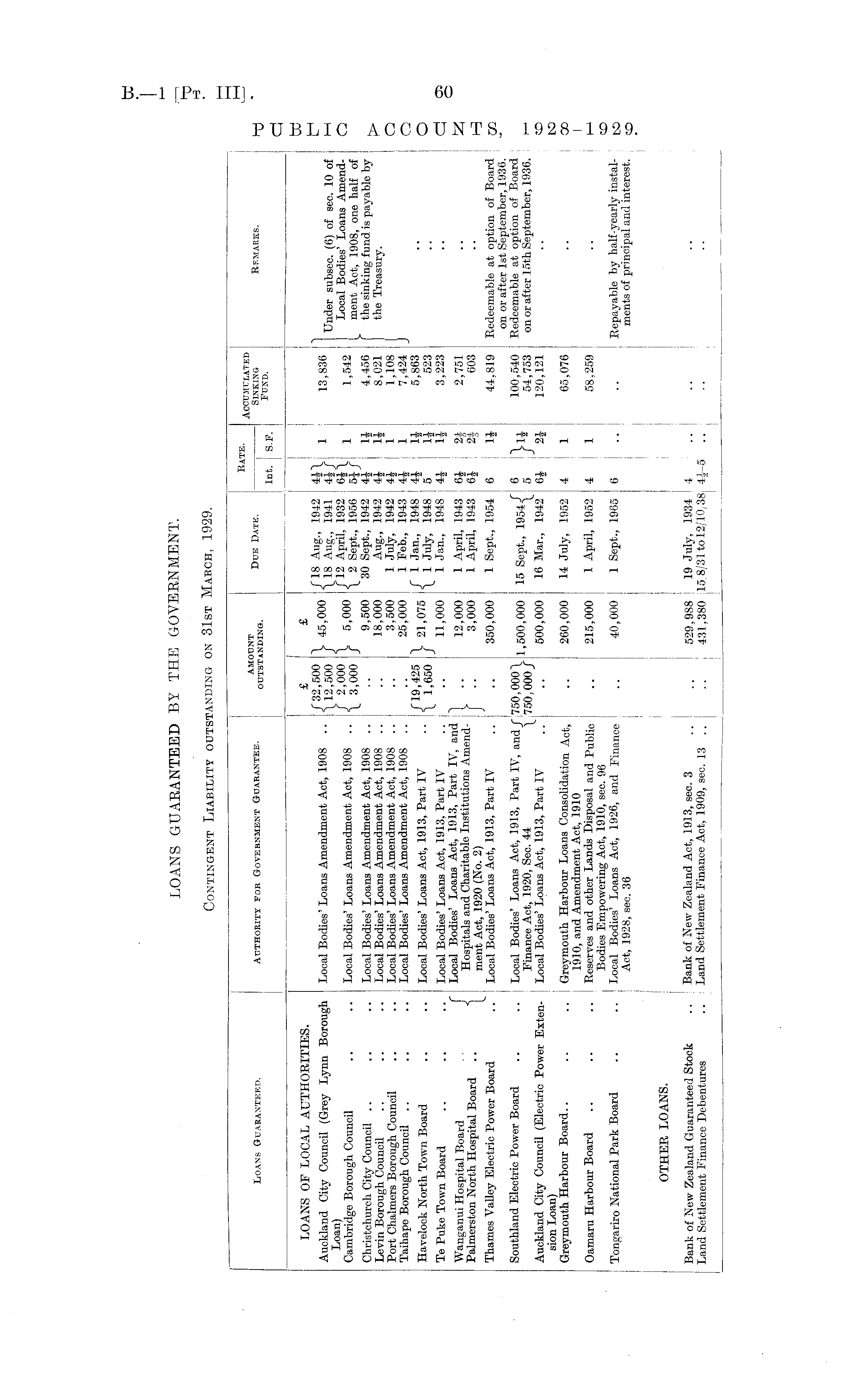 i amount RATE ' Accumulated Loans Guabanteed. Authority fob Government Guarantee. outstanding Due Date - Sinking Remarks. | Int. S.F. I ' UKD - . - -J LOANS OF LOCAL AUTHORITIES. £ £ Auckland City Council (Grey Lynn Borough Local Bodies' Loans Amendment Act, 1908 .. / 45 > 000 {lg 1941 4f/ 1 13,836 Under subsec. (6) of sec. 10 of Loan) t i t> j , t AJ+A4- inriQ / 2,000 \ - nf)fl /12 April, 1932 6|\ , , Local Bodies' Loans AmendCambndge Borough Council .. .. Local Bodies Loans Amendment Act, 1908 ••!■(_ 3>0 00 / 5 • 00 ° \ 2 Sept., 1956 5if 1 1:542 . ment Act, 1908, one half of Christchurch City Council .. .. .. Local Bodies' Loans Amendment Act, 1908 .. I .. 9,500 30 Sept., 1942 4£ 4,456 the sinking fund is payable by Levin Borough Council .. .. .. Local Bodies' Loans Amendment Act, 1908 .. | .. 18,000 Aug., 1942 4£ 8,021 the Treasury. Port Chalmers Borough Council .. .. Local Bodies' Loans Amendment Act, 1908 .. .. 3,500 1 July, 1942 4|- 1 1,108 Taihape Borough Council .. .. .. Local Bodies' Loans Amendment Act, 1908 .. 1 .. 25,000 1 Feb., 1943 4J 1 7,424 Havelock North Town Board .. .. Local Bodies' Loans Act, 1913, Part IV .. j 21,075 J 1948 5 2 1?Te Puke Town Board .. .. .. Local Bodies' Loans Act, 1913, Part IV .. j .. 11,000 1 Jan., 1948 3,223 Wanganui Hospital Board J Lo « l1 Bodies' Loans Act 1!) L3 Part IV, and _ 12>000 1 April, 1943 6| 2f 2,751 Palmerston North Hospital Board .. Hospitals ami ChOTrtable Institutions Amend- 11 3,000 1 April, 1943 6J 24 603 Thames Valley Electric Power Board .. Local Bodies' Loans Act, 1913, Part IV .. j .. 350,000 1 Sept., 1954 6 1J 44,819 Redeemable at option of Board on or after 1st September, 1936. Southland Electric Power Board .. .. Local Bodies' Loans Act, 1913, Part IV, and J" 750, 000 \ , ™ nnn lt; o + 1Q 6 \ n 100,540 Redeemable at option of Board Finance Act, 1920, Sec. 44 1 750,000/ ' ' ® / 54,753 on or after 15th September, 1936. Auckland City Council (Electric Power Exten- Local Bodies' Loans Act, 1913, Part IV .. .. 500,000 16 Mar., 1942 6| 2J 120,121 sion Loan) Greymouth Harbour Board.. .. .. Greymouth Harbour Loans Consolidation Act, .. 260,000 14 July, 1952 4 1 65,076 1910, and Amendment Act, 1910 Oamaru Harbour Board .. .. .. Reserves and other Lands Disposal and Public .. 215,000 1 April, 1952 4 1 58,259 Bodies Empowering Act, 1910, sec. 96 Tongariro National Park Board .. .. Local Bodies' Loans Act, 1926, and Finance .. 40,000 1 Sept., 1965 6 .. .. Repayable by half-yearly instalAct, 1928, sec. 36 ments of principal and interest. OTHER LOANS. ' ! Bank of New Zealand Guaranteed Stock .. Bank of New Zealand Act, 1913, sec. 3 .. .. 529,988 19 July, 1934 4 j Land Settlement Finance Debentures .. Land Settlement Finance Act, 1909, sec. 13 .. j .. 431,380 15,8/31 to 12/10/38 4^—5 I I I | ;
