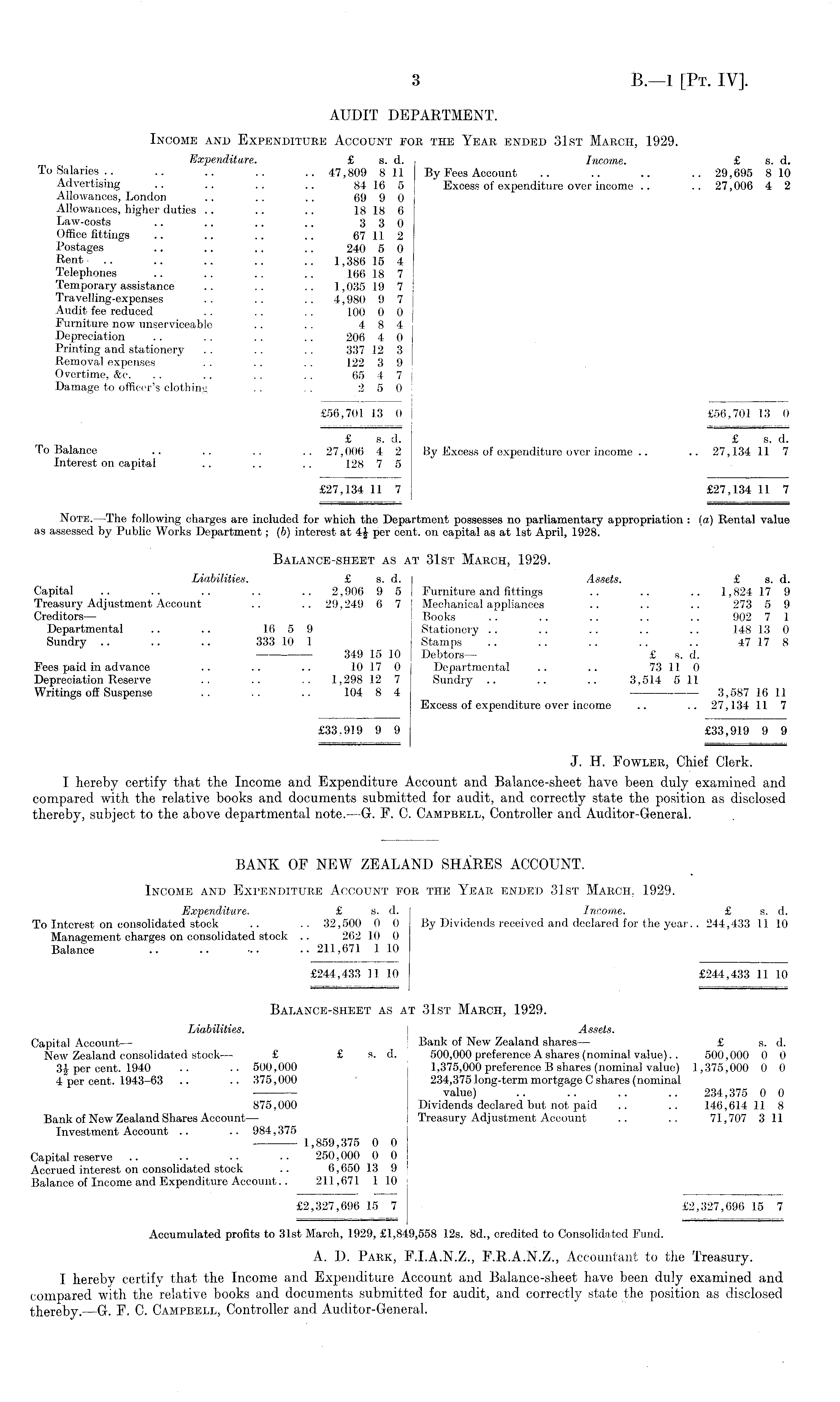 AUDIT DEPARTMENT. Income and Expenditure Account fob the Year ended 31st March, 1929. Expenditure. £ s. d. Income. £ s. d. To Salaries.. .. .. .. .. 47,809 811 By Fees Account .. .. .. .. 29,695 810 Advertising .. .. .. .. 84 16 5 Excess of expenditure over income .. .. 27,006 4 2 Allowances, London .. .. .. 69 9 0 Allowances, higher duties .. .. .. 18 18 6 Law-costs .. .. .. .. 3 3 0 Office fittings .. .. .. .. 67 11 2 Postages .. .. .. .. 240 5 0 Rent- .. .. .. .. .. 1,386 15 4 Telephones .. .. .. .. 166 18 7 Temporary assistance .. .. .. 1,035 19 7 Travelling-expenses .. .. .. 4,980 9 7 Audit fee reduced .. .. . . 100 0 0 Furniture now unserviceable .. .. 4 8 4 Depreciation .. . . .. .. 206 4 0 Printing and stationery . . .. .. 337 12 3 Removal expenses .. .. .. 122 3 9 Overtime, &c. .. .. .. .. 65 4 7 Damage to officer's clothing .. . . 2 5 0 £56,701 13 0 £56,701 13 0 £ s. d. £ s. d. To Balance .. .. .. .. 27,006 4 2 By Excess of expenditure over income .. .. 27,134 11 7 Interest on capital .. .. .. 128 7 5 £27,134 11 7 £27,134 11 7 Note. —The following charges are included for which the Department possesses no parliamentary appropriation : la) Rental value as assessed by Public Works Department; (ft) interest at 4J per cent, on capital as at Ist April, 1928. Balance-sheet as at 31st March, 1929. Liabilities. £ s. d. Assets. £ s. d. Capital .. .. .. .. .. 2,906 9 5 Furniture and fittings .. .. .. 1,824 17 9 Treasury Adjustment Account .. .. 29,249 6 7 Mechanical appliances .. .. .. 273 5 9 Creditors — Books .. .. .. .. .. 902 7 1 Departmental .. .. 16 5 9 Stationery .. .. .. .. .. 148 13 0 Sundry .. .. .. 333 10 1 Stamps .. .. .. .. .. 47 17 8 ■ 349 15 10 Debtors — £ s. d. Fees paid in advance .. .. .. 10 17 0 Departmental .. .. 73 11 0 Depreciation Reserve .. .. .. 1,298 12 7 Sundry .. .. .. 3,514 511 Writings off Suspense .. . . .. 104 8 4 3,587 16 11 Excess of expenditure over income .. .. 27,134 11 7 £33,919 9 9 £33,919 9 9 J. H. Fowler, Chief Clerk. I hereby certify that the Income and Expenditure Account and Balance-sheet have been duly examined and compared with the relative books and documents submitted for audit, and correctly state the position as disclosed thereby, subject to the above departmental note. —G. F. C. Campbell, Controller and Auditor-General. BANK OF NEW ZEALAND SHARES ACCOUNT. Income and Expenditure Account for the Year ended 31st March, 1929. Expenditure. £ s. d. Income. £ s. d. To Interest on consolidated stock .. .. 32,500 0 0 By Dividends received and declared for the year.. 244,433 11 10 Management charges on consolidated stock .. 262 10 0 Balance 211,671 1 10 £244,433 11 10 £244,433 11 10 Balance-sheet as at 31st March, 1929. Liabilities. Assets. Capital Account — Bank of New Zealand shares — £ s. d. New Zealand consolidated stock — £ £ s. d. 500,000 preference A shares (nominal value).. 500,000 0 0 per cent. 1940 .. .. 500,000 1,375,000 preference B shares (nominal value) 1,375,000 0 0 4"per cent. 1943-63 .. .. 375,000 234,375 long-term mortgage C shares (nominal — value) .. .. .. .. 234,375 0 0 875,000 Dividends declared but not paid .. .. 146,614 11 8 Bank of New Zealand Shares Account — Treasury Adjustment Account .. .. 71,707 3 11 Investment Account .. .. 984,375 1,859,375 0 0 Capital reserve .. .. • • ■ ■ 250, 000 0 0 Accrued interest on consolidated stock .. 6,650 13 9 Balance of Income and Expenditure Account.. 211,671 1 10 £2,327,696 15 7 £2,327,696 15 7 Accumulated profits to 31st March, 1929, £1,849,558 12s. Bd., credited to Consolidated Fund. A. I). Park, F.1.A.N.Z., F.R.A.N.Z., Accountant to the Treasury. I hereby certify that the Income and Expenditure Account and Balance-sheet have been duly examined and compared with the relative books and documents submitted for audit, and correctly state the position as disclosed thereby. —G. F. C. Campbell, Controller and Auditor-General.