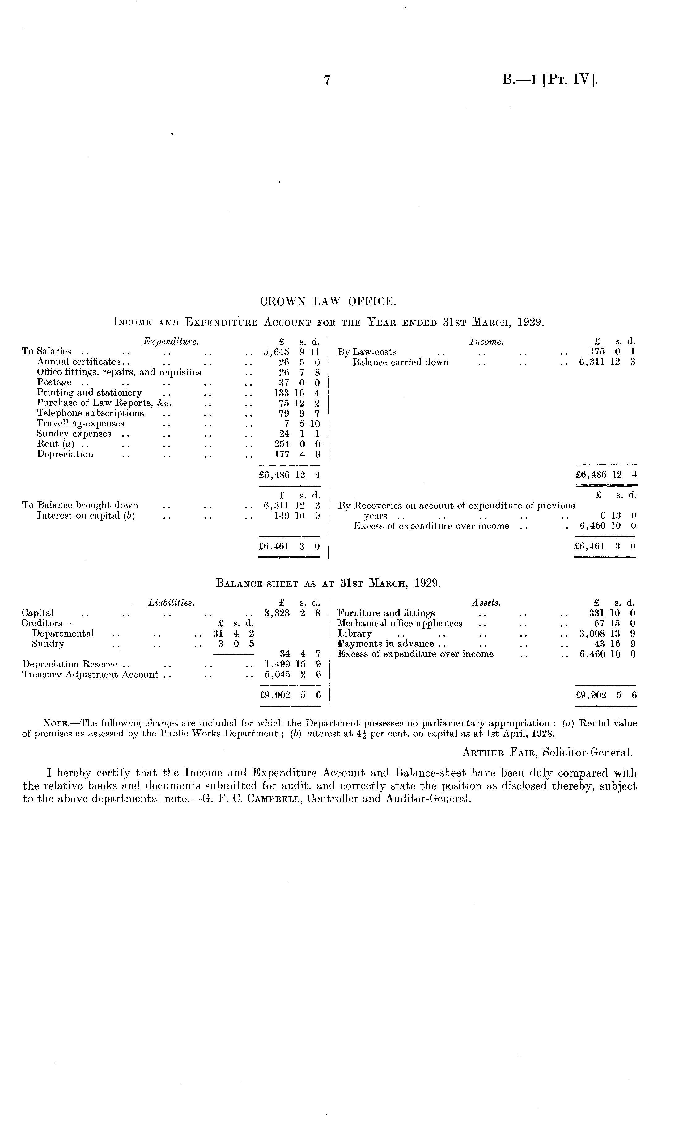 CROWN LAW OFFICE. Income and Expenditure Account for the Year ended 31st March, 1929. Expenditure. £ s. d. Income. £ s. d. To Salaries .. .. .. .. .. 5,645 911 By Law-costs .. .. .. .. 175 0 1 Annual certificates.. .. .. .. 26 5 0 Balance carried down .. .. .. 6,311 12 3 Office fittings, repairs, and requisites .. 26 7 8 Postage .. .. .. .. .. 37 0 0 Printing and stationery .. .. .. 133 16 4 Purchase of Law Reports, &c. .. .. 75 12 2 Telephone subscriptions .. .. .. 79 9 7 Travelling-expenses .. .. .. 7 5 10 Sundry expenses .. .. .. .. 24 1 1 Rent (a) .. .. .. .. .. 254 0 0 Depreciation .. .. .. .. 177 4 9 £6,486 12 4 £6,486 12 4 £ s. d. £ s. d. To Balance brought down .. .. .. 6,311 12 3 By Recoveries on account of expenditure of previous Interest on capital (b) .. .. .. 149 10 9 years .. .. .. .. .. 0 13 0 Excess of expenditure over income .. .. 6,460 10 0 £6,461 3 0 £6,461 3 0 Balance-sheet as at 31st March, 1929. Liabilities. £ s. d. Assets. £ s. d. Capital .. .. .. .. .. 3,323 2 8 Furniture and fittings .. .. .. 331 10 0 Creditors— £ s. d. Mechanical office appliances .. .. .. 57 15 0 Departmental .. .. 31 4 2 Library .. .. .. .. .. 3,008 13 9 Sundry .. .. .. 3 0 5 Payments in advance .. .. .. .. 43 16 9 34 4 7 Excess of expenditure over income .. .. 6,460 10 0 Depreciation Reserve .. .. .. .. 1,499 15 9 Treasury Adjustment Account .. .. .. 5,045 2 6 £9,902 5 6 £9,902 5 6 Note.—The following charges are included for which the Department possesses no parliamentary appropriation : (a) Rental value of premises as assessed by the Public Works Department; (b) interest at 4| per cent, on capital as at Ist April, 1928. Arthur Fair, Solicitor-General. I hereby certify that the Income and Expenditure Account and Balance-sheet have been duly compared with the relative books and documents submitted for audit, and correctly state the position as disclosed thereby, subject to the above departmental note. —G. F. C. Campbell, Controller and Auditor-General.