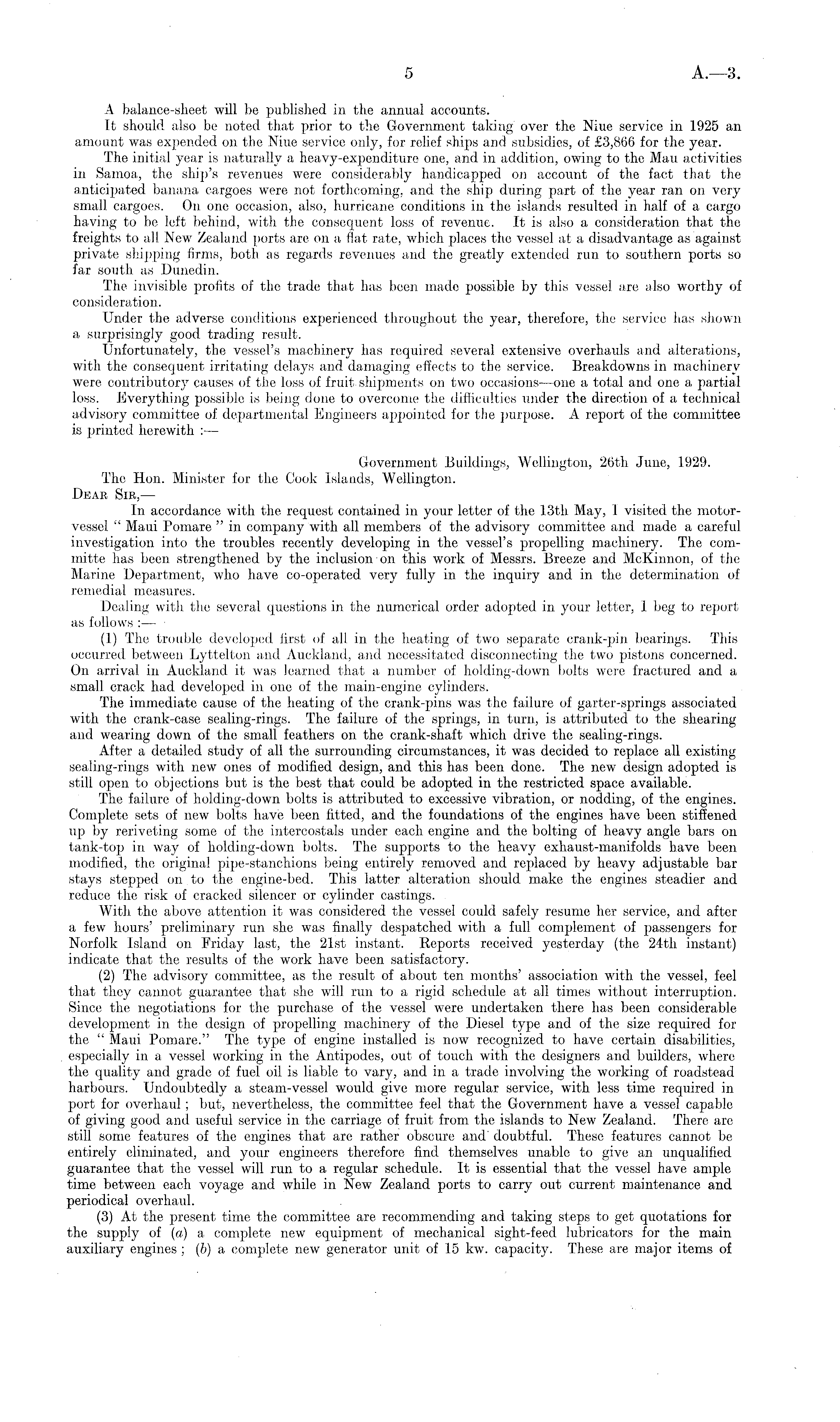 A balance-sheet will be published in the annual accounts. It should also be noted that prior to the Government taking' over the Niue service in 1925 an amount was expended on the Niue service only, for relief ships and subsidies, of £3,866 for the year. The initial year is naturally a heavy-expenditure one, and in addition, owing to the Mau activities in Samoa, the ship's revenues were considerably handicapped on account of the fact that the anticipated banana cargoes were not forthcoming, and the ship during part of the year ran on very small cargoes. On one occasion, also, hurricane conditions in the islands resulted in half of a cargo having to be left behind, with the consequent loss of revenue. It is also a consideration that the freights to all New Zealand ports are on a flat rate, which places the vessel at a disadvantage as against private shipping firms, both as regards revenues and the greatly extended run to southern ports so far south as Dunedin. The invisible profits of the trade that has been made possible by this vessel are also worthy of consideration. Under the adverse conditions experienced throughout the year, therefore, the service has shown a surprisingly good trading result. Unfortunately, the vessel's machinery has required several extensive overhauls and alterations, with the consequent irritating delays and damaging effects to the service. Breakdowns in machinery were contributory causes of the loss of fruit shipments on two occasions—one a total and one a partial loss. Everything possible is being done to overcome the difficulties under the direction of a technical advisory committee of departmental Engineers appointed for the purpose. A report of the committee is printed herewith : — Government Buildings, Wellington, 26th June, 1929. The Hon. Minister for the Cook Islands, Wellington. Dbak SIB, — In accordance with the request contained in your letter of the 13th May, I visited the motorvessel " Maui Pomare " in company with all members of the advisory committee and made a careful investigation into the troubles recently developing in the vessel's propelling machinery. The committe has been strengthened by the inclusion on this work of Messrs. Breeze and McKinnon, of the Marine Department, who have co-operated very fully in the inquiry and in the determination of remedial measures. Dealing with the several questions in the numerical order adopted in your letter, I beg to report as follows : — • (1) The trouble developed first of all in the heating of two separate crank-pin bearings. This occurred between Lyttelton and Auckland, and necessitated disconnecting the two pistons concerned. On arrival in Auckland it was learned that a number of holding-down bolts were fractured and a small crack had developed in one of the main-engine cylinders. The immediate cause of the heating of the crank-pins was the failure of garter-springs associated with the crank-case sealing-rings. The failure of the springs, in turn, is attributed to the shearing and wearing down of the small feathers on the crank-shaft which drive the sealing-rings. After a detailed study of all the surrounding circumstances, it was decided to replace all existing sealing-rings with new ones of modified design, and this has been done. The new design adopted is still open to objections but is the best that could be adopted in the restricted space available. The failure of holding-down bolts is attributed to excessive vibration, or nodding, of the engines. Complete sets of new bolts have been fitted, and the foundations of the engines have been stiffened up by reriveting some of the intercostals under each engine and the bolting of heavy angle bars on tank-top in way of holding-down bolts. The supports to the heavy exhaust-manifolds have been modified, the original pipe-stanchions being entirely removed and replaced by heavy adjustable bar stays stepped on to the engine-bed. This latter alteration should make the engines steadier and reduce the risk of cracked silencer or cylinder castings. With the above attention it was considered the vessel could safely resume her service, and after a few hours' preliminary run she was finally despatched with a full complement of passengers for Norfolk Island on Friday last, the 21st instant. Reports received yesterday (the 24th instant) indicate that the results of the work have been satisfactory. (2) The advisory committee, as the result of about ten months' association with the vessel, feel that they cannot guarantee that she will run to a rigid schedule at all times without interruption. Since the negotiations for the purchase of the vessel were undertaken there has been considerable development in the design of propelling machinery of the Diesel type and of the size required for the " Maui Pomare." The type of engine installed is now recognized to have certain disabilities, especially in a vessel working in the Antipodes, out of touch with the designers and builders, where the quality and grade of fuel oil is liable to vary, and in a trade involving the working of roadstead harbours. Undoubtedly a steam-vessel would give more regular service, with less time required in port for overhaul ; but, nevertheless, the committee feel that the Government have a vessel capable of giving good and useful service in the carriage of fruit from the islands to New Zealand. There are still some features of the engines that are rather obscure and' doubtful. These features cannot be entirely eliminated, and your engineers therefore find themselves unable to give an unqualified guarantee that the vessel will run to a regular schedule. It is essential that the vessel have ample time between each voyage and while in New Zealand ports to carry out current maintenance and periodical overhaul. (3) At the present time the committee are recommending and taking steps to get quotations for the supply of (a) a complete new equipment of mechanical sight-feed lubricators for the main a