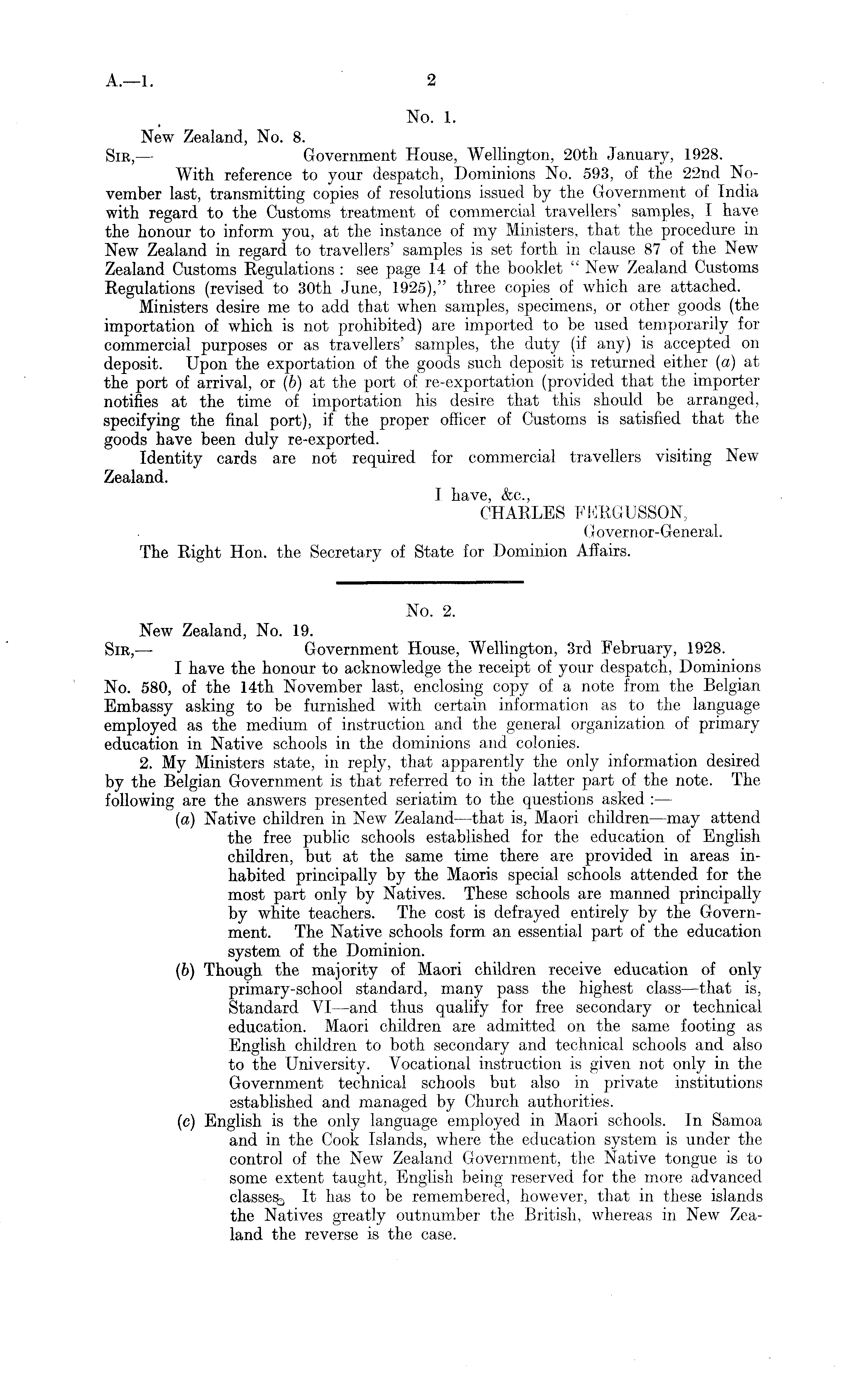 No. 2. New Zealand, No. 19. Sir,— Government House, Wellington, 3rd February, 1928. I have the honour to acknowledge the receipt of your despatch, Dominions No. 580, of the 14th November last, enclosing copy of a note from the Belgian Embassy asking to be furnished with certain information as to the language employed as the medium of instruction and the general organization of primary education in Native schools in the dominions and colonies. 2. My Ministers state, in reply, that apparently the only information desired by the Belgian Government is that referred to in the latter part of the note. The following are the answers presented seriatim to the questions asked : — (a) Native children in New Zealand —that is, Maori children —may attend the free public schools established for the education of English children, but at the same time there are provided in areas inhabited principally by the Maoris special schools attended for the most part only by Natives. These schools are manned principally by white teachers. The cost is defrayed entirely by the Government. The Native schools form an essential part of the education system of the Dominion. (b) Though the majority of Maori children receive education of only primary-school standard, many pass the highest class —that is, Standard VI —and thus qualify for free secondary or technical education. Maori children are admitted on the same footing as English children to both secondary and technical schools and also to the University. Vocational instruction is given not only in the Government technical schools but also in private institutions established and managed by Church authorities. (c) English is the only language employed in Maori schools. In Samoa and in the Cook Islands, where the education system is under the control of the New Zealand Government, the Native tongue is to some extent taught, English being reserved for the more advanced classes It has to be remembered, however, that in these islands the Natives greatly outnumber the British, whereas in New Zealand the reverse is the case.