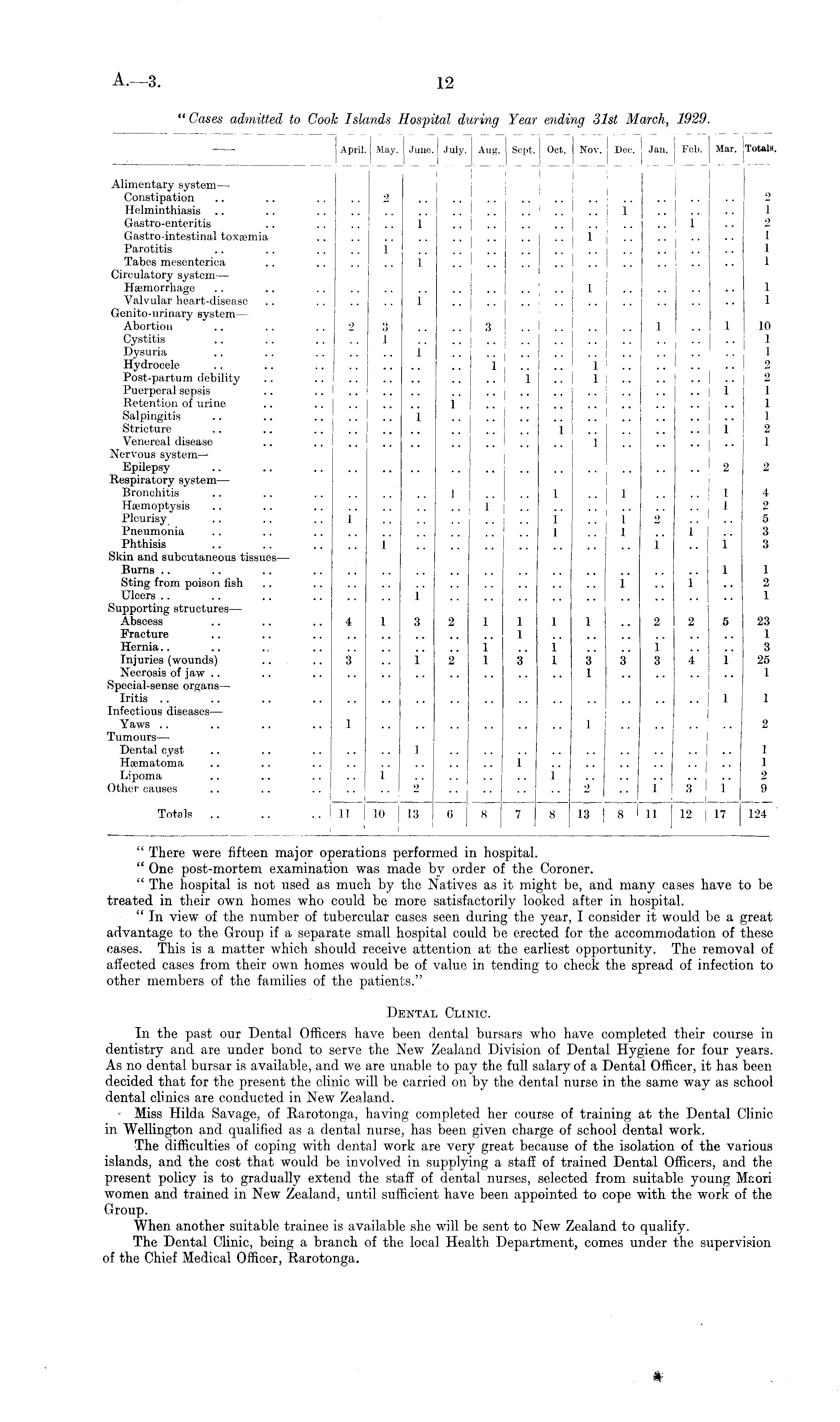 " There were fifteen major operations performed in hospital. " One post-mortem examination was made by order of the Coroner. " The hospital is not used as much by the Natives as it might be, and many oases have to be treated in their own homes who could be more satisfactorily looked after in hospital. " In view of the number of tubercular cases seen during the year, I consider it would be a great advantage to the Group if a separate small hospital could be erected for the accommodation of these cases. This is a matter which should receive attention at the earliest opportunity. The removal of affected cases from their own homes would be of value in tending to check the spread of infection to other members of the families of the patients." Dental Clinic. In the past our Dental Officers have been dental bursars who have completed their course in dentistry and are under bond to serve the New Zealand Division of Dental Hygiene for four years. As no dental bursar is available, and we are unable to pay the full salary of a Dental Officer, it has been decided that for the present the clinic will be carried on by the dental nurse in the same way as school dental clinics are conducted in New Zealand. Miss Hilda Savage, of Rarotonga, having completed her course of training at the Dental Clinic in Wellington and qualified as a dental nurse, has been given charge of school dental work. The difficulties of coping with dental work are very great because of the isolation of the various islands, and the cost that would be involved in supplying a staff of trained Dental Officers, and the present policy is to gradually extend the staff of dental nurses, selected from suitable young Maori women and trained in New Zealand, until sufficient have been appointed to cope with the work of the Group. When another suitable trainee is available she will be sent to New Zealand to qualify. The Dental Clinic, being a branch of the local Health Department, comes under the supervision of the Chief Medical Officer, Rarotonga.