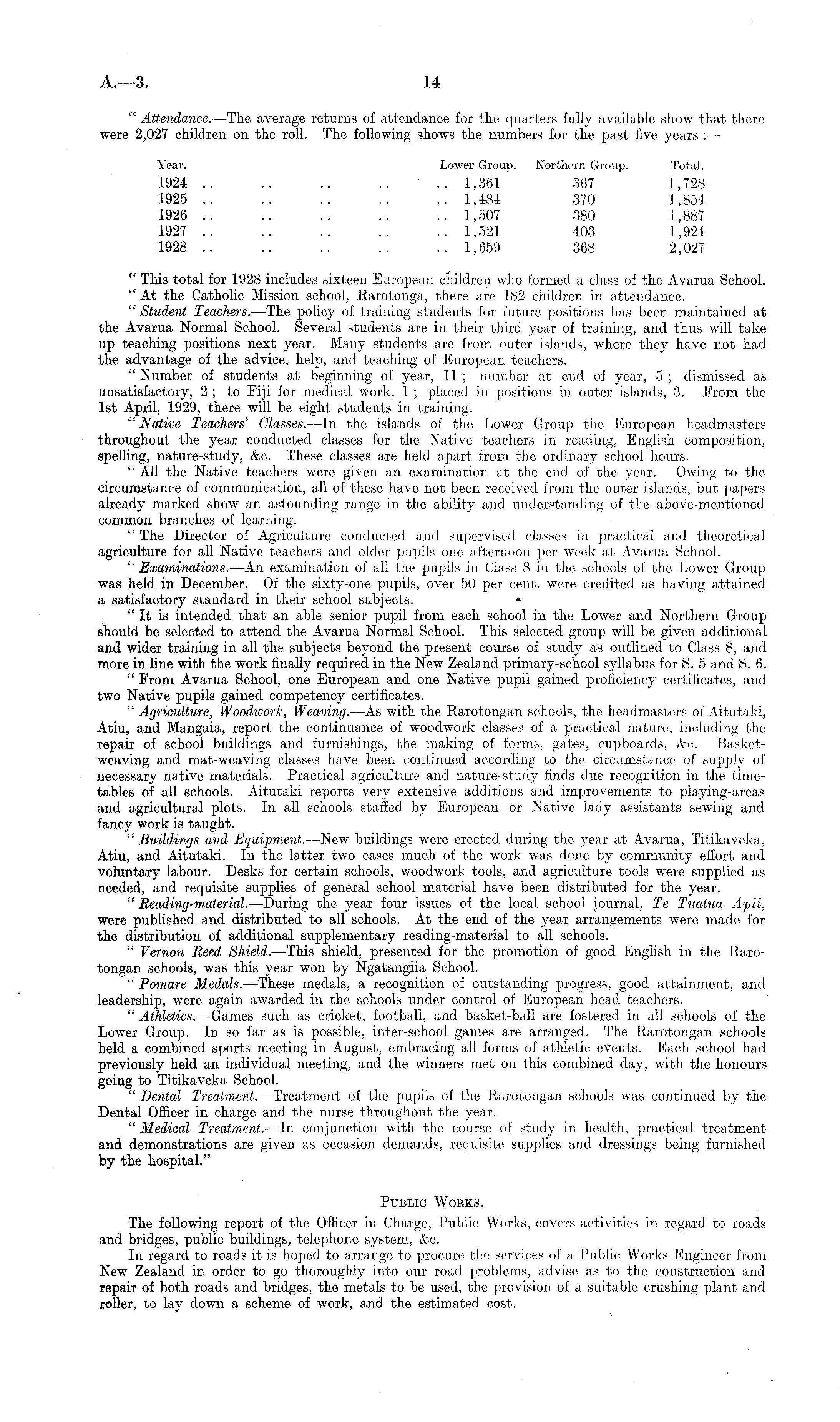 " Attendance. —The average returns of attendance for the quarters fully available show that there were 2,027 children on the roll. The following shows the numbers for the past five years : — Year. Lower Group. Northern Group. Total. 1924 .. .. .. .. .. 1,361 367 1,728 1925 .. .. .. .. .. 1,484 370 1,854 1926 .. .. .. .. .. 1,507 380 1,887 1927 .. .. .. .. .. 1,521 403 1,924 1928 .. .. .. .. .. 1,659 368 2,027 " This total for 1928 includes sixteen European children who formed a class of the Avarua School. " At the Catholic Mission school, Rarotonga, there are 182 children in attendance. " Student Teachers.—The policy of training students for future positions has been maintained at the Avarua Normal School. Several students are in their third year of training, and thus will take up teaching positions next year. Many students are from outer islands, where they have not had the advantage of the advice, help, and teaching of European teachers. " Number of students at beginning of year, 11 ; number at end of year, 5 ; dismissed as unsatisfactory, 2 ; to Fiji for medical work, 1 ; placed in positions in outer islands, 3. From the Ist April, 1929, there will be eight students in training. " Native Teachers' Classes. —In the islands of the Lower Group the European headmasters throughout the year conducted classes for the Native teachers in reading, English composition, spelling, nature-study, &c. These classes are held apart from the ordinary school hours. " All the Native teachers were given an examination at the end of the year. Owing to the circumstance of communication, all of these have not been received from the outer islands, but papers already marked show an astounding range in the ability and understanding of the above-mentioned common branches of learning. " The Director of Agriculture conducted and supervised classes in practical and theoretical agriculture for all Native teachers and older pupils one afternoon per week at Avarua School. " Examinations. —An examination of all the pupils in Class 8 in the schools of the Lower Group was held in December. Of the sixty-one pupils, over 50 per cent, were credited as having attained a satisfactory standard in their school subjects. "It is intended that an able senior pupil from each school in the Lower and Northern Group should be selected to attend the Avarua Normal School. This selected group will be given additional and wider training in all the subjects beyond the present course of study as outlined to Class 8, and more in line with the work finally required in the New Zealand primary-school syllabus for S. 5 and S. 6. " From Avarua School, one European and one Native pupil gained proficiency certificates, and two Native pupils gained competency certificates. " Agriculture, Woodwork, Weaving. —As with the Rarotongan schools, the headmasters of Aitutaki, Atiu, and Mangaia, report the continuance of woodwork classes of a practical nature, including the repair of school buildings and furnishings, the making of forms, gates, cupboards, &c. Basketweaving and mat-weaving classes have been continued according to the circumstance of supply of necessary native materials. Practical agriculture and nature-study finds due recognition in the timetables of all schools. Aitutaki reports very extensive additions and improvements to playing-areas and agricultural plots. In all schools staffed by European or Native lady assistants sewing and fancy work is taught. " Buildings and Equipment.—New buildings were erected during the year at Avarua, Titikaveka, Atiu, and Aitutaki. In the latter two cases much of the work was done by community effort and voluntary labour. Desks for certain schools, woodwork tools, and agriculture tools were supplied as needed, and requisite supplies of general school material have been distributed for the year. " Reading-material. —During the year four issues of the local school journal, Te Tuatua Apii, were published and distributed to all schools. At the end of the year arrangements were made for the distribution of additional supplementary reading-material to all schools. " Vernon Reed Shield. —This shield, presented for the promotion of good English in the Rarotongan schools, was this year won by Ngatangiia School. " Pomare Medals. —These medals, a recognition of outstanding progress, good attainment, and leadership, were again awarded in the schools under control of European head teachers. " Athletics. —Games such as cricket, football, and basket-ball are fostered in all schools of the Lower Group. In so far as is possible, inter-school games are arranged. The Rarotongan schools held a combined sports meeting in August, embracing all forms of athletic events. Each school had previously held an individual meeting, and the winners met on this combined day, with the honours going to Titikaveka School. " Dental Treatment.—Treatment of the pupils of the Rarotongan schools was continued by the Dental Officer in charge and the nurse throughout the year. " Medical Treatment. —In conjunction with the course of study in health, practical treatment and demonstrations are given as occasion demands, requisite supplies and dressings being furnished by the hospital." Public Works. The following report of the Officer in Charge, Public Works, covers activities in regard to roads and bridges, public buildings, telephone system, &c. In regard to roads it is hoped to arrange to procure the services of a Public Works Engineer from New Zealand in order to go thoroughly into our road problems, advise as to the construction and repair of both roads and bridges, the metals to be used, the provision of a suitable crushing plant and roller, to lay down a scheme of work, and the estimated cost.