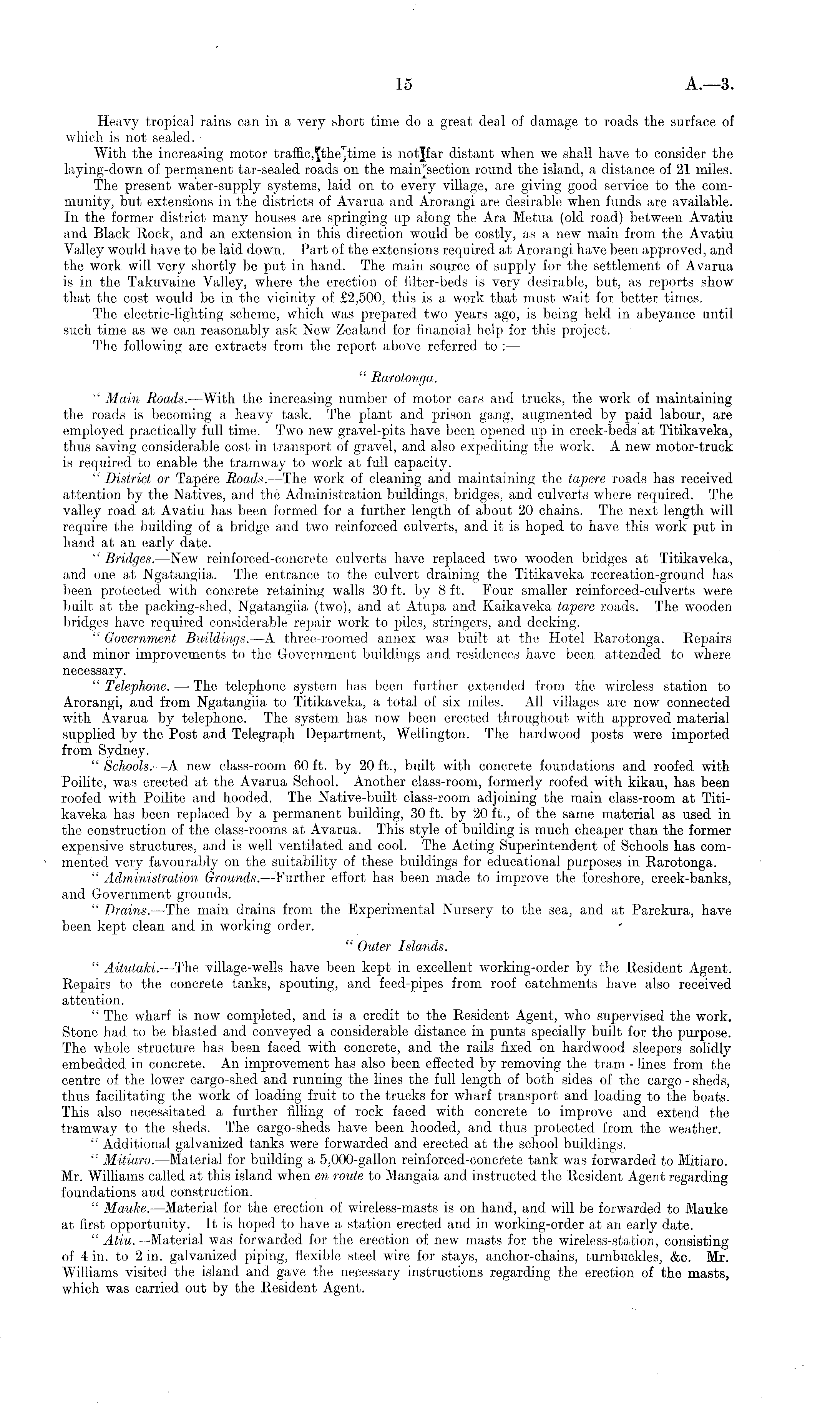 Heavy tropical rains can in a very .short time do a great deal of damage to roads the surface of which is not sealed. With the increasing motor is notjfar distant when we shall have to consider the laying-down of permanent tar-sealed roads on the main*section round the island, a distance of 21 miles. The present water-supply systems, laid on to every village, are giving good service to the community, but extensions in the districts of Avarua and Arorangi are desirable when funds are available. In the former district many houses are springing up along the Ara Metua (old road) between Avatiu and Black Rock, and an extension in this direction would be costly, as a new main from the Avatiu Valley would have to be laid down. Part of the extensions required at Arorangi have been approved, and the work will very shortly be put in hand. The main source of supply for the settlement of Avarua is in the Takuvaine Valley, where the erection of filter-beds is very desirable, but, as reports show that the cost would be in the vicinity of £2,500, this is a work that must wait for better times. The electric-lighting scheme, which was prepared two years ago, is being held in abeyance until such time as we can reasonably ask New Zealand for financial help for this project. The following are extracts from the report above referred to : — " Rarotonga. " Main Roads.—With the increasing number of motor cars and trucks, the work of maintaining the roads is becoming a heavy task. The plant and prison gang, augmented by paid labour, are employed practically full time. Two new gravel-pits have been opened up in creek-beds at Titikaveka, thus saving considerable cost in transport of gravel, and also expediting the work. A new motor-truck is required to enable the tramway to work at full capacity. " District or Tapere Roads.—The work of cleaning and maintaining the tapere roads has received attention by the Natives, and the Administration buildings, bridges, and culverts where required. The valley road at Avatiu has been formed for a further length of about 20 chains. The next length will require the building of a bridge and two reinforced culverts, and it is hoped to have this work put in hand at an early date. " Bridges.—New reinforced-concrete culverts have replaced two wooden bridges at Titikaveka, and one at Ngatangiia. The entrance to the culvert draining the Titikaveka recreation-ground has been protected with concrete retaining walls 30 ft. by 8 ft. Four smaller reinforced-culverts were built at the packing-shed, Ngatangiia (two), and at At.upa and Kaikaveka tapere roads. The wooden bridges have required considerable repair work to piles, stringers, and decking. " Government Buildings. —A three-roomed annex was built at the Hotel Earotonga. Repairs and minor improvements to the Government buildings and residences have been attended to where necessary. " Telephone. — The telephone system has been further extended from the wireless station to Arorangi, and from Ngatangiia to Titikaveka, a total of six miles. All villages are now connected with Avarua by telephone. The system has now been erected throughout with approved material supplied by the Post and Telegraph Department, Wellington. The hardwood posts were imported from Sydney. " Schools. —A new class-room 60 ft. by 20 ft., built with concrete foundations and roofed with Poilite, was erected at the Avarua School. Another class-room, formerly roofed with kikau, has been roofed with Poilite and hooded. The Native-built class-room adjoining the main class-room at Titikaveka has been replaced by a permanent building, 30 ft. by 20 ft., of the same material as used in the construction of the class-rooms at Avarua. This style of building is much cheaper than the former expensive structures, and is well ventilated and cool. The Acting Superintendent of Schools has commented very favourably on the suitability of these buildings for educational purposes in Rarotonga. " Administration Grounds. —Further effort has been made to improve the foreshore, creek-banks, and Government grounds. " Drains. —The main drains from the Experimental Nursery to the sea, and at Parekura, have been kept clean and in working order. " Outer Islands. " AitutaTci. —The village-wells have been kept in excellent working-order by the Resident Agent. Repairs to the concrete tanks, spouting, and feed-pipes from roof catchments have also received attention. " The wharf is now completed, and is a credit to the Resident Agent, who supervised the work. Stone had to be blasted and conveyed a considerable distance in punts specially built for the purpose. The whole structure has been faced with concrete, and the rails fixed on hardwood sleepers solidly embedded in concrete. An improvement has also been effected by removing the tram - lines from the centre of the lower cargo-shed and running the lines the full length of both sides of the cargo - sheds, thus facilitating the work of loading fruit to the trucks for wharf transport and loading to the boats. This also necessitated a further filling of rock faced with concrete to improve and extend the tramway to the sheds. The cargo-sheds have been hooded, and thus protected from the weather. " Additional galvanized tanks were forwarded and erected at the school buildings. " Mitiaro. —Material for building a 5,000-gallon reinforced-concrete tank was forwarded to Mitiaro. Mr. Williams called at this island when en route to Mangaia and instructed the Resident Agent regarding foundations and construction. " Mauke.—Material for the erection of wireless-masts is on hand, and will be forwarded to Mauke at first opportunity. It is hoped to have a station erected and in working-order at an early date. " Atiu. —Material was forwarded for the erection of new masts for the wireless-station, consisting of 4 in. to 2 in. galvanized piping, flexible steel wire for stays, anchor-chains, turnbuckles, &c. Mr. Williams visited the island and gave