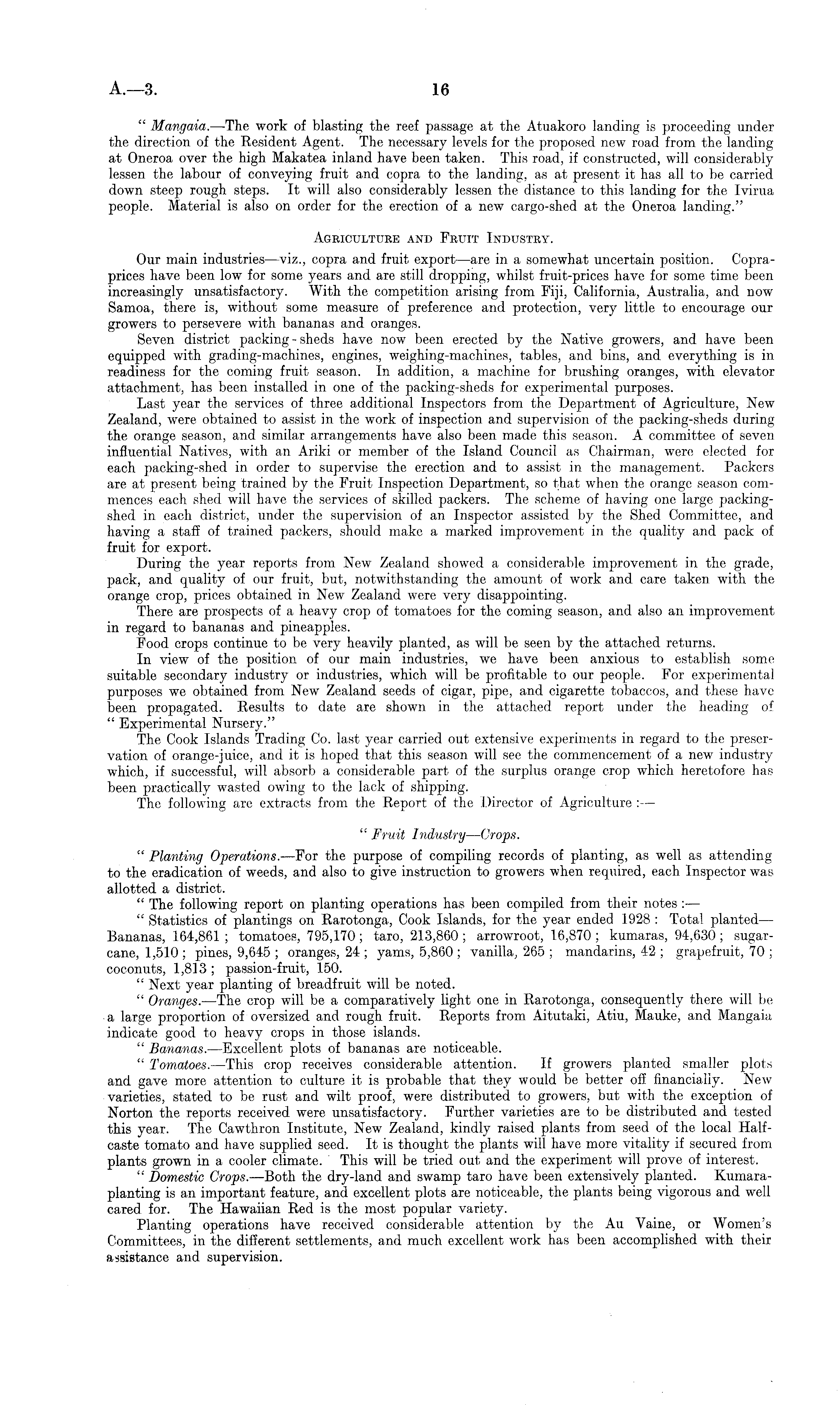 " Mangaia.—The work of blasting the reef passage at the Atuakoro landing is proceeding under the direction of the Resident Agent. The necessary levels for the proposed new road from the landing at Oneroa over the high Makatea inland have been taken. This road, if constructed, will considerably lessen the labour of conveying fruit and copra to the landing, as at present it has all to be carried down steep rough steps. It will also considerably lessen the distance to this landing for the Ivirua people. Material is also on order for the erection of a new cargo-shed at the Oneroa landing." Agriculture and Fruit Industry. Our main industries—viz., copra and fruit export —are in a somewhat uncertain position. Copraprices have been low for some years and are still dropping, whilst fruit-prices have for some time been increasingly unsatisfactory. With the competition arising from Fiji, California, Australia, and now Samoa, there is, without some measure of preference and protection, very little to encourage our growers to persevere with bananas and oranges. Seven district packing - sheds have now been erected by the Native growers, and have been equipped with grading-machines, engines, weighing-machines, tables, and bins, and everything is in readiness for the coming fruit season. In addition, a machine for brushing oranges, with elevator attachment, has been installed in one of the packing-sheds for experimental purposes. Last year the services of three additional Inspectors from the Department of Agriculture, New Zealand, were obtained to assist in the work of inspection and supervision of the packing-sheds during the orange season, and similar arrangements have also been made this season. A committee of seven influential Natives, with an Ariki or member of the Island Council as Chairman, were elected for each packing-shed in order to supervise the erection and to assist in the management. Packers are at present being trained by the Fruit Inspection Department, so that when the orange season commences each shed will have the services of skilled packers. The scheme of having one large packingshed in each district, under the supervision of an Inspector assisted by the Shed Committee, and having a staff of trained packers, should make a marked improvement in the quality and pack of fruit for export. During the year reports from New Zealand showed a considerable improvement in the grade, pack, and quality of our fruit, but, notwithstanding the amount of work and care taken with the orange crop, prices obtained in New Zealand were very disappointing. There are prospects of a heavy crop of tomatoes for the coming season, and also an improvement in regard to bananas and pineapples. Food crops continue to be very heavily planted, as will be seen by the attached returns. In view of the position of our main industries, we have been anxious to establish some suitable secondary industry or industries, which will be profitable to our people. For experimental purposes we obtained from New Zealand seeds of cigar, pipe, and cigarette tobaccos, and these have been propagated. Results to date are shown in the attached report under the heading of " Experimental Nursery." The Cook Islands Trading Co. last year carried out extensive experiments in regard to the preservation of orange-juice, and it is hoped that this season will see the commencement of a new industry which, if successful, will absorb a considerable part of the surplus orange crop which heretofore has been practically wasted owing to the lack of shipping. The following are extracts from the Report of the Director of Agriculture : — " Fruit Industry —Crops. " Planting Operations. —For the purpose of compiling records of planting, as well as attending to the eradication of weeds, and also to give instruction to growers when required, each Inspector was allotted a district. " The following report on planting operations has been compiled from their notes : — " Statistics of plantings on Rarotonga, Cook Islands, for the year ended 1928 : Total planted — Bananas, 164,861 ; tomatoes, 795,170; taro, 213,860 ; arrowroot, 16,870 ; kumaras, 94,630; sugarcane, 1,510 ; pines, 9,645 ; oranges, 24 ; yams, 5,860 ; vanilla, 265 ; mandarins, 42 ; grapefruit, 70 ; coconuts, 1,813 ; passion-fruit, 150. " Next year planting of breadfruit will be noted. " Oranges. —The crop will be a comparatively light one in Rarotonga, consequently there will be a large proportion of oversized and rough fruit. Reports from Aitutaki, Atiu, Mauke, and Mangaia indicate good to heavy crops in those islands. " Bananas. —Excellent plots of bananas are noticeable. " Tomatoes. —This crop receives considerable attention. If growers planted smaller plots and gave more attention to culture it is probable that they would be better off financially. New varieties, stated to be rust and wilt proof, were distributed to growers, but with the exception of Norton the reports received were unsatisfactory. Further varieties are to be distributed and tested this year. The Cawthron Institute, New Zealand, kindly raised plants from seed of the local Halfcaste tomato and have supplied seed. It is thought the plants will have more vitality if secured from plants grown in a cooler climate. This will be tried out and the experiment will prove of interest. " Domestic Crops. —Both the dry-land and swamp taro have been extensively planted. Kumaraplanting is an important feature, and excellent plots are noticeable, the plants being vigorous and well cared for. The Hawaiian Red is the most popular variety. Planting operations have received considerable attention by the Au Vaine, or Women's Committees, in the different settlements, and much excellent work has been accomplished with their assistance and supervision.