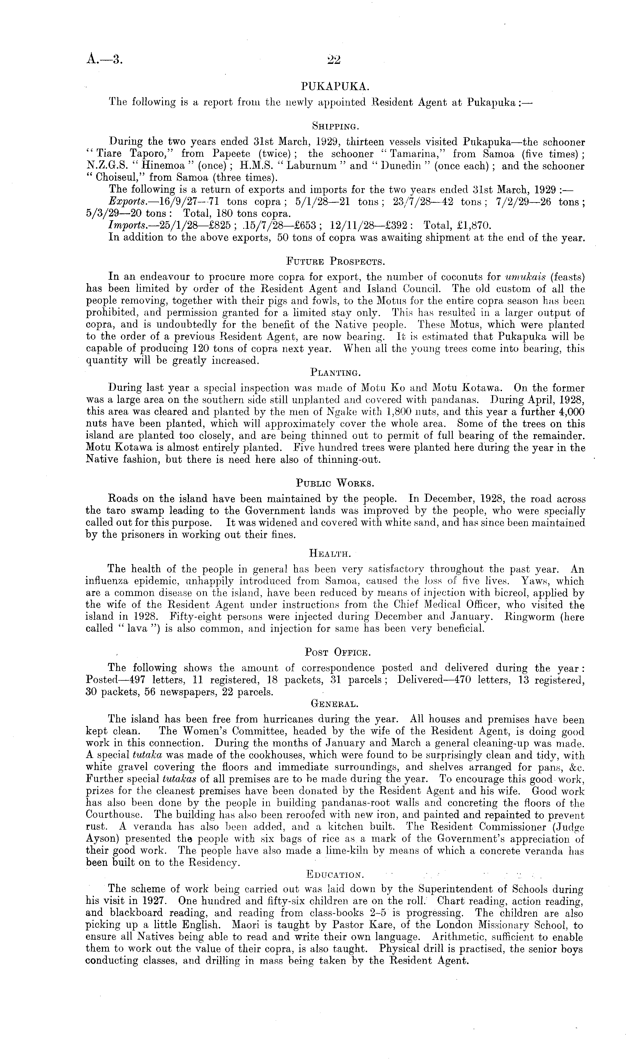 PUKAPUKA. The following is a report from the newly appointed Resident Agent at Pukapuka Shipping. During the two years ended 31st March, 1929, thirteen vessels visited Pukapuka—the schooner " Tiare Taporo," from Papeete (twice); the schooner " Tamarina," from Samoa (five times); N.Z.G.S. " Hinemoa " (once) ; H.M.S. " Laburnum " and " Dunedin " (once each) ; and the schooner " Choiseul," from Samoa (three times). The following is a return of exports and imports for the two years ended 31st March, 1929 : — Exports.—l 6/9/27—717 —71 tons copra; 5/1/28 —21 tons; 23/7/28 —42 tons; 7/2/29 —26 tons; 5/3/29 —20 tons : Total, 180 tons copra. Imports. —25/1/28 —£825 ; 15/7/28 —£653 ; 12/11/28—£392 : Total, £1,870. In addition to the above exports, 50 tons of copra was awaiting shipment at the end of the year. Future Prospects. In an endeavour to procure more copra for export, the number of coconuts for umukais (feasts) has been limited by order of the Resident Agent and Island Council. The old custom of all the people removing, together with their pigs and fowls, to the Motus for the entire copra season has been prohibited, and permission granted for a limited stay only. This has resulted in a larger output of copra, and is undoubtedly for the benefit of the Native people. These Motus, which were planted to the order of a previous Resident Agent, are now bearing. It is estimated that Pukapuka will be capable of producing 120 tons of copra next year. When all the young trees come into bearing, this quantity will be greatly increased. Planting. During last year a special inspection was made of Motu Ko and Motu Kotawa. On the former was a large area on the southern side still unplanted and covered with pandanas. During April, 1928, this area was cleared and planted by the men of Ngake with 1,800 nuts, and this year a further 4,000 nuts have been planted, which will approximately cover the whole area. Some of the trees on this island are planted too closely, and are being thinned out to permit of full bearing of the remainder. Motu Kotawa is almost entirely planted. Five hundred trees were planted here during the year in the Native fashion, but there is need here also of thinning-out. Public Works. Roads on the island have been maintained by the people. In December, 1928, the road across the taro swamp leading to the Government lands was improved by the people, who were specially called out for this purpose. It was widened and covered with white sand, and has since been maintained by the prisoners in working out their fines. Health. The health of the people in general has been very satisfactory throughout the past year. An influenza epidemic, unhappily introduced from Samoa, caused the loss of five lives. Yaws, which are a common disease on the island, have been reduced by means of injection with bicreol, applied by the wife of the Resident Agent under instructions from the Chief Medical Officer, who visited the island in 1928. Fifty-eight persons were injected during December and January. Ringworm (here called " lava ") is also common, and injection for same has been very beneficial. Post Office. The following shows the amount of correspondence posted and delivered during the year : Posted —497 letters, 11 registered, 18 packets, 31 parcels ; Delivered —470 letters, 13 registered, 30 packets, 56 newspapers, 22 parcels. General. The island has been free from hurricanes during the year. All houses and premises have been kept clean. The Women's Committee, headed by the wife of the Resident Agent, is doing good work in this connection. During the months of January and March a general cleaning-up was made. A special tutaka was made of the cookhouses, which were found to be surprisingly clean and tidy, with white gravel covering the floors and immediate surroundings, and shelves arranged for pans, &c. Further special tutakas of all premises are to be made during the year. To encourage this good work, prizes for the cleanest premises have been donated by the Resident Agent and his wife. Good work has also been done by the people in building pandanas-root walls and concreting the floors of the Courthouse. The building has also been reroofed with new iron, and painted and repainted to prevent rust. A veranda has also been added, and a kitchen built. The Resident Commissioner (Judge Ayson) presented the people with six bags of rice as a mark of the Government's appreciation of their good work. The people have also made a lime-kiln by means of which a concrete veranda has been built on to the Residency. Education. The scheme of work being carried out was laid down by the Superintendent of Schools during his visit in 1927. One hundred and fifty-six children are on the roll. Chart reading, action reading, and blackboard reading, and reading from class-books 2-5 is progressing. The children are also picking up a little English. Maori is taught by Pastor Kare, of the London Missionary School, to ensure all Natives being able to read and write their own language. Arithmetic, sufficient to enable them to work out the value of their copra, is also taught. Physical drill is practised, the senior boys conducting classes, and drilling in mass being taken by the Resident Agent.