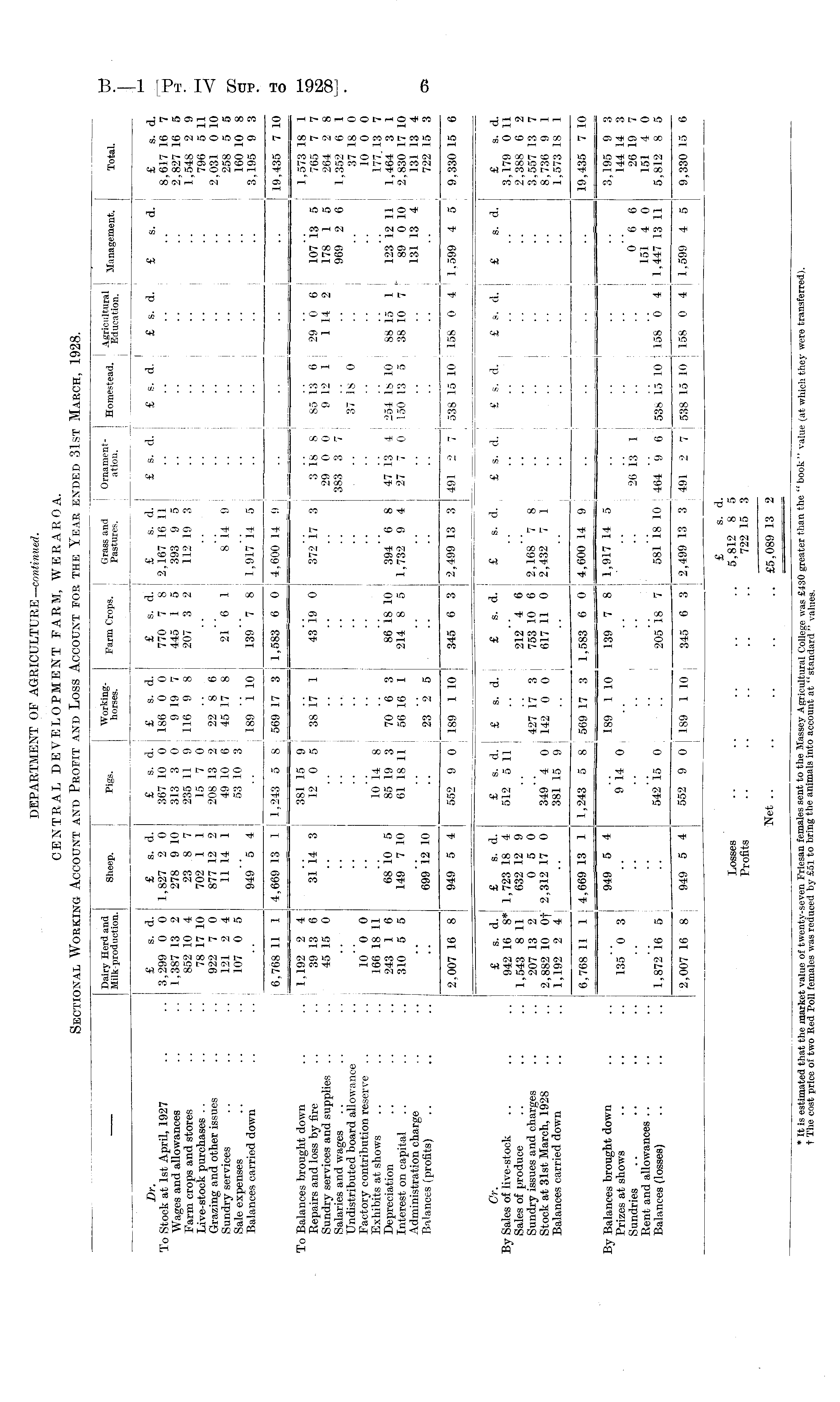 Dairy Herd and sh \ pi ! Working- | F c ' Grass and 1 Ornament- 1 Home5t . ad ! Agricultural! Tnj . nl Milk-production. bneep. Pigs. horses. | rops. Pastures. ation. Homestead. Education. Management. Total. | I Dr. £ s. d. £ s. d. £ s. d. £ s. d. £ s. d. £ s. d. £ s. d. £ s. d. £ s. d. £ s. d. £ s. d. To Stock at 1st April, 1927 .. .. 3,299 0 0 1,827 2 0 367 10 0 186 0 0 770 7 8 2,167 16 11 •• i •• .. 8,617 16 7 Wagesandallowane.es .. .. 1,387 13 2 278 9 10 313 3 0 9 19 7 445 1 5 393 9 5 .. .. .. .. 2,827 16 5 Farm crops and stores .. .. 852 10 4 23 8 7 235 11 9 116 9 8 207 3 2 112 19 3 .. j .. .. 1,548 2 9 Live-stock purchases .. .. .. 78 17 10 702 1 1 15 7 0 .. .. .. .. .. .. .. 796 5 11 Grazing and other issues .. .. 922 7 0 877 12 2 208 13 2 22 8 6 .. .. .. .. .. .. 2,031 0 10 Sundry services .. .. •• 121 2 4 11 14 1 49 10 6 45 17 8 21 6 1 8 14 9 .. i .. I .. .. 258 5 5 Sale expenses .. .. . • 107 0 5 .. 53 10 3 .. . • ■ . .. .. .. .. 160 10 8 Balances carried down .. . . .. 949 5 4 .. 189 1 10 139 7 8 1,917 14 5 ; .. .. j .. .. 3,195 9 3 6,768 11 1 4,669 13 1 1,243 5 8.569 17 3 1,583 6 0 4,600 14 9j .. .. .. .. 19,435 7 10 To Balances brought down .. .. 1.192 2 4 .. 381 15 9 .. •• .. .. .. .. 1,573 18 1 Repairs and loss by fire .. .. j 39 13 6 31 14 3 12 0 5 ! 38 17 1 43 19 0 372 17 3 3 18 8 85 13 6 ; 29 0 6 107 13 5, 765 7 7 Sundry services and supplies .. .. 45 15 0 .. .. .. .. .. 29 0 0 9 12 1 1 14 2 178 1 5 264 2 8 Salaries and wages .. .. .. .. •• •• .. •• 383 3 7 .. .. 969 261, 352 6 1 Undistributed board allowance .. .. •• .. .. .. 37 18 0 .. .. 37 18 0 Factory contribution reserve .. .. 10 00 .. .. .. .. .. . ■ . . .. .. 1000 Exhibits at shows .. .. .. 166 18 11 10 14 8 .. .. •• ! .. ! .. i .. 177.13 7 Depreciation .. .. .. 243 1 6 68 10 5 85 19 3 70 6 3 86 18 10 394 6 8 47 13 4 254 Is 10 88 15 1 123 12 11 1,464 3 1 Interest on capital .. .. .. 310 5 5 149 7 10 61 18 11 56 16 1 214 8 5 1,732 9 4 27 7 0 i 150 13 5 38 10 7 j 89 0 10 2,830 17 10 Administration charge .. .. .. • • .... . . .. . . . . . . 131 13 4 131 13 4 Balances (profits) .. .. .. .. 699 12 10 .. 23 2 5 .. .. .. . . .. .. 722 15 3 ___J i i 1 2,007 16 8 949 5 4 552 9 0 189 1 10 345 6 3 2,499 13 3 491 2 7 1 538 15 10 158 0 4 1 1,599 4 5 9,330 15 6 Or. £ s. d. £ s. d. £ s. d. £ s. d. £ s. d. £ s. d. £ s. d. £ s. d. £ s. d. £ s. d. £ s. d. By Sales of live-stock .. .. .. 942 16 8* 1,723 18 4 512 5 11 .. .. .. .. .. •• i •• 3 > 179 0 11 Sales of produce .. .. .. 1,543 8 11 632 12 9 .. .. 212 4 6 .. .. .. .. .. 2,388 6 2 Sundry issues and charges .. .. 207 13 2 0 5 0 .. 427 17 3 753 10 6 2,168 7 8 .. .. .. .. 3,557 13 7 Stock at 31st March, 1928 .. .. 2,882 10 Of 2,312 17 0 349 4 0 142 0 0 617 11 0 2,432 7 1 .. .. .. .. 8,736 9 1 Balances carried down .. .. 1,192 2 4, 381 15 9 j .. .. .. .. .. 1,573 18 1 6,768 11 1 4,669 13 1 1,243 5 8 569 17 3 1,583 6 0 4,600 14 9 .. .. .. .. 19,435 7 10 !- - - — - -i ■ By Balances brought down .. .. .. , 949 5 4 .. 189 1 10 139 7 8 1,917 14 5 .. .. j .. 3,195 9 3 Prizes at shows .. .. .. 135 0 3 • • 9 14 0 .. .. .. .. .. .. . . 144 14 3 Sundries .. . • .. .. .. • • • • < .. • • 26 13 1 .. ! 0 6 6 26 19 7 Rent and allowances .. .. .. .. .. •. .. .. • • ... . . .. 151 4 0 151 4 0 Balances (losses) .. .. .. 1,872 16 5 .. 542 15 0 .. 205 18 7 581 18 10 464 9 6 538 15 10 t 158 0 4 j 1,447 13 11 5,812 8 5 — -i ; i -I 1 2,007 16 8 949 5 4 552 9 0 189 1 10 345 6 3 2,499 13 3 491 2 7 538 15 10 | 158 0 4 ; 1,599 4 5 9,330 15 6 I \_ ! ! | i ! £ s. d. Losses .. .. .. .. .. 5,812 8 5 Profits .. .. .. .. .. 722 15 3 Net.. .. .. .. .. £5,089 13 2 * It is estimated that the market value of twenty-seven Friesan females sent to the Massey Agricultural College was £4:30 greater than the " book " value (at which they were transferred). t The cost price of two Red Poll females was reduced by £51 to bring the animals into account at "standard " values.