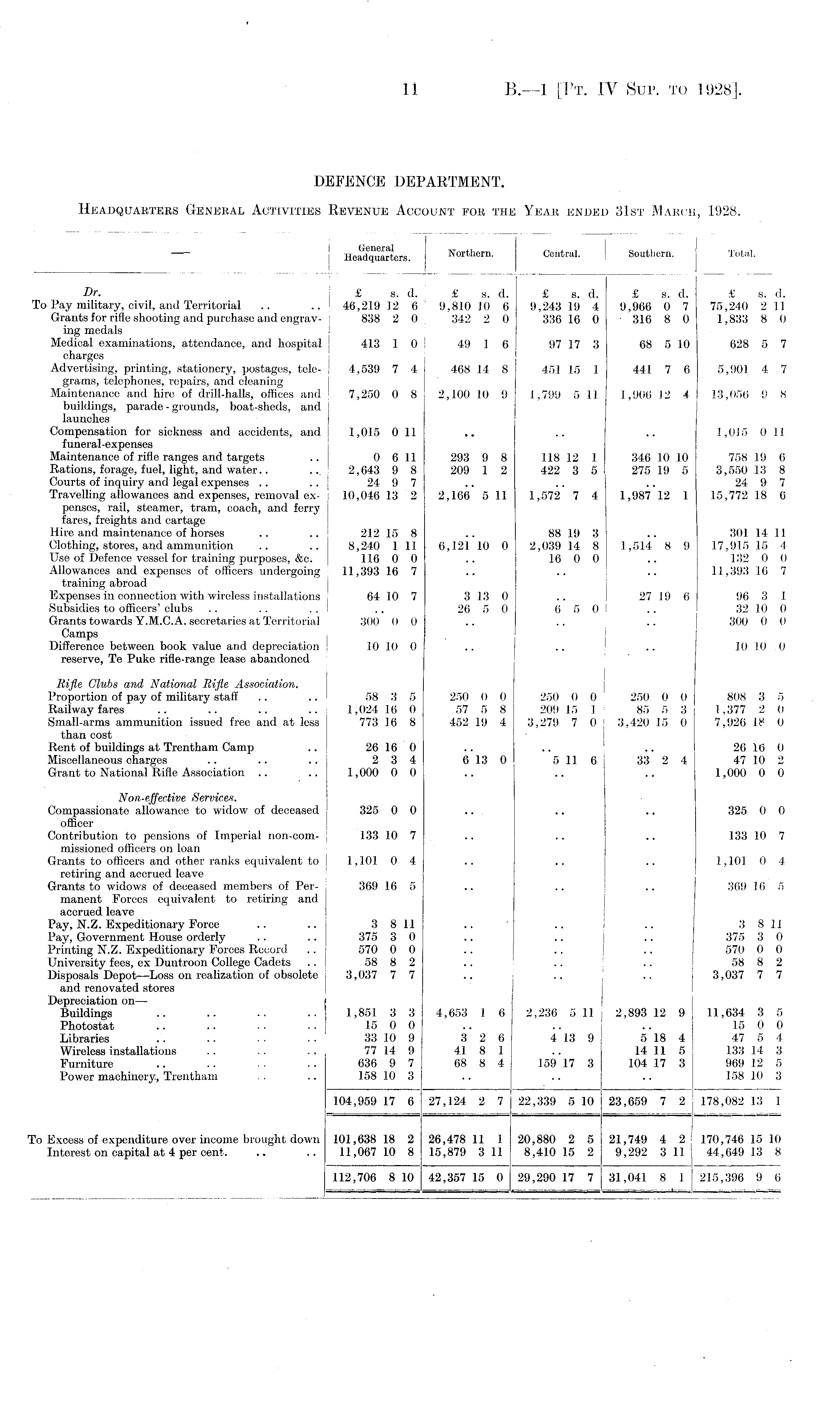 I Headquarters Northern. Central. j Southern. Total. Dr. £ s. d. £ s. d. £ s. d. £ s. d. £ s. d. To Pay military, civil, and Territorial .. .. 46,219 12 6 9,810 10 6 9,243 19 4 9,966 0 7 75,240 2 11 Grants for rifle shooting and purchase and engrav- 838 2 0 342 2 0 336 16 0 316 8 0 1,833 8 0 ing medals Medical examinations, attendance, and hospital 413 1 0 49 1 6 97 17 3 68 5 10 628 5 7 charges Advertising, printing, stationery, postages, tele- j 4,539 7 4 468 14 8 451 15 1 441 7 6 5,901 4 7 grams, telephones, repairs, and cleaning Maintenance and hire of drill-halls, offices and 1 7,250 0 8 2,100 10 9 1,799 5 11 1,906 12 4 13,056 9 8 buildings, parade-grounds, boat-sheds, and launches { Compensation for sickness and accidents, and ! 1,015 0 11 .. .. .. 1,015 0 11 funeral-expenses Maintenance of rifle ranges and targets .. 0 6 11 293 9 8 118 12 1 346 10 10 758 19 6 Rations, forage, fuel, light, and water.. ... 2,643 9 8 209 1 2 422 3 5 275 19 5 3,550 13 8 Courts of inquiry and legal expenses .. .. 24 9 7 .. .. .. 24 9 7 Travelling allowances and expenses, removal ex- 10,046 13 2 2,166 5 11 1,572 7 4 1,987 12 1 15,772 18 6 penses, rail, steamer, tram, coach, and ferry fares, freights and cartage Hire and maintenance of horses .. .. 212 15 8 .. 88 19 3 .. 301 14 11 Clothing, stores, and ammunition .. .. 8,240 1 11 6,121 1.0 0 2,039 14 8 1,514 8 9 17,915 15 4 Use of Defence vessel for training purposes, &c. 116 0 0 .. 16 0 0 .. 132 0 0 Allowances and expenses of officers undergoing 11,393 16 7 .. .. .. 11,393 16 7 training abroad Expenses in connection with wireless installations 64 10 7 3 13 0 .. 27 19 6 96 3 1 Subsidies to officers' clubs .. .. .. .. 26 5 0 6 5 0 .. 32 10 0 Grants towards Y.M.C.A. secretaries at Territorial j 300 0 0 .. .. j .. 300 0 0 Camps j 1 Difference between book value and depreciation 1 10 10 0 .. .. .. 10 10 0 reserve, Te Puke rifle-range lease abandoned Rifle Glubs and National Rifle Association. Proportion of pay of military staff .. .. 58 3 5 250 0 0 250 0 0 250 0 0 808 3 5 Railway fares .. .. .. .. 1,024 16 0 57 5 8 209 15 1 85 5 3 1,377 2 0 Small-arms ammunition issued free and at less j 773 16 8 452 19 4 3,279 7 0 3,420 15 0 7,926 If 0 than cost Rent of buildings at Trentham Camp .. 26 16 0 .. .. .. 26 16 0 Miscellaneous charges .. .. .. 2 3 4 6 13 0 5 11 6 33 2 4 47 10 2 Grant to National Rifle Association .. .. 1,000 0 0 .. .. .. 1,000 0 0 Non-effective Services. Compassionate allowance to widow of deceased 325 0 0 .. .. .. 325 0 0 officer Contribution to pensions of Imperial non-com- | 133 10 7 .. .. .. 133 10 7 missioned officers on loan Grants to officers and other ranks equivalent to 1,101 0 4 .. .. .. 1,101 0 4 retiring and accrued leave Grants to widows of deceased members of Per- 369 16 5 .. .. .. 369 16 5 manent Forces equivalent to retiring and accrued leave Pay, N.Z. Expeditionary Force .. .. 3811 .. ' .. .. 3811 Pay, Government House orderly .. .. 375 3 0 .. .. .. 375 3 0 Printing N.Z. Expeditionary Forces Record .. 570 0 0 .. .. .. 570 0 0 University fees, ex Duntroon College Cadets .. 58 8 2 .. .. .. 58 8 2 Disposals Depot—Loss on realization of obsolete 3,03777 .. .. .. 3,03777 and renovated stores Depreciation on— j Buildings .. .. .. .. I 1,851 3 3 4,653 1 6 2,236 5 11 2,893 12 9 11,634 3 5 Photostat .. .. ■ . .. 15 0 0 .. .. .. 15 0 0 Libraries .. .. . . . . 33 10 9 3 2 6 4 13 9 5 18 4 47 5 4 Wireless installations .. .. .. 77 14 9 41 8 1 .. 14 11 5 133 14 3 Furniture .. .. . . 636 9 7 68 8 4 159 17 3 104 17 3 969 12 5 Power machinery, Trentham - . .. 158 10 3 .. .. .. 158 10 3 104,959 17 6 27,124 2 7 22,339 5 10 23,659 7 2 j 178,082 13 1 ~ __ " To Excess of expenditure over income brought down 101,638 18 2 26,478 11 1 20,880 2 5 21,749 4 2 170,746 15 10 Interest on capital at 4 per cent. .. .. 11,067 10 8 15,879 3 11 8,410 15 2 9,292 3 11 44,649 13 8 112,706 8 10 42,357 15 0 29,290 17 7 31,041 8 1 215,396 9 6