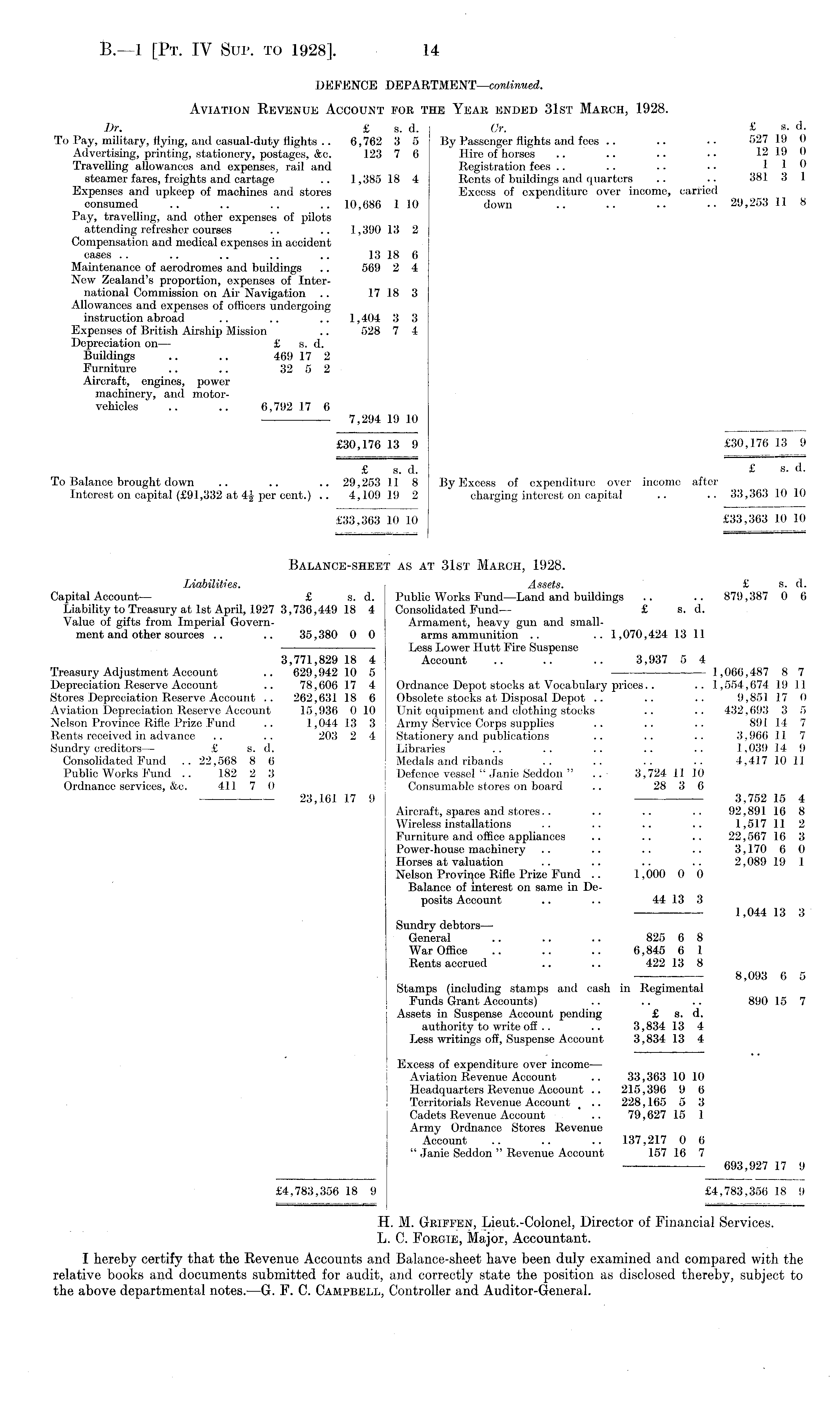 DEFENCE DEPARTMENT—continued. Aviation Revenue Account foe the Year ended 31st March, 1928. Dr. £ S. d. Gr. £ »• d. To Pay, military, flying, and casual-duty flights .. 6,762 3 5 By Passenger flights and fees .. .. •• 527 19 0 Advertising, printing, stationery, postages, &c. 123 7 6 Hire of horses .. .. .. • • 12 19 0 Travelling allowances and expenses, rail and Registration fees .. .. .. • • 110 steamer fares, freights and cartage .. 1,385 18 4 Rents of buildings and quarters .. .. 381 3 1 Expenses and upkeep of machines and stores Excess of expenditure over income, carried consumed .. .. .. .. 10,686 1 10 down .. .. .. •• 29,253 11 8 Pay, travelling, and other expenses of pilots attending refresher courses .. .. 1,390 13 2 Compensation and medical expenses in accident cases .. .. .. .. .. 13 18 6 Maintenance of aerodromes and buildings .. 569 2 4 New Zealand's proportion, expenses of International Commission on Air Navigation .. 17 18 3 Allowances and expenses of officers undergoing instruction abroad .. .. .. 1,404 3 3 Expenses of British Airship Mission .. 528 7 4 Depreciation on—■ £ s. d. Buildings .. .. 469 17 2 Furniture .. .. 32 5 2 Aircraft, engines, power machinery, and motorvehicles .. .. 6,792 17 6 — 7,294 19 10 £30,176 13 9 £30,176 13 9 £ s. d. £ s. d. To Balance brought down .. .. .. 29,253 11 8 By Excess of expenditure over income after Interest on capital (£91,332 at 4J per cent.) .. 4,109 19 2 charging interest on capital .. .. 33,363 10 10 £33,363 10 10 £33,363 10 10 Balance-sheet as at 31st March, 1928. Liabilities. Assets. £ s. d. Capital Account— £ s. d. Public Works Fund —Land and buildings .. .. 879,387 0 6 Liability to Treasury at Ist April, 1927 3,736,449 18 4 Consolidated Fund — £ s. d. Value of gifts from Imperial Govern- Armament, heavy gun and smallment and other sources .. .. 35,380 0 0 arms ammunition .. .. 1,070,424 13 11 • Less Lower Hutt Fire Suspense 3,771,829 18 4 Account .. .. .. 3,937 5 4 Treasury Adjustment Account .. 629,942 10 5 1,066,487 8 7 Depreciation Reserve Account .. 78,606 17 4 Ordnance Depot stocks at Vocabulary prices.. .. 1,554,674 19 11 Stores Depreciation Reserve Account .. 262,631 18 6 Obsolete stocks at Disposal Depot .. .. .. 9,851 17 0 Aviation Depreciation Reserve Account 15,936 010 Unit equipment and clothing stocks .. .. 432,693 3 5 Nelson Province Rifle Prize Fund .. 1,044 13 3 Army Service Corps supplies .. .. .. 89.1 14 7 Rents received in advance .. .. 203 2 4 Stationery and publications .. .. .. 3,966117 Sundry creditors— £ s. d. Libraries .. .. .. .. .. 1,039 14 9 Consolidated Fund .. 22,568 8 6 Medals and ribands .. .. .. .. 4,417 10 II Public Works Fund .. 182 2 3 Defence vessel " Janie Seddon" .. 3,724 11 10 Ordnance services, &c. 411 7 0 Consumable stores on board .. 28 3 6 — 23,161 17 9 3,752 15 4 Aircraft, spares and stores.. .. .. .. 92,891 16 8 Wireless installations .. .. .. .. 1,517 11 2 Furniture and office appliances .. .. .. 22,567 16 3 Power-house machinery .. .. .. .. 3,170 6 0 Horses at valuation .. .. .. .. 2,089 19 1 Nelson Province Rifle Prize Fund .. 1,000 0 0 Balance of interest on same in Deposits Account .. .. 44 13 3 1,044 13 3 Sundry debtors — General .. .. .. 825 6 8 War Office .. .. .. 6,845 6 1 Rents accrued .. .. 422 13 8 8,093 6 5 Stamps (including stamps and cash in Regimental Funds Grant Accounts) .. .. .. 890 15 7 Assets in Suspense Account pending £ s. d. authority to write off .. .. 3,834 13 4 Less writings off, Suspense Account 3,834 13 4 1 Excess of expenditure over income— Aviation Revenue Account .. 33,363 10 10 Headquarters Revenue Account .. 215,396 9 6 Territorials Revenue Account # .. 228,165 5 3 Cadets Revenue Account .. 79,627 15 1 Army Ordnance Stores Revenue Account .. .. .. 137,217 0 6 " Janie Seddon " Revenue Account 157 16 7 693,927 17 9 £4,783,356 18 9 £4,783,356 18 9 H. M. Griffen, Lieut.-Colonel, Director of Financial Services. L. C. Forgie, Major, Accountant. I hereby certify that the Revenue Accounts and Balance-sheet have been duly examined and compared with the relative books and documents submitted for audit, and correctly state the position as disclosed thereby, subject to the above departmental notes. —G. F. C. Campbell, Controller and Auditor-General.