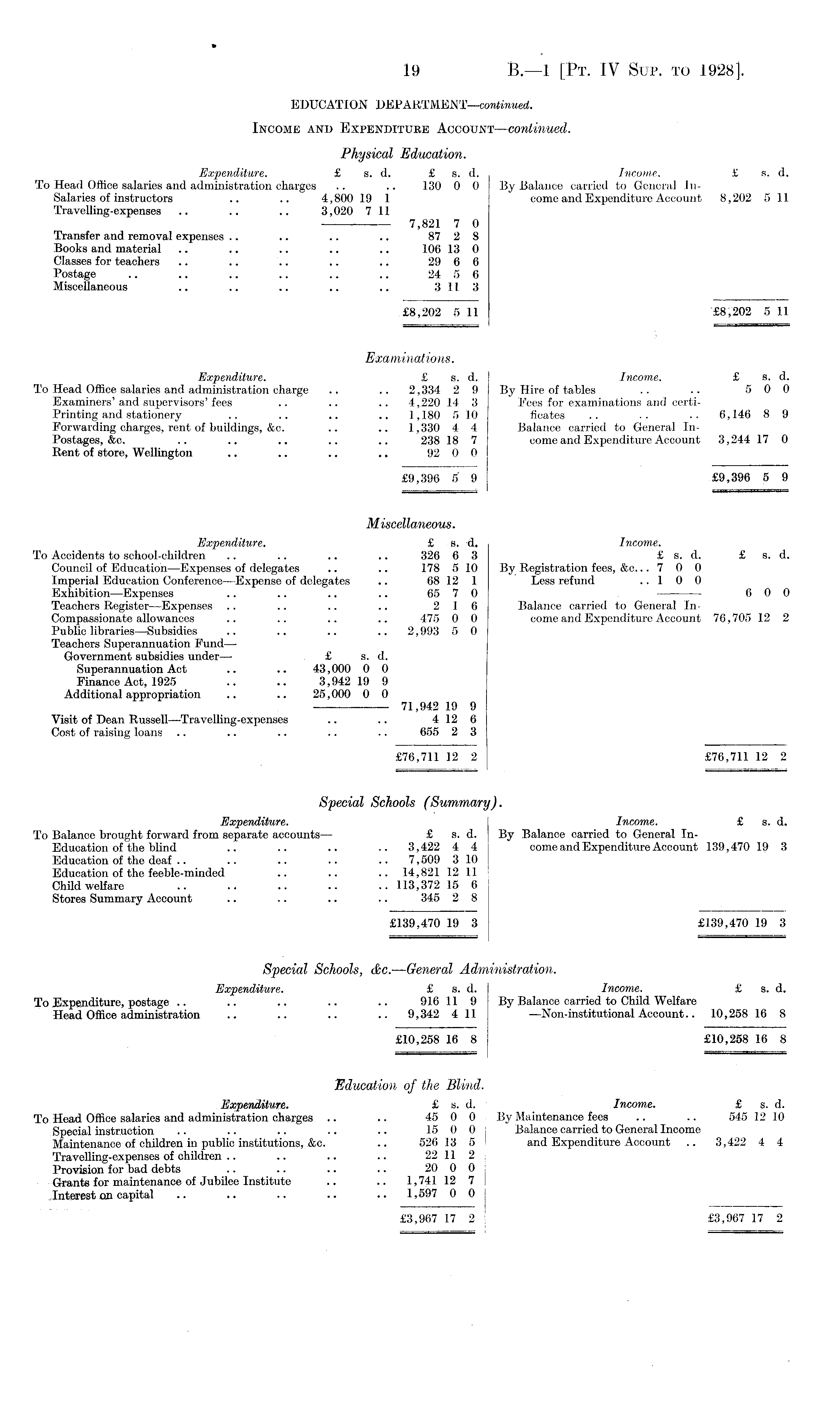 EDUCATION DEPARTMENT—continued. Income and Expenditure Account —continued. Physical Education. Expenditure. £ s. d. £ s. d. Income. £ s. d. To Head Office salaries and administration charges .. .. 130 0 0 By Balance carried to General InSalaries of instructors .. .. 4,800 19 1 come and Expenditure Account 8,202 511 Travelling-expenses .. .. .. 3,020 711 7,821 7 0 Transfer and removal expenses .. .. .. .. 87 2 8 Books and material .. .. .. .. .. 106 13 0 Classes for teachers .. .. .. .. .. 29 6 6 Postage .. .. .. .. .. .. 24 5 6 Miscellaneous .. .. .. .. .. 3113 £8,202 5 11 £8,202 5 11 Examinations. Expenditure. £ s. d. Income. £ s. d. To Head Office salaries and administration charge .. .. 2,334 2 9 By Hire of tables .. .. 5 0 0 Examiners'and supervisors'fees .. .. .. 4,220 14 3 Fees for examinations and certiPrinting and stationery .. .. .. .. 1,180 510 ficates .. .. 6,146 8 9 Forwarding charges, rent of buildings, &c. .. .. 1,330 4 4 Balance carried to General InPostages, &c. .. .. .. .. .. 238 18 7 come and Expenditure Account 3,244 17 0 Rent of store, Wellington .. .. .. .. 92 0 0 £9,396 5' 9 £9,396 5 9 Miscellaneous. Expenditure. £ s. d. Income. To Accidents to school-children .. .. .. .. 326 6 3 £ s. d. £ s. d. Council of Education —Expenses of delegates .. .. 178 510 By Registration fees, &c... 7 0 0 Imperial Education Conference—Expense of delegates .. 68 12 1 Less refund .. 1 0 0 Exhibition —Expenses .. ~ ... .. 65 7 0 6 0 0 Teachers Register—Expenses .. .. .. .. 216 Balance carried to General InCompassionate allowances .. .. .. .. 475 0 0 come and Expenditure Account 76,705 12 2 Public libraries—Subsidies .. .. .. .. 2,993 5 0 Teachers Superannuation Fund— Government subsidies under— £ s. d. Superannuation Act .. .. 43,000 0 0 Finance Act, 1925 .. .. 3,942 19 9 Additional appropriation .. .. 25,000 0 0 71,942 19 9 Visit of Dean Russell —Travelling-expenses .. .. 4 12 6 Cost of raising loans .. .. .. .. .. 655 2 3 £76,711 12 2 £76,711 12 2 Special Schools (Summary). Expenditure. Income. £ s. d. To Balance brought forward from separate accounts— £ s. d. By Balance carried to General InEducation of the blind .. .. .. .. 3,422 4 4 come and Expenditure Account 139,470 19 3 Education of the deaf .. .. .. .. .. 7,509310 Education of the feeble-minded .. .. .. 14,821 12 11 Child welfare .. .. .. .. .. 113,372 15 6 Stores Summary Account .. .. .. .. 345 2 8 £139,470 19 3 £139,470 19 3 Special Schools, &c. —General Administration. Expenditure. £ s. d. Income. £ s. d. To Expenditure, postage .. .. .. .. .. 916 11 9 By Balance carried to Child Welfare Head Office administration .. .. .. .. 9,342 411 —Non-institutional Account.. 10,258 16 8 £10,258 16 8 £10,258 16 8 Education of the Blind. Expenditure. £ s. d. Income. £ s. d. To Head Office salaries and administration charges .. .. 45 0 0 By Maintenance fees .. .. 545 12 10 Special instruction .. .. .. .. .. 15 0 0, Balance carried to General Income Maintenance of children in public institutions, &c. .. 526 13 5 1 and Expenditure Account .. 3,422 4 4 Travelling-expenses of children .. .. .. .. 22 11 2 Provision for bad debts .. .. .. .. 20 0 0 Grants for maintenance of Jubilee Institute .. .. 1,741 12 7 Interest on capital .. .. .. .. .. 1,597 0 0 j £3,967 17 2 £3,967 17 2
