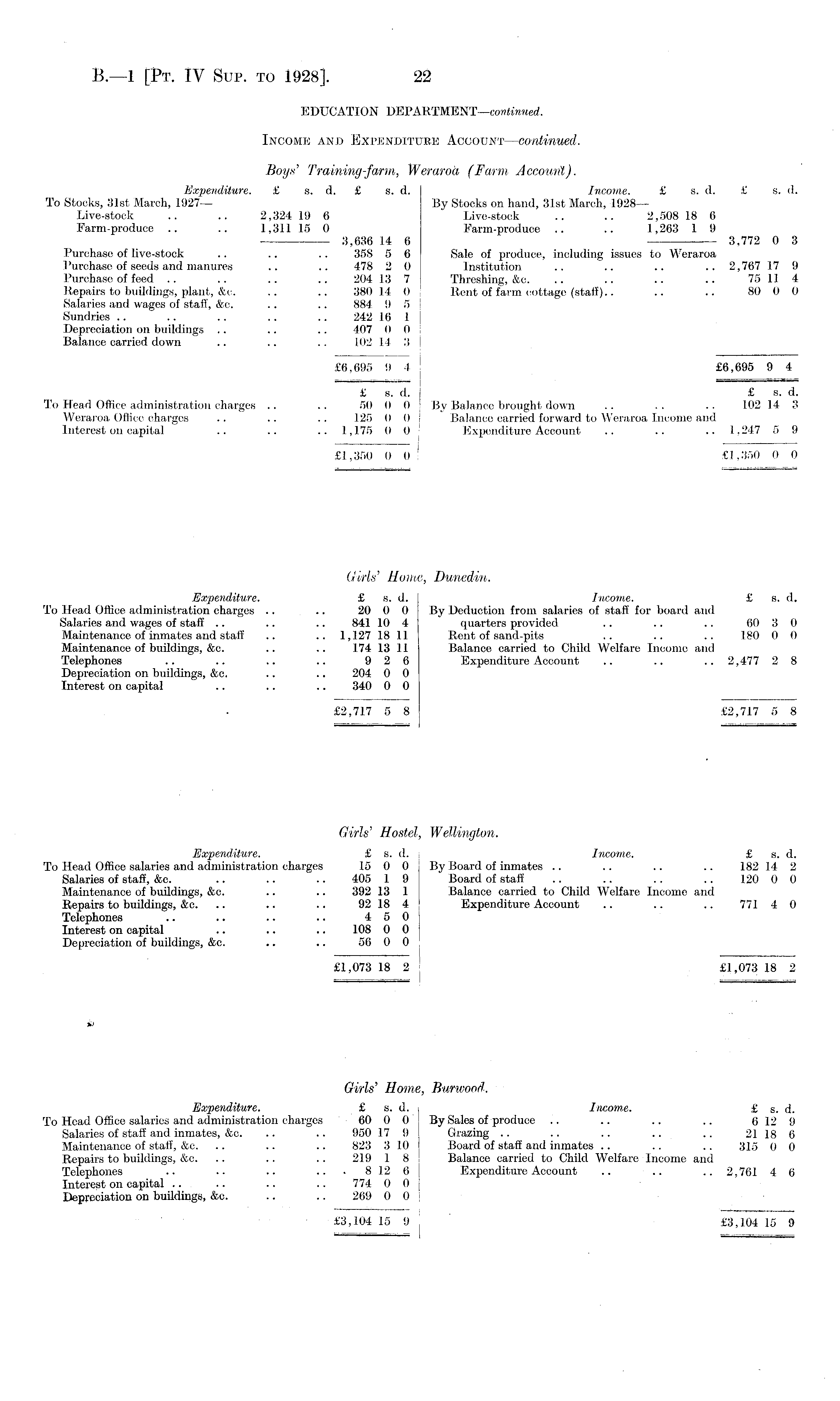 EDUCATION DEPARTMENT—continued. Income and Expenditure Account —continued. Boys' Training-farm, Weraroh (Farm Account). Expenditure. £ s. d. £ s. d. Income. £ s. d. £ s. d. To Stocks, 31st March, 1927— By Stocks on hand, 31st March, 1928 — Live-stock .. .. 2,324 19 6 Live-stock .. .. 2,508 18 6 Farm-produce .. .. 1,311 15 0 Farm-produce .. .. 1,263 1 9 3,636 14 6 3,772 0 3 Purchase of live-stock .. .. .. 35S 5 6 Sale of produce, including issues to Weraroa Purchase of seeds and manures .. .. 478 2 0 Institution .. .. .. .. 2,767 17 9 Purchase of feed .. .. .. .. 204 13 7 Threshing, &c. .. .. .. .. 75 11 4 Kepairs to buildings, plant, &c. .. .. 380 14 0 Rent of farm cottage (staff).. .. .. 80 0 0 Salaries and wages of staff, &c. .. .. 884: 9 5 Sundries .. .. .. .. .. 242 16 1 Depreciation on buildings .. .. .. 407 0 0 Balance carried down .. .. .. 102 14 3 £6,695 9 4 £6,695 9 4 £ s. d. £ s. d. To Head Office administration charges .. .. 50 0 0 By Balance brought down .. .. .. 102 14 3 Weraroa Office charges .. .. .. 125 0 0 Balance carried forward to Weraroa Income and Interest on capital .. .. .. 1,175 0 0 Expenditure Account .. .. .. 1,247 5 9 £1,350 0 0 ' £1,350 0 0 Girls' Hume, Dunedin. Expenditure. £ s. d. Income. £ s. d. To Head Office administration charges .. .. 20 0 0 By Deduction from salaries of staff for board and Salaries and wages of staff .. .. .. 841 10 4 quarters provided .. .. .. 60 3 0 Maintenance of inmates and staff .. .. 1,127 18 1 I Rent of sand-pits .. .. .. 180 0 0 Maintenance of buildings, &c. .. .. 174 13 11 Balance carried to Child Welfare Income and Telephones .. .. .. .. 9 2 6 Expenditure Account .. .. .. 2,477 2 8 Depreciation on buildings, &c. .. .. 204 0 0 Interest on capital .. .. .. 340 0 0 £2,717 5 8 £2,717 5 8 Girls' Hostel, Wellington. Expenditure. £ s. d. Income. £ s. d. To Head Office salaries and administration charges 15 0 0 By Board of inmates .. .. .. .. 182 14 2 Salaries of staff, &c. .. .. .. 405 1 9 Board of staff .. .. .. .. 120 0 0 Maintenance of buildings, &c. .. .. 392 13 1 Balance carried to Child Welfare Income and Repairs to buildings, &c. .. .. .. 92 18 4 Expenditure Account .. .. .. 771 4 0 Telephones .. .. .. .. 4 5 0 Interest on capital .. .. .. 108 0 0 Depreciation of buildings, &c. .. .. 56 0 0 £1,073 18 2 £1,073 18 2 ========= I ' Girls' Home, Burwood. Expenditure. £ s. d. Income. £ s. d. To Head Office salaries and administration charges 60 0 0 By Sales of produce .. .. .. .. 612 9 Salaries of staff and inmates, &c. .. .. 950 17 9 Grazing .. .. .. .. .. 21 18 6 Maintenance of staff, &c. .. .. .. 823 310 Board of staff and inmates .. .. .. 315 0 0 Repairs to buildings, &c. .. .. .. 219 I 8 Balance carried to Child Welfare Income and Telephones .. .. .. ... 812 6 Expenditure Account .. .. .. 2,761 4 6 Interest on capital .. .. .. .. 77400 Depreciation on buildings, &c. .. .. 269 0 0 £3,104 15 9 | £3,104 15 9