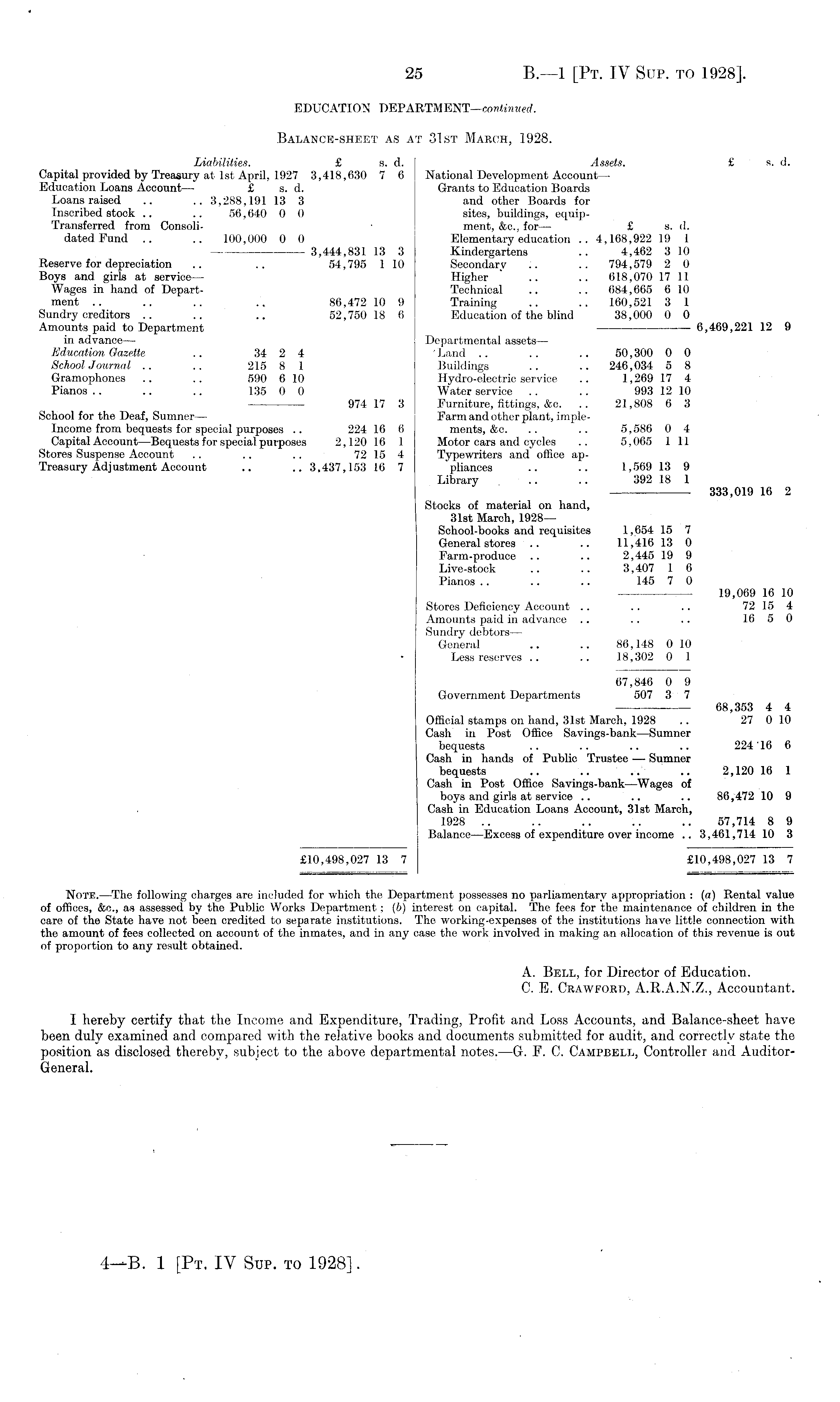 EDUCATION DEPARTMENT—continued. Balance-sheet as at 31st March, 1928. Liabilities. £ s. d. Assets. £ s. d. Capital provided by Treasury at Ist April, 1927 3,418,630 7 6 National Development Account— Education Loans Account— £ s. d. Grants to Education Boards Loans raised .. .. 3,288,191 13 3 and other Boards for Inscribed stock .. .. 56,640 0 0 sites, buildings, equipTransferred from Consoli- • ment, &c., for— £ s. d. dated Fund .. .. 100,000 0 0 Elementary education .. 4,168,922 19 I 3,444,831 13 3 Kindergartens .. 4,462 3 10 Reserve for depreciation .. .. 34,795 110 Secondary .. .. 794,579 2 0 Boys and girls at service— Higher .. .. 618,070 17 11 Wages in hand of Depart- Technical .. .. 684,665 610 ment .. .. .. .. 86,472 10 9 Training .. .. 160,521 3 1 Sundry creditors .. .. .. 52,750 18 6 Education of the blind 38,000 0 0 Amounts paid to Department 6,469,221 12 9 in advance— Departmental assets — Education Gazette .. 34 2 4 ' Land .. .. .. 50,300 0 0 School Journal .. .. 215 8 1 Buildings .. .. 246,034 5 8 Gramophones .. .. 590 610 Hydro-electric service .. 1,269 17 4 Pianos .. .. .. 135 0 0 Water service .. .. 993 12 10 974 17 3 Furniture, fittings, &c. .. 21,808 6 3 School for the Deaf, Sumner— Farm and other plant, impleIncome from bequests for special purposes .. 224 16 6 ments, &c. .. .. 5,586 0 4 Capital Account—Bequests for special purposes 2,120 16 1 Motor cars and cycles .. 5,065 111 Stores Suspense Account .. .. .. 72 15 4 Typewriters and office apTreasury Adjustment Account .. .. 3,437,153 16 7 pliances .. .. 1,569 13 9 Library .. .. 392 18 1 333,019 16 2 Stocks of material on hand, 31st March, 1928 — School-books and requisites 1,654 15 7 General stores .. .. 11,416 13 0 Farm-produce .. .. 2,445 19 9 Live-stock .. .. 3,407 1 6 Pianos .. .. .. 145 7 0 19,069 16 10 Stores Deficiency Account .. .. .. 72 15 4 Amounts paid in advance .. .. .. 16 5 0 Sundry debtors — General .. .. 86,148 0 10 Less reserves .. .. 18,302 0 1 67,846 0 9 Government Departments 507 3 7 68,353 4 4 Official stamps on hand, 31st March, 1928 .. 27 0 10 Cash in Post Office Savings-bank—Sumner bequests .. .. .. .. 224 16 6 Cash in hands of Public Trustee — Sumner bequests .. .. .. .. 2,120 16 1 Cash in Post Office Savings-bank—Wages of boys and girls at service .. .. .. 86,472 10 9 Cash in Education Loans Account, 31st March, 1928 .. .. .. .. .. 57,714 8 9 Balance'—Excess of expenditure over income .. 3,461,714 10 3 £10,498,027 13 7 £10,498,027 13 7 Note.-—The following charges are included for which the Department possesses no parliamentary appropriation : (a) Rental value of offices, &c., as assessed by the Public Works Department; (6) interest on capital. The fees for the maintenance of children in the care of the State have not been credited to separate institutions. The working-expenses of the institutions have little connection with the amount of fees collected on account of the inmates, and in any case the work involved in making an allocation of this revenue is out of proportion to any result obtained. A. Bell, for Director of Education. C. E. Crawford, A.R.A.N.Z., Accountant. I hereby certify that the Income and Expenditure, Trading, Profit and Loss Accounts, and Balance-sheet have been duly examined and compared with the relative books and documents submitted for audit, and correctly state the position as disclosed thereby, subject to the above departmental notes. —G. F. 0. Campbell, Controller and AuditorGeneral.