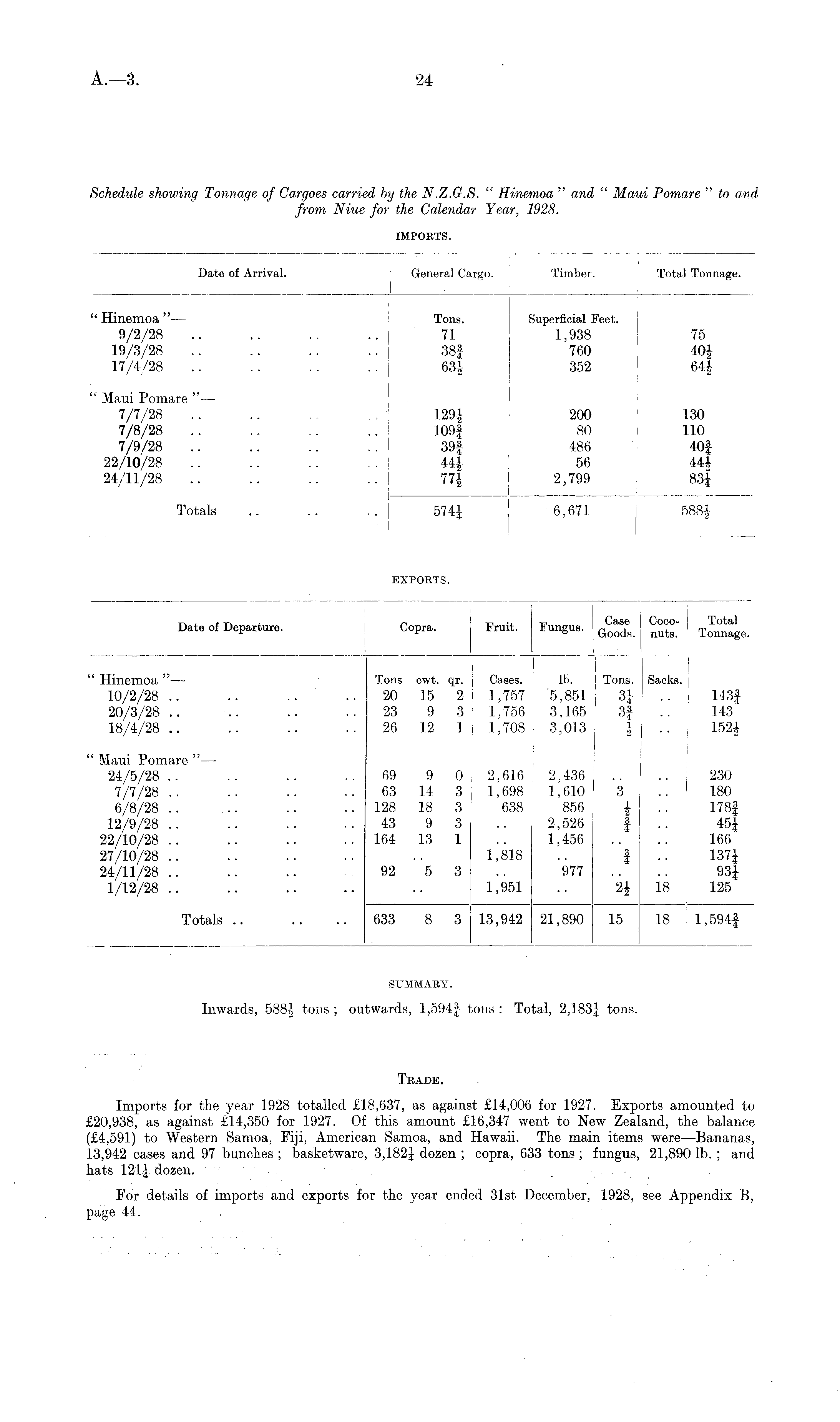 Schedule showing Tonnage of Cargoes carried by the N.Z.G.S. "Hinemoa" and "Maui Pomare" to and from Niue for the Calendar Year, 1928.