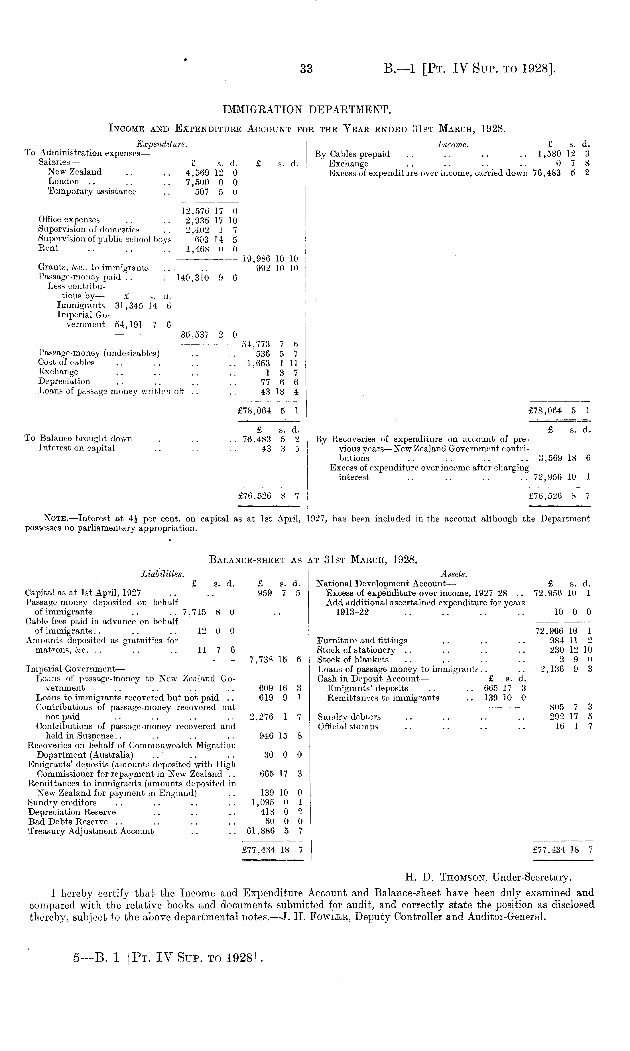 IMMIGRATION DEPARTMENT. Income and Expenditure Account for the Year ended 31st March, 1928. Expenditure. Income. £ s. d. To Administration expenses— By Cables prepaid .. .. .. .. 1,580 12 3 Salaries— £ s. d. £ s. d. Exchange ~ .. .. .. 0 7 8 New Zealand .. .. 4,569 12 0 Excess of expenditure over income, carried down 76,483 5 2 London .. .. .. 7,500 0 0 Temporary assistance .. 507 5 0 12,576 17 0 Office expenses .. .. 2,935 17 10 Supervision of domestics .. 2,402 1 7 Supervision of public-school boys 603 14 5 Rent .. .. . 1,468 0 0 19,986 10 10 Grants, &c., to immigrants .. .. 992 10 10 Passage-money paid .. .. 140,310 9 6 Less contributions by— £ s. d. Immigrants 31,345 14 6 Imperial Government 54,191 7 6 85,537 2 0 54,773 7 6 Passage-money (undesirables) .. .. 536 5 7 Cost of cables .. .. .. .. 1,653 1 11 Exchange .. .. . . .. 13 7 Depreciation .. .. .. .. 77 6 6 Loans of passage-money written off .. .. 43 18 4 £78,064 5 1 £78,064 5 1 £ s. d. £ s. d. To Balance brought down .. .. .. 76,483 5 2 By Recoveries of expenditure on account of preInterest on capital .. .. ~ 43 3 5 vious years —New Zealand Government contributions .. .. .. .. 3,569 18 6 Excess of expenditure over income after charging interest .. .. .. .. 72,956 10 1 £76,526 8 7 £76,526 8 7 Note. —Interest at 4 \ per cent, on capital as at Ist April, 1927, has been included in the account although the Department possesses no parliamentary appropriation. Balance-sheet as at 31st March, 1928. Liabilities. Assets. £ s. d. £ s. d. National Development Account— £ s. d. Capital as at Ist April, 1927 .. .. 959 7 5 Excess of expenditure over income, 1927-28 .. 72,956 10 1 Passage-money deposited on behalf Add additional ascertained expenditure for years of immigrants .. .. 7,715 8 0 .. 1913-22 .. .. .. .. 10 0 0 Cable fees paid in advance on behalf of immigrants.. .. .. 12 0 0 72,966 10 1 Amounts deposited as gratuities for Furniture and fittings .. .. .. 984 11 2 matrons, &c. .. .. .. 11 7 6 Stock of stationery .. .. .. .. 230 12 10 7,738 15 6 Stock of blankets . . .. .. .. 2 9 0 Imperial Government — "Loans of passage-money to immigrants.. .. 2,136 9 3 Loans of passage-money to New Zealand Go- Cash in Deposit Account — £ s. d. vernment .. .. .. .. 609 16 3 Emigrants' deposits .. .. 665 17 3 Loans to immigrants recovered but not paid .. 619 9 1 Remittances to immigrants .. 139 10 0 Contributions of passage-money recovered but 805 7 3 not paid .. .. .. .. 2,276 1 7 Sundry debtors .. .. .. .. 292 17 5 Contributions of passage-money recovered and Official stamps .. .. .. .. 16 1 7 held in Suspense.. .. .. .. 946 15 8 Recoveries on behalf of Commonwealth Migration Department (Australia) .. .. .. 30 0 0 Emigrants' deposits (amounts deposited with High Commissioner for repayment in New Zealand .. 665 17 3 Remittances to immigrants (amounts deposited in New Zealand for payment in England) .. 139 10 0 Sundry creditors .. .. .. .. 1,095 0 1 Depreciation Reserve .. .. .. 418 0 2 Bad Debts Reserve .. .. .. .. 50 0 0 Treasury Adjustment Account .. .. 61,886 5 7 £77,434 18 7 £77,434 18 7 H. D. Thomson, Under-Secretary. I hereby certify that the Income and Expenditure Account and Balance-sheet have been duly examined and compared with the relative books and documents submitted for audit, and correctly state the position as disclosed thereby, subject to the above departmental notes.—J. H. Fowler, Deputy Controller and Auditor-General.