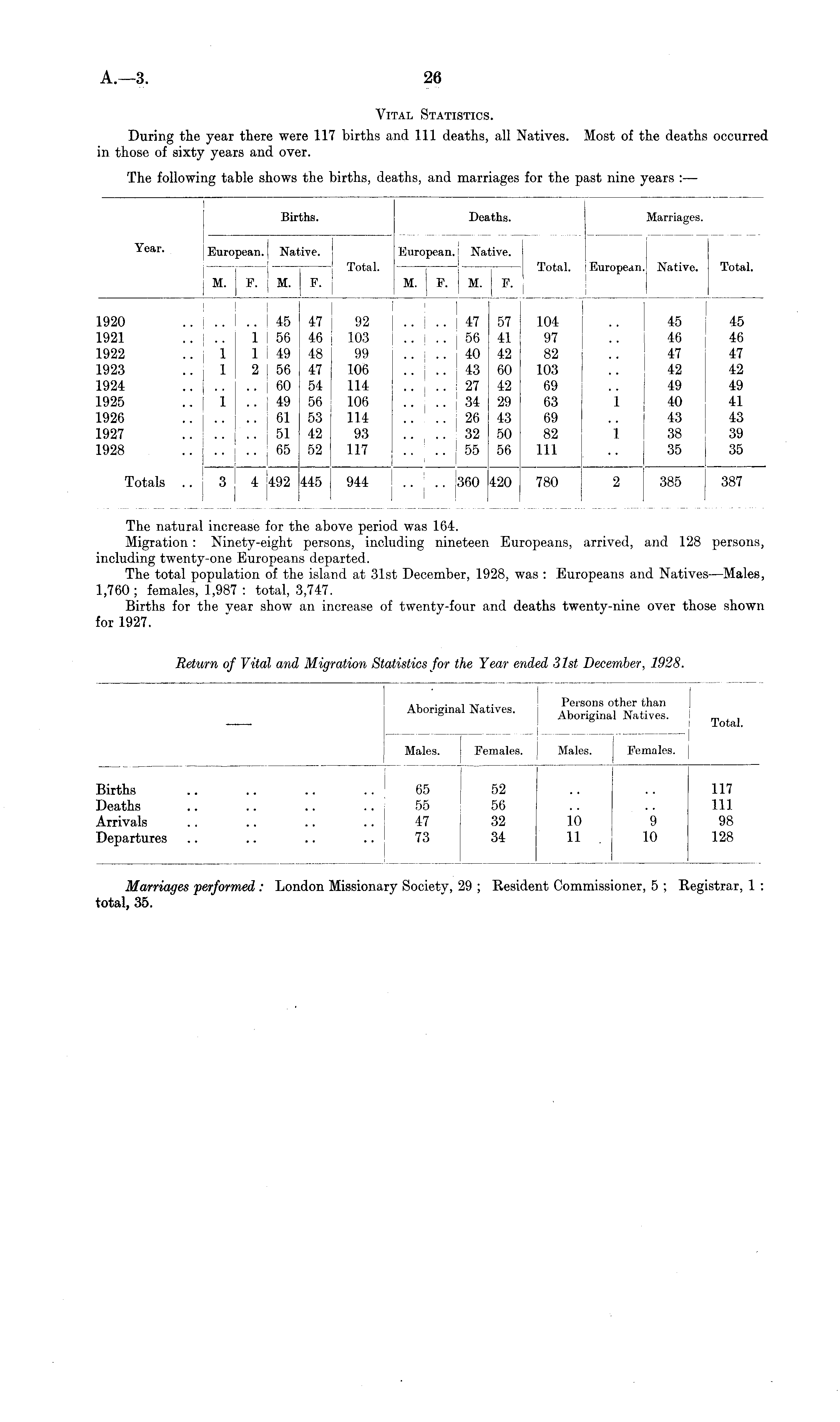 The natural increase for the above period was 164. Migration: Ninety-eight persons, including nineteen Europeans, arrived, and 128 persons, including twenty-one Europeans departed. The total population of the island at 31st December, 1928, was : Europeans and Natives —Males, 1,760 ; females, 1,987 : total, 3,747. Births for the vear show an increase of twenty-four and deaths twenty-nine over those shown for 1927.