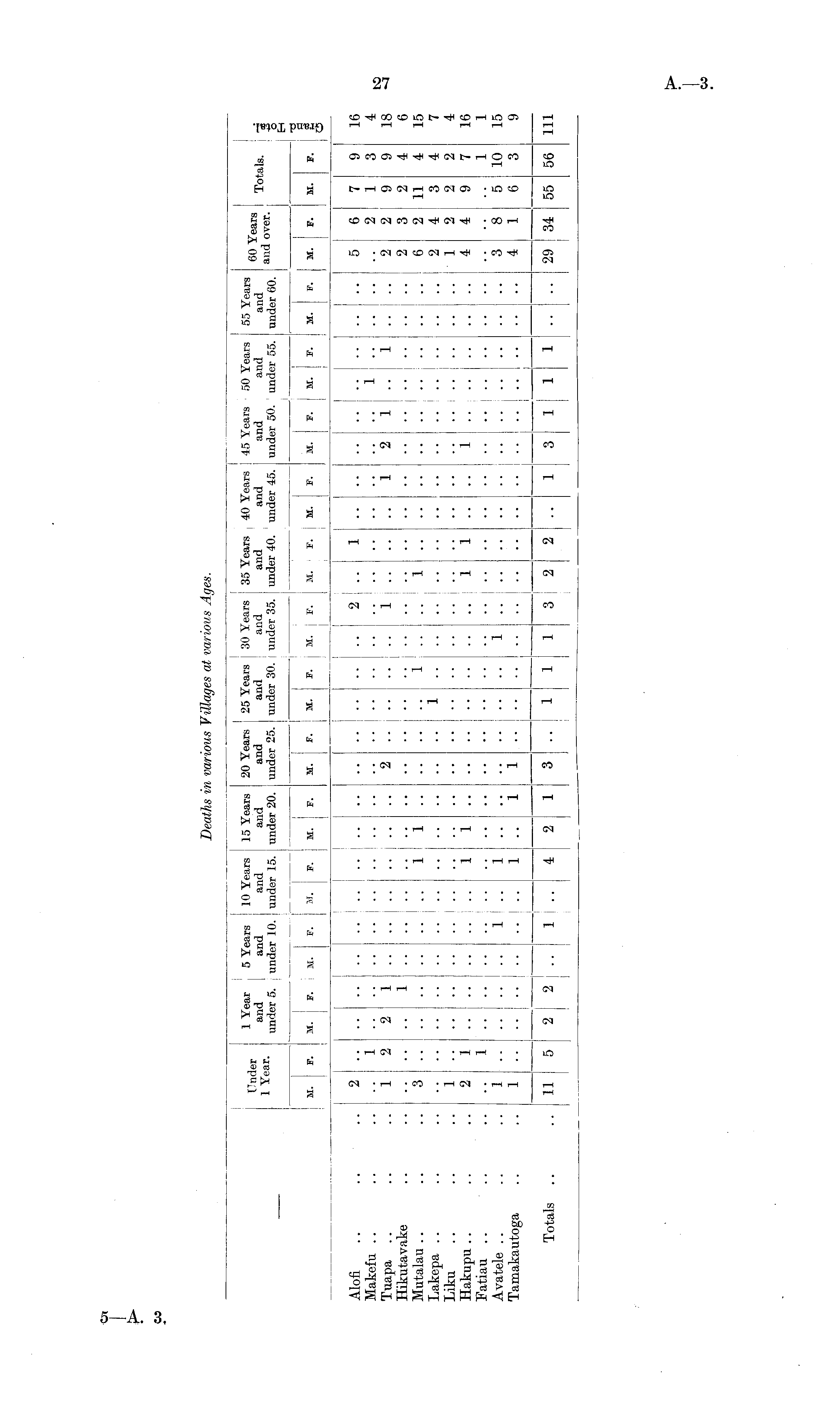 I I I i I p , 1 Year 5 Years 10 Years 15 Years 20 Years 25 Years 30 Years 35 Years 40 Years 45 Years 50 Years 55 Years v I , JJ- er and i and and and and and and and and and and and , ears I Totals. ear * under 5. under 10. i under 15. under 20. under 25. under 30. under 35. under 40. under 45. under 50. under 55. under 60. an over * "g - 1 I i | H ! (I- I I • ■ I 1 M. F. M. j F. M. F. M. F. M. F. M. j F. M. F. M. j F. M. F. M. F. M. F. M. F. M. F. M. | F. M. F. £ l| | j . _ Alofi .. .. .. 2 2 j .. 1 5 6 7 9 16 Makefu .. .. .. .. 1 1 2 1 3 4 Tuapa .. .. .. 1 2 2 1 2 1 1 2 1.. 1.. .. 2 2 9 9 18 Hikutavake .. 1 2 3 2 4 6 Mutalau .. .. .. 3 1 1 1 .. .. 1 6 2 11 4 15 Lakepa .. .. 1 2 4 3 4 7 Liku .. .. .. 1 1 2 2 2 4 Hakupu .. .. .. 2 1 1 1 1 1 .. .. 1 4 4 9 7 16 Fatiau .. .. .. .. 1 1 1 Avatele .. .. .. 1 1 .. 1 1 3 8 5 10 15 Tamakautoga .. .. 1 1 .. 1 1 4 1 6 3 9 Totals .. ..11 5 2 j 2 1.. 4 2 1 3.. 1 1 1 3 2 2.. 1 3 11 1.. .. 29 34 55 56 111 | j |