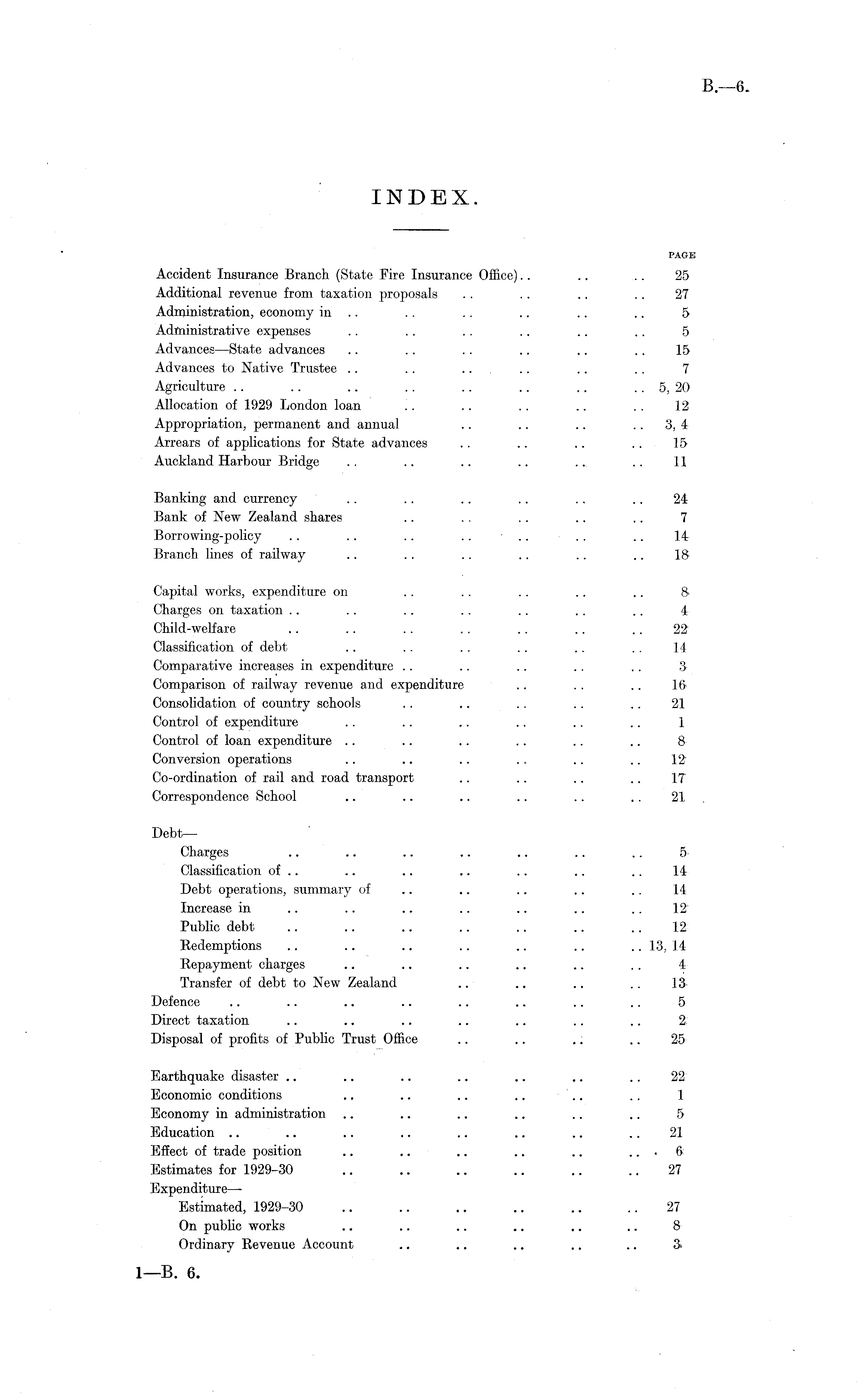 INDEX. PAGE Accident Insurance Branch (State Fire Insurance Office).. .. .. 25 Additional revenue from taxation proposals .. . . .. .. 27 Administration, economy in . . . . .. .. .. 5 Administrative expenses .. .. . . .. .. .. 5 Advances—State advances .. .. .. .. .. .. 15 Advances to Native Trustee .. .. .. .. .. . . 7 Agriculture .. .. .. .. .. .. .. .. 5, 20 Allocation of 1929 London loan .. .. .. .. .. 12 Appropriation, permanent and annual .. .. .. 3, 4 Arrears of applications for State advances .. .. .. . . 15 Auckland Harbour Bridge . . .. .. .. ... 11 Banking and currency .. .. .. .. .. .. 24 Bank of New Zealand shares .. . . . . . . .. 7 Borrowing-policy .. .. .. .. .. . . .. 14 Branch lines of railway .. . . .. .. .. .. 18 Capital works, expenditure on .. .. .. .. .. 8> Charges on taxation .. .. .. .. .. . . .. 4 Child-welfare .. .. .. . . .. .. .. 22 Classification of debt .. .. .. .. .. .. 14 Comparative increases in expenditure .. .. .. .. . . 3 Comparison of railway revenue and expenditure .. . . .. 16Consolidation of country schools .. .. .. . . .. 21 Control of expenditure . . .. .. .. .. .. 1 Control of loan expenditure .. .. .. . . .. .. & Conversion operations .. .. .. .. .. .. 12 Co-ordination of rail and road transport .. .. .. .. 17 Correspondence School .. .. .. .. .. . . 21 Debt — Charges .. .. .. .. .. .. .. 5 Classification of .. .. .. .. .. .. .. 14 Debt operations, summary of .. .. .. .. .. 14 Increase in .. .. .. .. .. .. .. 12 Public debt .. .. .. .. .. .. .. 12: Redemptions .. .. .. .. .. .. .. 13, 14 Repayment charges .. .. .. .. .. . . 4 Transfer of debt to New Zealand .. .. .. ~ 13 Defence .. .. .. .. .. .. .. .. 5 Direct taxation .. .. .. .. .. .. .. 2 Disposal of profits of Public Trust Office .. .. .. .. 25 Earthquake disaster .. .. .. .. .. .. .. 22 Economic conditions .. .. .. .. .. .. 1 Economy in administration .. .. .. .. .. .. 5 Education .. .. .. .. .. .. .. .. 21 Effect of trade position .. .. .. .. .. ... & Estimates for 1929-30 .. .. .. .. .. .. 27 Expenditure —- Estimated, 1929-30 .. .. .. .. .. .. 27 On public works .. .. .. .. .. .. 8 Ordinary Revenue Account .. .. .. .. .. 3.