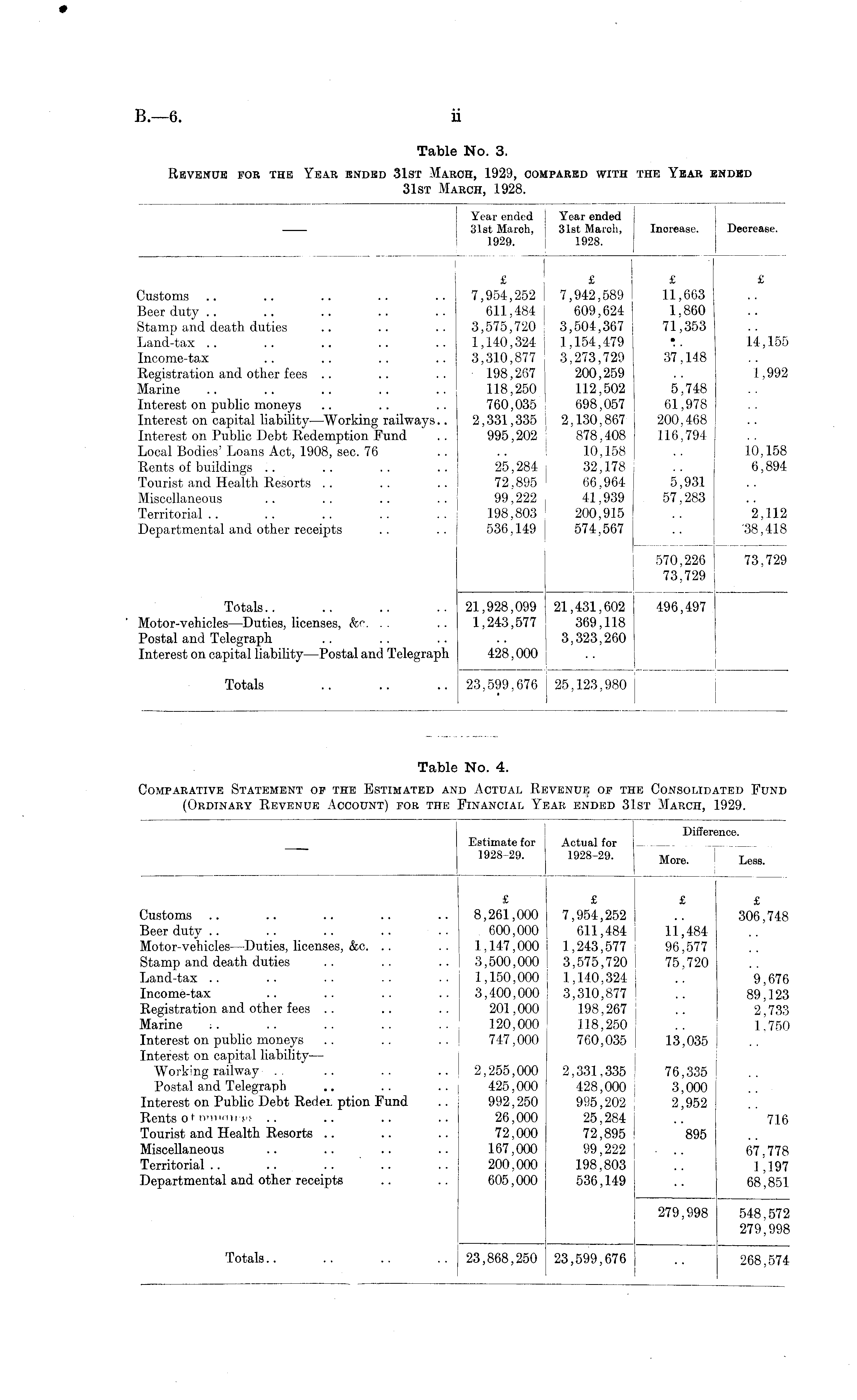 Year ended Year ended 1 31st March, 31st March, ! Increase. [ Decrease. 1929. 1928. I £ £ £ £ Customs .. .. .. .. .. 7,954,252 7,942,589 11,663 Beerduty.. .. .. .. .. 611,484 609,624 1,860 Stamp and death duties .. .. .. 3,575,720 3,504,367 71,353 Land-tax .. .. .. .. .. 1,140,324 1,154,479 V 14,155 Income-tax .. .. .. .. 3,310,877 3,273,729 37,148 Registration and other fees .. .. .. 198,267 200,259 .. 1,992 Marine .. .. .. .. .. 118,250 112,502 5,748 Interest on public moneys .. .. .. 760,035 698,057 61,978 Interest on capital liability—Working railways.. 2,331,335 2,130,867 200,468 Interest on Public Debt Redemption Fund .. 995,202 878,408 116,794 Local Bodies'Loans Act, 1908, sec. 76 .. .. 10,158 .. 10,158 Rents of buildings .. .. .. .. 25,284 32,178 .. 6,894 Tourist and Health Resorts .. .. .. 72,895 66,964 5,931 Miscellaneous .. .. .. .. 99,222 41,939 57,283 Territorial.. .. .. .. .. 198,803 200,915 .. 2,112 Departmental and other receipts .. .. 536,149 574,567 .. "38,418 570,226 73,729 73,729 Totals.. .. .. .. 21,928,099 21,431,602 496,497 Motor-vehicles —Duties, licenses, &c. .. .. 1,243,577 369,118 Postal and Telegraph .. .. .. .. 3,323,260 Interest on capital liability —Postal and Telegraph 428,000 Totals .. .. .. 23,599,676 j 25,123,980 ' I I