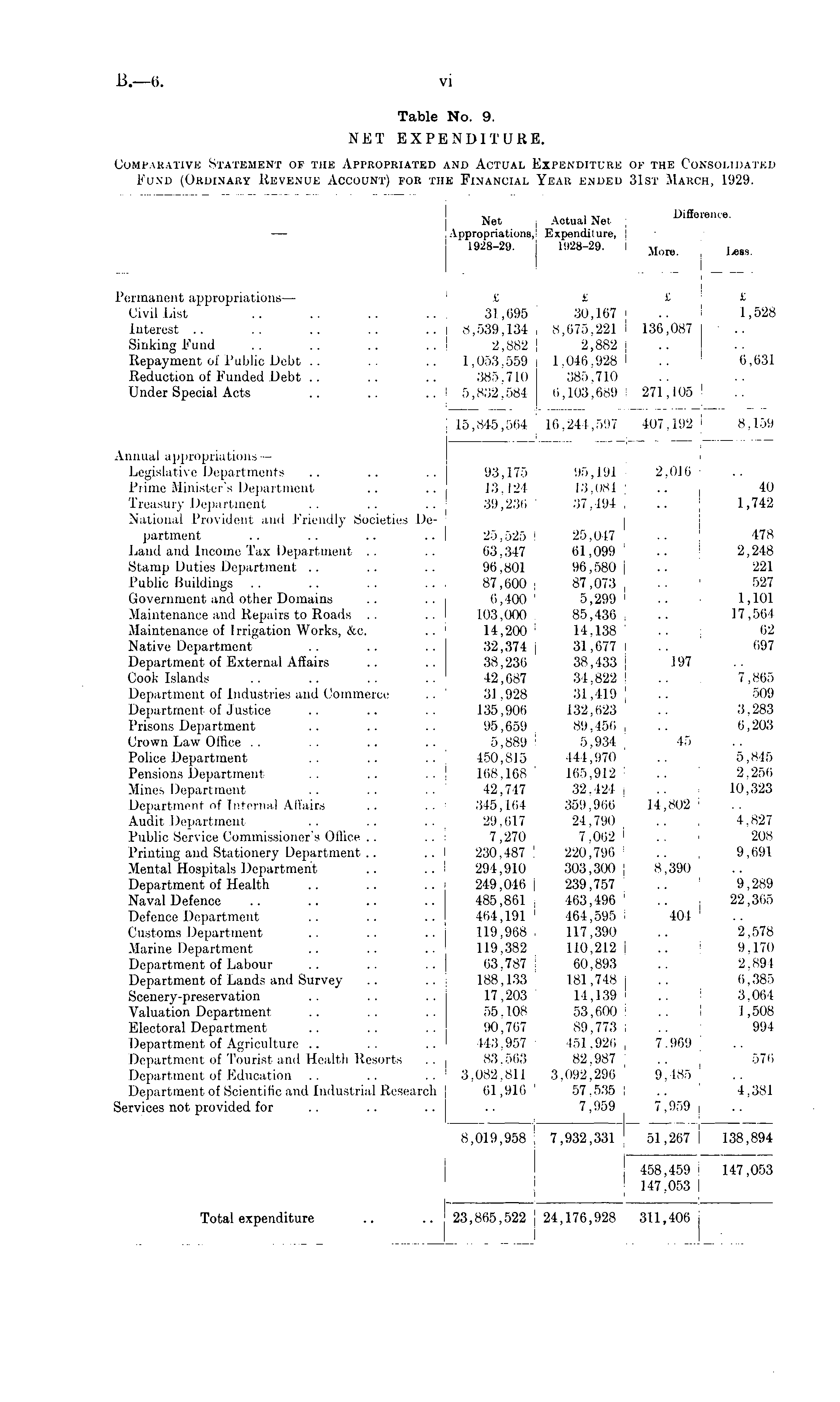 Net Actual Net Difference. Appropriations, Expenditure, j 1928-29. 1928-29. Permanent appropriations — £ £ £ £ Civil List .. .. .. .. 31,695 30,167 .. 1,528 Interest .. .. .. .. .. 8,539,134 8,675,221 136,087 • .. Sinking Fund .. .. .. .. 2,882 2,882 Repayment of Public Debt .. .. .. 1,053,559 1,046,928 .. 6,631 Reduction of Funded Debt .. .. .. 385,710 385,710 Under Special Acts .. .. .. 5,832,584 6,103,689 271,105 15,845,564 16,244,597 407,192 8,159 Annual appropriations — Legislative Departments .. .. .. 93,175 95,191 2,016 Prime Minister's Department .. .. 13,124 13,084 .. 40 Treasury Department .. .. .. 39,236 37,494 .. 1,742 National Provident and Friendly Societies Department .. .. .. .. 25,525 25,047 .. 478 Land and Income Tax Department .. .. 63,347 61,099 .. 2,248 Stamp Duties Department .. .. .. 96,801 96,580 .. 221 Public Buildings .. .. .. .. 87,600 87,073 ■■ 527 Government and other Domains .. .. 6,400 5,299 .. 1,101 Maintenance and Repairs to Roads .. .. 103,000 85,436 .. 17,564 Maintenance of Irrigation Works, &c. .. 14,200 14,138 .. 62 Native Department .. .. .. 32,374 31,677 .. 697 Department of External Affairs .. .. 38,236 38,433 197 Cook Islands .. .. .. .. 42,687 34,822 .. 7,865 Department of Industries and Commerce .. 31,928 31,419 .. 509 Department, of Justice .. .. .. 135,906 132,623 .. 3,283 Prisons Department .. .. .. 95,659 89,456 .. 6,203 CrownLawOffi.ee .. .. .. .. 5,889 5,934 45 Police Department .. .. .. 450,815 444,970 .. 5,845 Pensions Department .. .. .. 168,168 165,912 .. 2,256 Mines Department .. .. .. 42,747 32,424 .. 10,323 Department of Internal Affairs .. .. 345,164 359,966 14,802 Audit Department .. .. .. 29,617 24,790 .. 4,827 Public Service Commissioner's Office .. .. 7,270 7,062 .. 208 Printing and Stationery Department .. .. 230,487 220,796 .. 9,691 Mental Hospitals Department .. .. 294,910 303,300 8,390 Department of Health .. .. .. 249,046 239,757 .. 9,289 Naval Defence .. .. .. .. 485,861 463,496 .. 22,365 Defence Department .. .. .. 464,191 464,595 404 Customs Department .. .. .. 119,968 117,390 .. 2,578 Marine Department .. .. .. 119,382 110,212 .. 9,170 Department of Labour .. .. .. 63,787 60,893 .. 2,894 Department of Lands and Survey .. .. 188,133 181,748 .. 6,385 Scenery-preservation .. .. .. 17,203 14,139 .. 3,064 Valuation Department .. .. .. 55,108 53,600 .. 1,508 Electoral Department .. .. .. 90,767 89,773 .. 994 Department of Agriculture .. .. .. 443,957 451,926 7,969 Department of Tourist and Health Resorts .. 83,563 82,987 .. 576 Department of Education .. .. .. 3,082,811 3,092,296 9,485 Department of Scientific and Industrial Research 61,916 57,535 .. 4,381 Services not provided for .. .. .. .. 7,959 7,959 8,019,958 7,932,331 51,267 138,894 458,459 147,053 147,053 Total expenditure .. .. 23,865,522 24,176,928 311,406