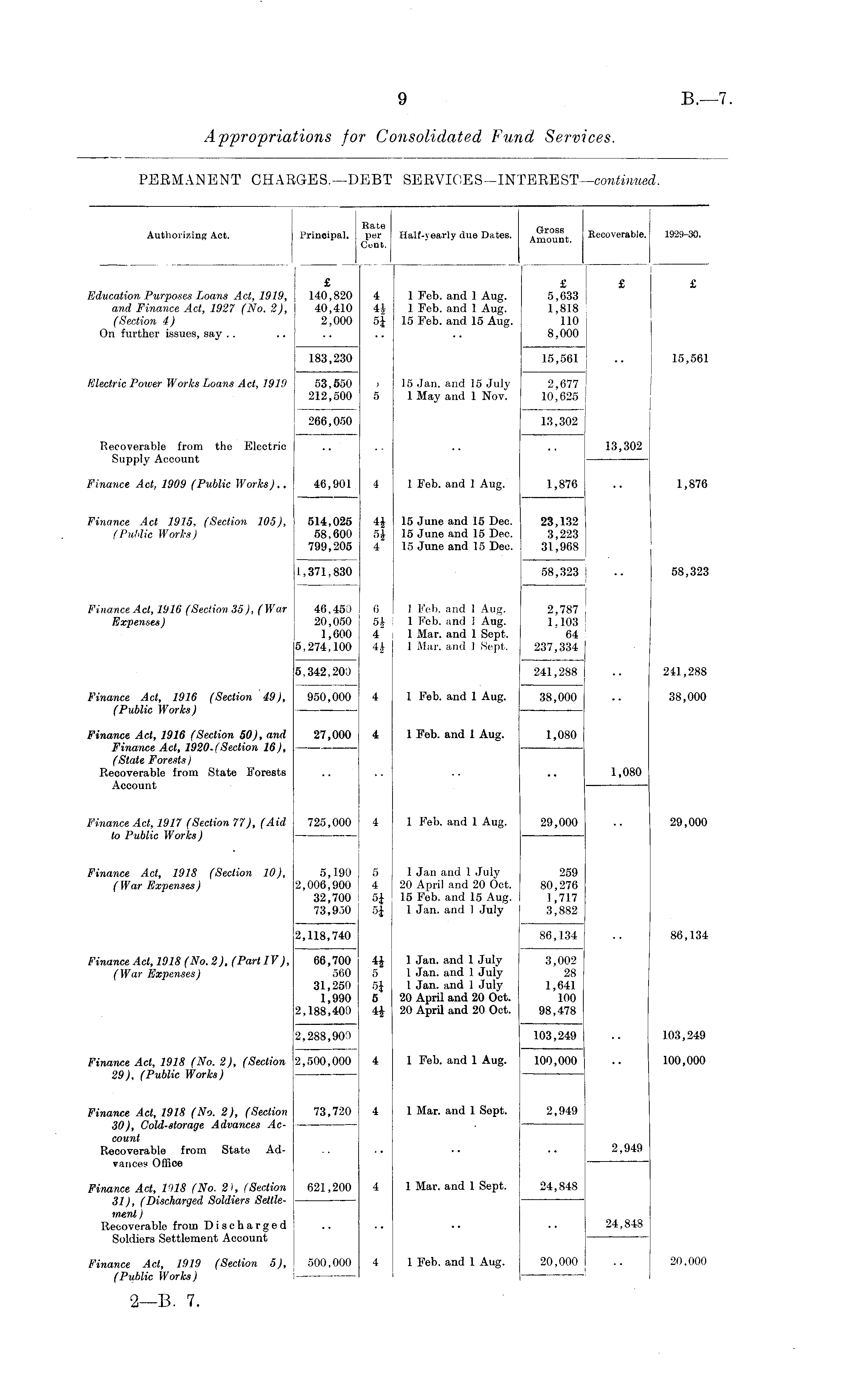 Rate fJ-rosR Authorizing Act. Principal. per Half-yearly due Dates. Amount Recoverable. 1929-30. C«nt. , J £ £ £ £ Education Purposes Loans Act, 1919, 140,820 4 1 Feb. and 1 Aug. 5,633 and Finance Act, 1927 (No. 2), 40,410 4J 1 Feb. and 1 Aug. 1,818 (Section 4) 2,000 5J 15 Feb. and 15 Aug. 110 On further issues, say .. .. .. .. .. 8,000 183,230 15,561 .. 15,561 Electric Power Works Loans Act, 1919 53,550 > 15 Jan. and 15 July 2,677 212,500 5 1 May and 1 Nov. 10,625 266,050 13,302 Recoverable from the Electric .. .. .. .. 13,302 Supply Account Finance Act, 1909 (Public Works).. 46,901 4 1 Feb. and 1 Aug. 1,876 .. 1,876 Finance Act 1915, (Section 105), 514,025 4J 15 June and 15 Dec. 23,132 (Public Works) 58.600 5£ 15 June and 15 Dec. 3,223 799,205 4 15 June and 15 Dec. 31,968 1,371,830 58,323 j .. 58,323 Finance Act, 1916 (Section 35), (War 46,450 6 1 Feb. and 1 Aug. 2,787 : Expenses) 20,050 5J 1 Feb. and i Aug. 1,103 1,600 4 i 1 Mar. and 1 Sept. 64 5,274,100 4| 1 Mar. and ] Sept. 237,334 5,342,200 241,288 .. 241,288 Finance Act, 1916 (Section 49), 950,000 4 1 Feb. and 1 Aug. 38,000 .. 38,000 (Public Works) —— — Finance Act, 1916 (Section 50), and 27,000 4 1 Feb. and 1 Aug. 1,080 Finance Act, 1920 (Section 16), (State Forests) Recoverable from State Forests .. .. .. .. 1,080 Account Finance Act, 1917 (Section 77), (Aid 725,000 4 1 Feb. and 1 Aug. 29,000 .. 29,000 to Public Works) Finance Act, 1918 (Section 10), 5,190 5 1 Jan and 1 July 259 (War Expenses) 2,006,900 4 20 April and 20 Oct. 80,276 32,700 5J 15 Feb. and 15 Aug. 1,717 73,950 5J 1 Jan. and 1 July 3,882 2,118,740 86,134 .. 86,134 Finance Act, 1918 (No. 2). (Part IV), 66,700 4J 1 Jan. and 1 July 3,002 (War Expenses) 560 5 1 Jan. and 1 July 28 31,250 51 I Jan. and 1 July 1,641 1,990 5 20 April and 20 Oct. 100 2,188,400 4£ 20 April and 20 Oct. 98,478 2,288,900 103,249 .. 103,249 Finance Act, 1918 (No. 2), (Section 2,500,000 4 1 Feb. and 1 Aug. 100,000 .. 100,000 29), (Public Works) — Finance Act, 1918 (No. 2), (Section 73,720 4 1 Mar. and 1 Sept. 2,949 30), Gold-storage Advances Ac- — count Recoverable from State Ad- .. .. • ■ .. 2,949 varices Office Finance Act, l')18 (No. 2), (Section 621,200 4 1 Mar. and 1 Sept. 24,848 31), ( Discharged Soldiers Settle- — menl) Recoverable from D i s c h a r g e d .. .. .. .. 24,848 Soldiers Settlement Account — Finance Act, 1919 (Section 5), 500,000 4 1 Feb. and 1 Aug. 20,000 .. 20,000 (Public Works)