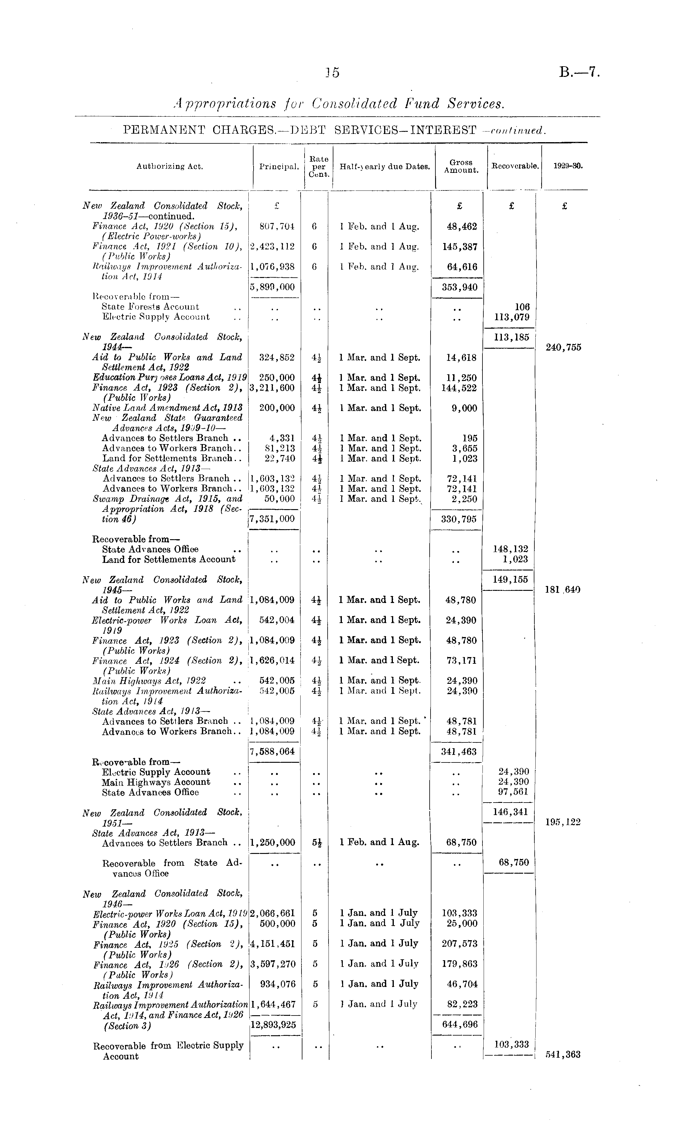- Kate Authorizing Act. Principal, per Half-j early due Dates. Amount Recoverable. 1929-30. Cent. New Zealand Consolidated Stock, £ £ £ £ 1936-51—continued. Finance Act, 1920 (Section 15), 807,704 6 1 Feb. and 1 Aug. 48,462 (Electric Power-works) Finance Act, 1921 (Section 10), "2,423,112 6 1 Feb. and 1 Aug. 145,387 ( Public Works) Raihvays Improvement Authoriza- 1,076,938 0 1 Feb. and 1 Aug. 64,616 tion Act, 1914 5,899,000 353,940 Recoverable from —- — State Forests Account .. .. .. .. .. 106 Electric Supply Account .. .. .. .. .. 113,079 New Zealand Consolidated Stock, 113,185 1944— 240,755 Aid to Public Works and Land 324,852 4| 1 Mar. and 1 Sept. 14,618 Settlement Act, 1922 Education Pur] oses Loans Act, 1919 250,000 4 | 1 Mar. and 1 Sept. 11,250 Finance Act, 1923 (Section 2), 3,211,600 4| 1 Mar. and 1 Sept. 144,522 (Public Works) Native Land Amendment Act, 1913 200,000 4J 1 Mar. and 1 Sept. 9,000 New Zealand State Guaranteed Advances Acts, 19<j9-10—-Advances to Settlers Branch .. 4,331 4i 1 Mar. and 1 Sept. 195 Advanoes to Workers Branch.. 81,213 41 1 Mar. and 1 Sept. 3,655 Land for Settlements Branch.. 22,740 1 Mar. and 1 Sept. 1,023 State Advances Act, 1913 — Advanoes to Settlers Branch .. 1,603,132 4| 1 Mar. and 1 Sept. 72,141 Advances to Workers Branch.. 1,603,132 4A 1 Mar. and 1 Sept. 72,141 Swamp Drainage Act, 1915, and 50,000 4| 1 Mar. and 1 Sept. 2,250 Appropriation Act, 1918 (Section 46) 7,351,000 330,795 Recoverable from— State Advances Offioe .. .. .. .. .. 148,132 Land for Settlements Account .. .. .. .. 1,023 New Zealand Consolidated Stock, 149,155 1945— 181 ,640 Aid to Public Works and Land 1,084,009 4J 1 Mar. and 1 Sept. 48,780 Settlement Act, 1922 Electric-power Works Loan Act, 542,004 44 1 Mar. and 1 Sept. 24,390 1919 Finance Act, 1923 (Section 2), 1,084,009 4| 1 Mar. and 1 Sept. 48,780 (Public Works) Finance Act, 1924 (Section 2), 1,626,014 4J 1 Mar. and 1 Sept. 73,171 (Public Works) Main Highways Act, 1922 .. 542,005 4-i 1 Mar. and 1 Sept. 24,390 Railways Improvement Authoriza- 542,005 4J 1 Mar. and 1 Sept. 24,390 tion Act, 1914 State Advances Act, 1913 — Advances to Settlers Branch .. 1,084,009 4J- 1 Mar. and 1 Sept. ' 48,781 Advances to Workers Branch.. 1,084,009 4J 1 Mar. and 1 Sept. 48,781 7,588,064 341,463 Recoverable from—Electric Supply Account .. .. .. .. .. 24,390 Main Highways Account .. .. .. .. .. 24,390 State Advances Office .. .. .. .. .. 97,561 New Zealand Consolidated Stock, 146,341 1951— 195,122 State Advances Act, 1913— Advanoes to Settlers Branch .. 1,250,000 5£ 1 Feb. and 1 Aug. 68,750 Recoverable from State Ad- .. .. .. .. 68,750 vances Office — New Zealand Consolidated Stock, 1946— Electric-power Works Loan Act, 1919 2,066,661 5 1 Jan. and 1 July 103,333 Finance Act, 1920 (Section 15), 500,000 5 1 Jan. and 1 July 25,000 (Public Works) Finance Act, 1925 (Section 2), 4,151,451 5 1 Jan. and 1 July 207,573 (Public Works) Finance Act, 1926 (Section 2), 3,597,270 5 1 Jan. and 1 July 179,863 (Public Works) Railways Improvement Authoriza- 934,076 5 1 Jan. and 1 July 46,704 tion Act, 1914 Railways Improvement Authorization 1,644,467 5 ] Jan. and 1 July 82,223 Act, 1914, and Finance Act, 1926 — (Section 3) 12,893,925 644,696 Recoverable from Eleotric Supply .. .. .. . ■ 103,333 Account i 541,363