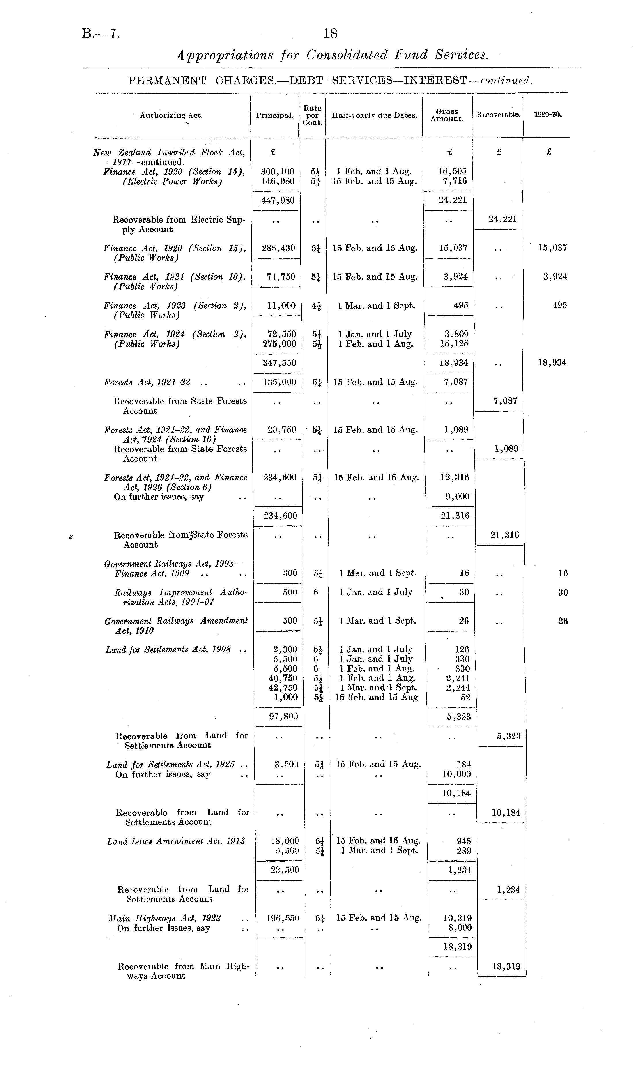 Rate Prnss Authorizing Act. Principal. per Half-\ early due Dates. A^,^„ r ,+ Recoverable. 1929-30. Cent. " Amount. I New Zealand Inscribed Stock Act, £ £ £ £ 1917 —continued. Finance Act, 1920 (Section 15), 300,100 5J 1 Feb. and 1 Aug. 16,505 (Electric Power Works) 146,980 5J 15 Feb. and 15 Aug. 7,716 447,080 24,221 Recoverable from Electric Sup- .. .. .. .. 24,221 ply Account Finance Act, 1920 (Section 15), 286,430 5J 15 Feb. and 15 Aug. 15,037 .. 15,037 (Public Works) — Finance Act, 1921 (Section 10), 74,750 5| 15 Feb. and 15 Aug. 3,924 .. 3,924 (Public Works) — Finance Act, 1923 (Section 2), 11,000 4-| 1 Mar. and 1 Sept. 495 .. 495 (Public Works) — Finance Act, 1924 (Section 2), 72,550 5J 1 Jan. and 1 July 3,809 (Public Works) 275,000 5J 1 Feb. and 1 Aug. 15,125 347,550 18,934 .. 18,934 Forests Act, 1921-22 .. .. 135,000 5| 15 Feb. and 15 Aug. 7,087 Recoverable from State Forests .. .. .. .. 7,087 Account Forests Act, 1921-22, and Finance 20,750 5J 15 Feb. and 15 Aug. 1,089 Act, 1924 (Section 16) — Recoverable from State Forests .. .. .. .. 1,089 Account Forests Act, 1921-22, and Finance 234,600 5J 15 Feb. and 15 Aug. 12,316 Act, 1926 (Section 6) On further issues, say .. .. .. .. 9,000 234,600 21,316 t Recoverable from]State Forests .. .. .. .. 21,316 Account Government Railways Act, 190S — Finance Act, 1909 .. .. 300 5J 1 Mar. and I Sept. 16 16 Railways Improvement Autho- 500 6 1 Jan. and 1 July 30 30 rization Acts, 1901-07 Government Railways Amendment 500 5J 1 Mar. and 1 Sept. 26 26 Act, 1910 Land for Settlements Act, 1908 .. 2,300 5J 1 Jan. and 1 July 126 5,500 6 1 Jan. and 1 July 330 5,500 6 1 Feb. and 1 Aug. 330 40,750 5J 1 Feb. and 1 Aug. 2,241 42,750 u| 1 Mar. and 1 Sept. 2,244 1,000 5J 15 Feb. and 15 Aug 52 97,800 5,323 Recoverable from Land for .. .. .. .. 5,323 Settlements Account Land for Settlements Act, 1925 .. 3,50) 5J 15 Feb. and 15 Aug. 184 On further issues, say .. .. .. .. 10,000 10,184 Recoverable from Land for .. .. .. 10,184 Settlements Account Land Laws Amendment Act, 1913 18,000 5[ 15 Feb. and 15 Aug. 945 5,500 5J 1 Mar. and 1 Sept. 289 23,500 1,234 Recoverable from Land foi .. .. .. ., 1,234 Settlements Aocount — Main Highways Act, 1922 .. 196,550 5£ 15 Feb. and 15 Aug. 10,319 On further issues, say .. .. .. .. 8,000 18,319 Recoveiable from Mam High- .. .. .. .. 18,319 ways Account —