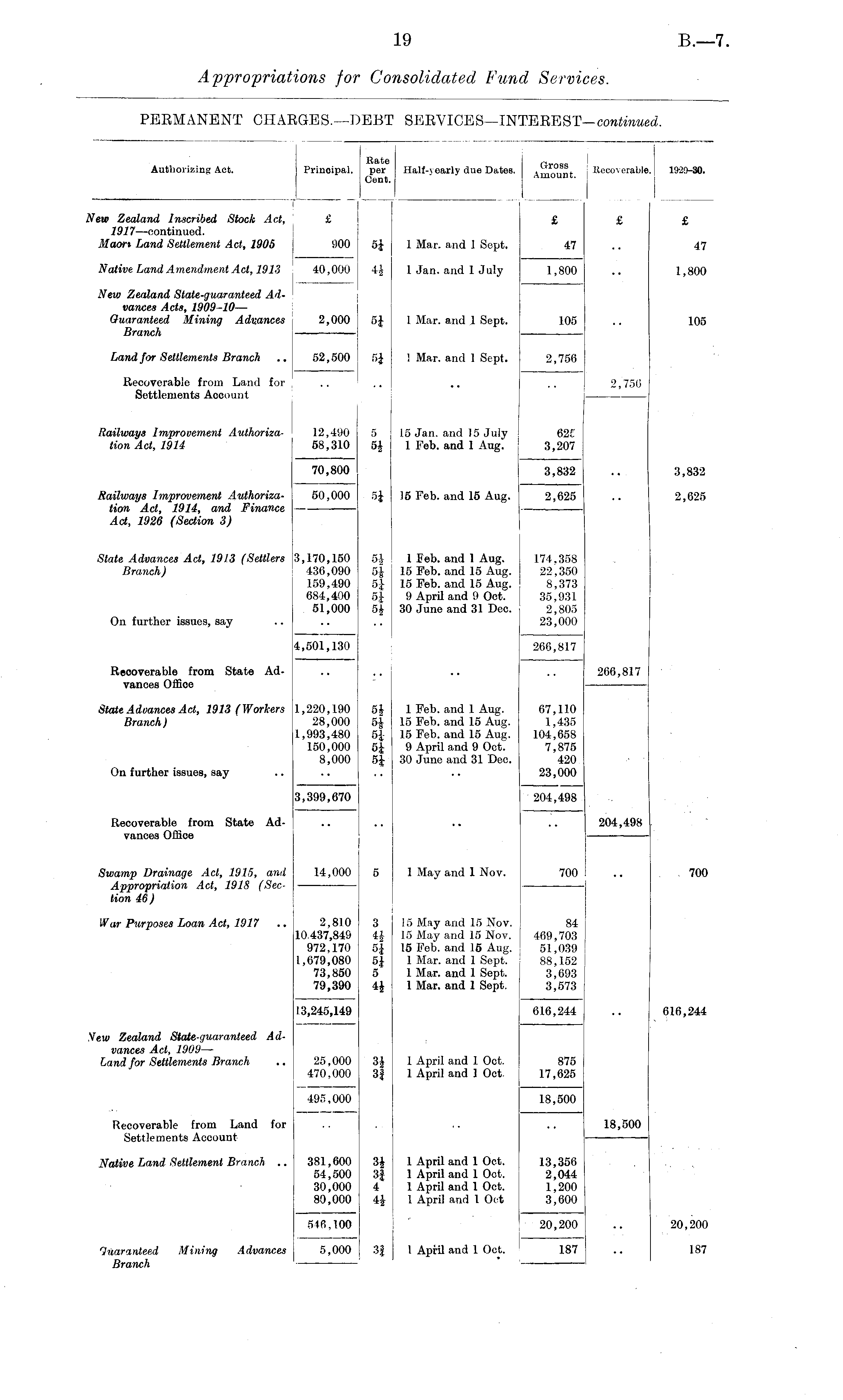 Kate p Authorizing Act. Principal. per Half-yearly due Dates. t Recoverable. 19-29-30. Cent. amount. New Zealand Inscribed Stock Act, £ £ £ £ 1917—continued. Maori Land Settlement Act, 1905 900 5J 1 Mar. and 1 Sept. 47 47 Native Land Amendment Act, 1913 40,000 4J 1 Jan. and 1 July 1,800 .. 1,800 New Zealand State-guaranteed Advances Acts, 1909 10— Guaranteed Mining Advances 2,000 5J I Mar. and .1 Sept. 105 .. 105 Branch Land for Settlements Branch .. 52,500 5J ! Mar. and 1 Sept. 2,756 Recoverable from Land for .. .. .. .. 2,750 Settlements Account Railways Improvement Authoriza- 12,490 5 15 Jan. and 15 July 62E lion Act, 1914 58,310 5| 1 Feb. and 1 Aug. 3,207 70,800 3,832 .., 3,832 Railways Improvement Authoriza- 50,000 5J 15 Feb. and 15 Aug. 2,625 .. 2,625 tion Act, 1914, and Finance Act, 1926 (Section 3) State Advances Act, 1913 (Settlers 3,170,150 5| 1 Feb. and 1 Aug. 174,358 Branch) 436,090 5J 15 Feb. and 15 Aug. 22,350 159,490 5J 15 Feb. and 15 Aug. 8,373 684,400 5J 9 April and 9 Oct. 35,931 51,000 5J 30 June and 31 Dec. 2,805 On further issues, say .. .. .. 23,000 4,501,130 266,817 Recoverable from State Ad- .. .. .. .. 266,817 vances Office State Advances Act, 1913 (Workers 1,220,190 5h 1 Feb. and 1 Aug. 67,110 Branch) 28,000 5J 15 Feb. and 15 Aug. 1,435 1,993,480 5{- 15 Feb. and 15 Aug. 104,658 150,000 5i 9 April and 9 Oct. 7,875 8,000 5J 30 June and 31 Dec. 420 On further issues, say .. .. .. .. 23,000 3,399,670 204,498 Recoverable from State Ad- .. .. .. .. 204,498 vances Oflioe Swamp Drainage Act, 1915, and 14,000 5 1 May and 1 Nov. 700 .. 700 Appropriation Act, 1918 (Section 46 ) War Purposes Loan Act, 1917 .. 2,810 3 15 May and 15 Nov. 84 10.437,849 4| 15 May and 15 Nov. 469,703 972,170 5i 15 Feb. and 15 Aug. 51,039 1,679,080 5J 1 Mar. and 1 Sept. 88,152 73,850 5 1 Mar. and 1 Sept. 3,693 79,390 44 1 Mar. and 1 Sept. 3,573 13,245,149 616,244 .. 616,244 Neu> Zealand State-guaranteed Advances Act, 1909 —- Land for Settlements Branch .. 25,000 3| 1 April and 1 Oct. 875 470,000 3§ 1 April and 1 Oct. 17,625 495,000 18,500 Recoverable from Land for .. .. 18,500 Settlements Account —— — Native Land Settlement Branch .. 381,600 3J 1 April and 1 Oct. 13,356 54,500 3§ 1 April and 1 Oct. 2,044 30,000 4 1 April and 1 Oct. 1,200 80,000 44 1 April and 1 Oct 3,600 546,100 20,200 .. 20,200 I 9uaranteed Mining Advances 5,000 3| 1 April and 1 Oct. 187 .. 187 Branch —————'