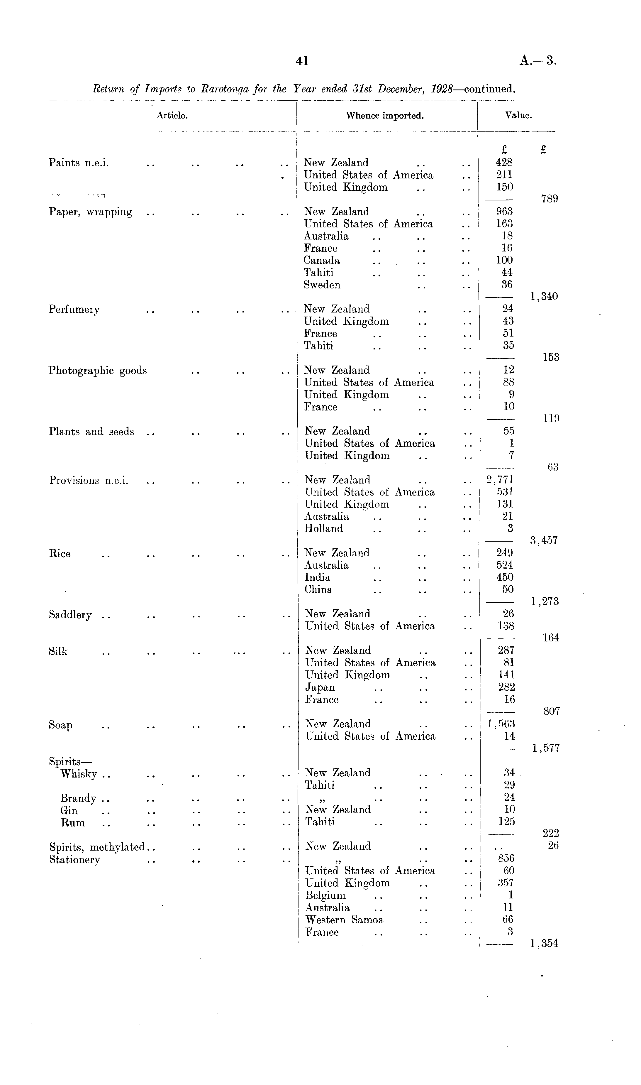 Article. Whence imported. Value. £ £ Paints n.e.i. .. .. .. .. j New Zealand .. .. 428 United States of America .. 211 United Kingdom .. .. 150 — i 789 Paper, wrapping .. .. .. New Zealand .. .. 963 United States of America .. 163 Australia .. .. .. 18 France .. .. .. 16 Canada .. .. .. 100 Tahiti .. .. .. ' 44 Sweden .. .. i 36 | 1,340 Perfumery .. .. .. .. New Zealand .. .. 24 United Kingdom .. .. 43 France .. .. .. 51 Tahiti .. .. .. 35 153 Photographic goods .. .. New Zealand .. .. 12 United States of America .. 88 United Kingdom .. .. 1 9 France .. .. .. I 10 | 119 Plants and seeds .. .. .. .. New Zealand .. .. 55 United States of America .. 1 United Kingdom .. .. 1 7 ! 63 Provisions n.e.i. .. .. .. .. New Zealand .. .. 2,771 United States of America .. 531 United Kingdom .. .. 131 Australia .. .. .. 21 Holland .. .. .. 3 — 3,457 Rice .. .. .. .. .. New Zealand .. .. 249 Australia .. .. .. 524 India .. .. .. 450 China .. .. .. 50 —— 1,273 Saddlery .. .. .. .. .. New Zealand .. .. 26 United States of America .. 138 164 Silk .. .. .. ... .. New Zealand .. .. 287 United States of America .. 81 United Kingdom .. .. j 141 Japan .. .. .. 282 France .. .. .. 16 807 Soap .. .. .. .. .. New Zealand .. .. 1,563 United States of America .. J 14 1,577 Spirits—Whisky .. .. .. .. . • New Zealand I 34 Tahiti .. .. .. 29 Brandy .. .. .. .. .. ,, .. .. .. | 24 Gin .. .. .. . ■ • ■ New Zealand .. .. j 10 Rum .. .. .. • • • • Tahiti .. .. .. 125 222 Spirits, methylated.. .. .. .. New Zealand .. .. .. 26 Stationery .. .. ■ ■ • • ,, • • • • 856 United States of America .. 60 United Kingdom .. .. 357 Belgium .. .. . . 1 Australia .. .. . . 11 Western Samoa .. .. j 66 France .. .. .. 3 i 1,354