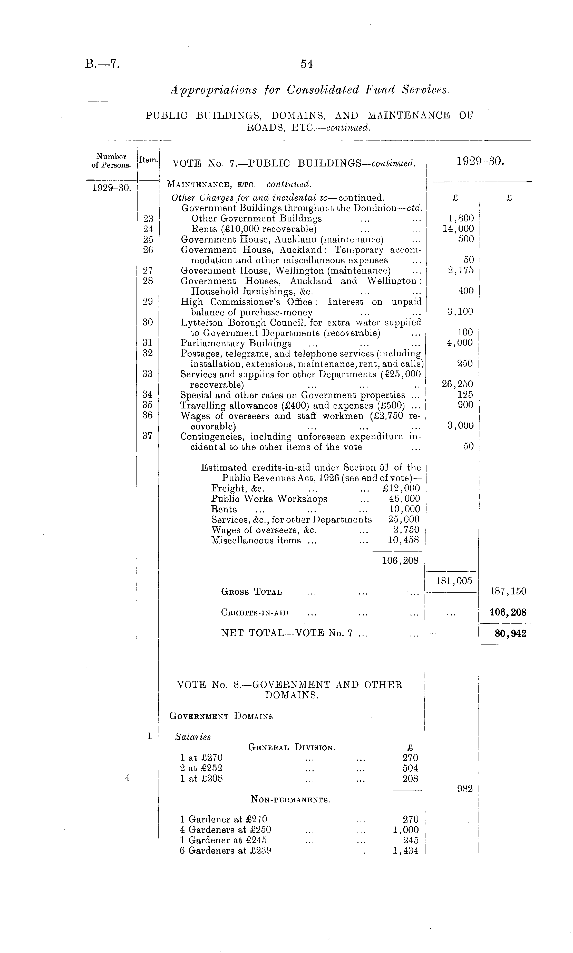 I of*Persons. Item> VOTE No. 7.—PUBLIC BUILDINGS—continued. 1929-30. 1929-30 ' Maintenance, etc. —continued. Other Charges for and incidental 10 —continued. £ £ Government Buildings throughout the Dominion —ctd. 23 Other Government Buildings ... ... 1,800 24 Bents (£10,000 recoverable) ... 14,000 25 Government House, Auckland (maintenance) ... 500 26 Government House, Auckland : Temporary accommodation and other miscellaneous expenses ... 50 27 Government House, Wellington (maintenance) ... 2,175 28 Government Houses, Auckland and Wellington : Household furnishings, &c. ... ... 400 29 High Commissioner's Office : Interest on unpaid balance of purchase-money ... ... 3,100 30 Lyttelton Borough Council, for extra water supplied to Government Departments (recoverable) ... 100 31 Parliamentary Buildings ... ... ... 4,000 32 Postages, telegrams, and telephone services (including installation, extensions, maintenance, rent, and calls) 250 33 Services and supplies for other Departments (£25,000 recoverable) ... ... ... 26,250 34 Special and other rates on Government properties ... ! 125 35 Travelling allowances (£400) and expenses (£500) ... i 900 36 Wages of overseers and staff workmen (£2,750 re- ; coverable) ... ... ... 3,000 37 Contingencies, including unforeseen expenditure in- j cidental to the other items of the vote ... I 50 Estimated credits-in-aid under Section 51 of the Public Revenues Act, 1926 (see end of vote) — Freight, &c. ... ... £12,000 j Public Works Workshops ... 46,000 Bents ... ... ... 10,000 Services, &c., for other Departments 25,000 Wages of overseers, &c. ... 2,750 Miscellaneous items ... ... 10,458 106,208 181,005 GROSS Total ... ... ... 1 — 187,150 Credith-in-AID ... ... ... i ... 106,208 NET TOTAL—VOTE No. 7 ... ... ! ! 80,942 ' VOTE No. 8.—GOVERNMENT AND OTHER DOMAINS. Government Domains — ' 1 j Salaries— General Division. £ 1 at £270 ... ... 270 2 at £252 ... ... 504 4 1 at £208 ... ... 208 — 982 Non-pekmanents. 1 Gardener at £270 . ... 270 4 Gardeners at £250 ... ... 1,000 1 Gardener at £245 ... ... 245 6 Gardeners at £239 .. 1,434